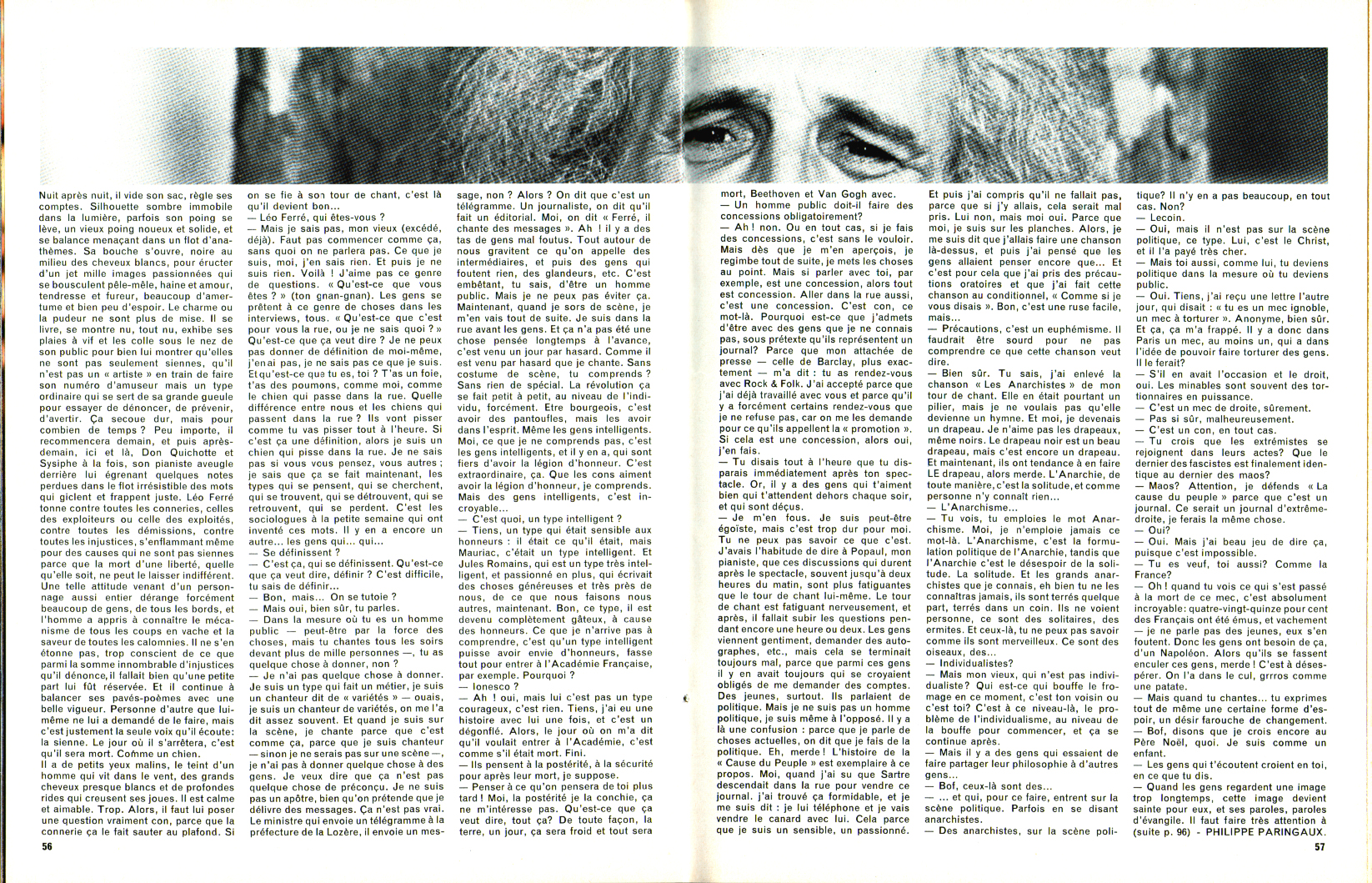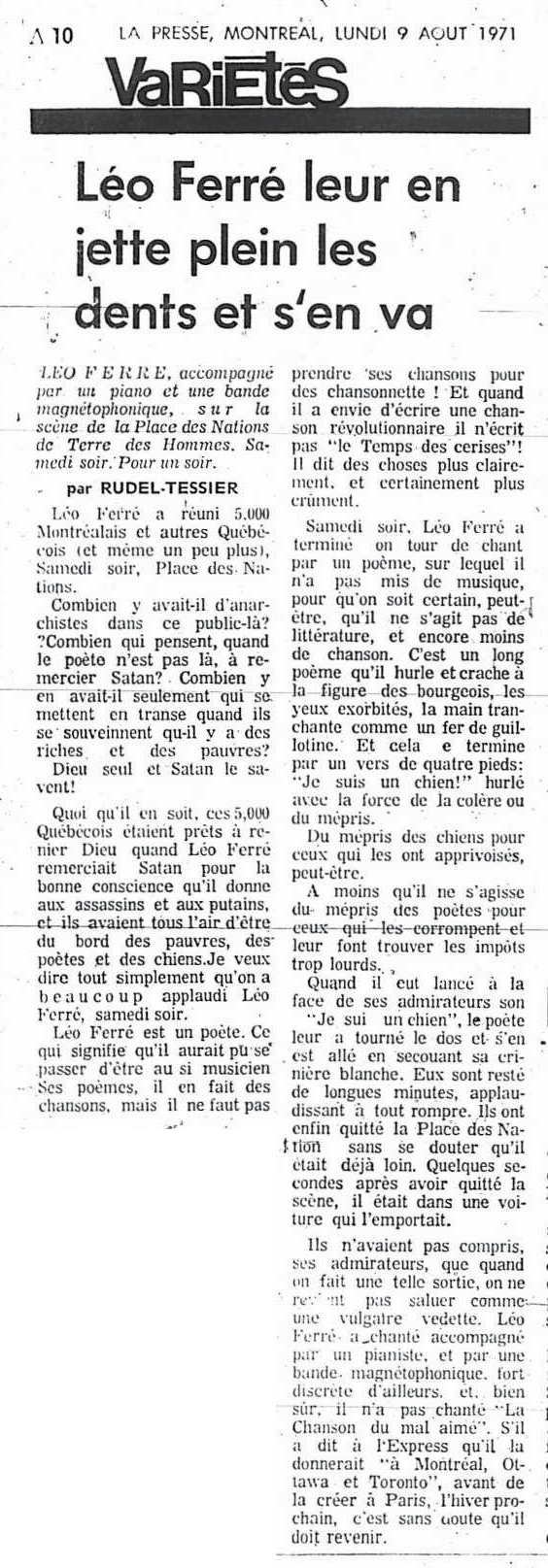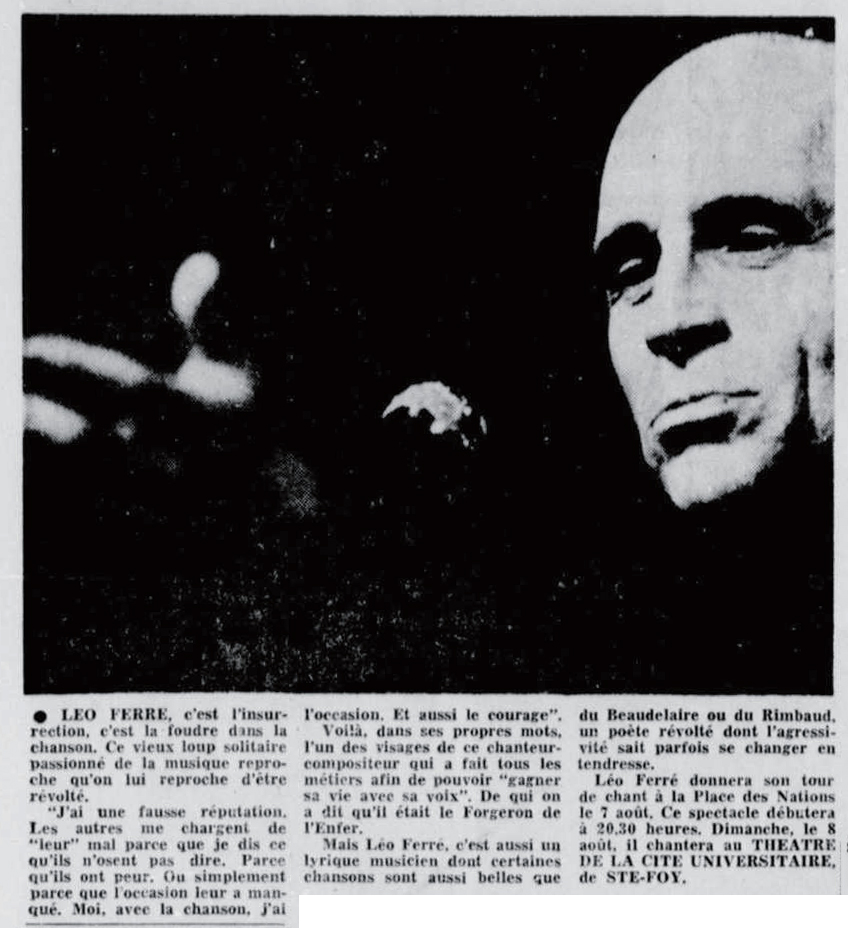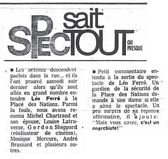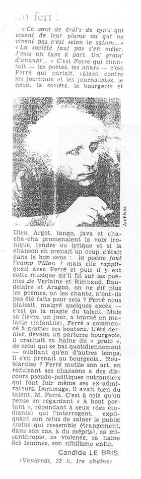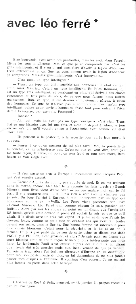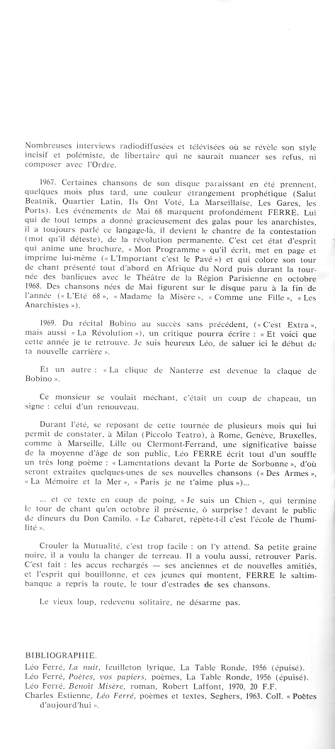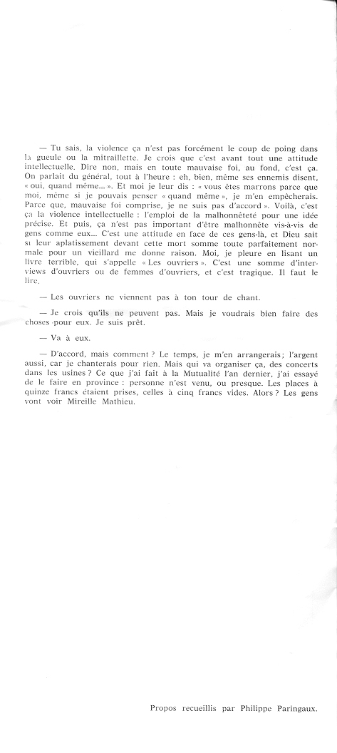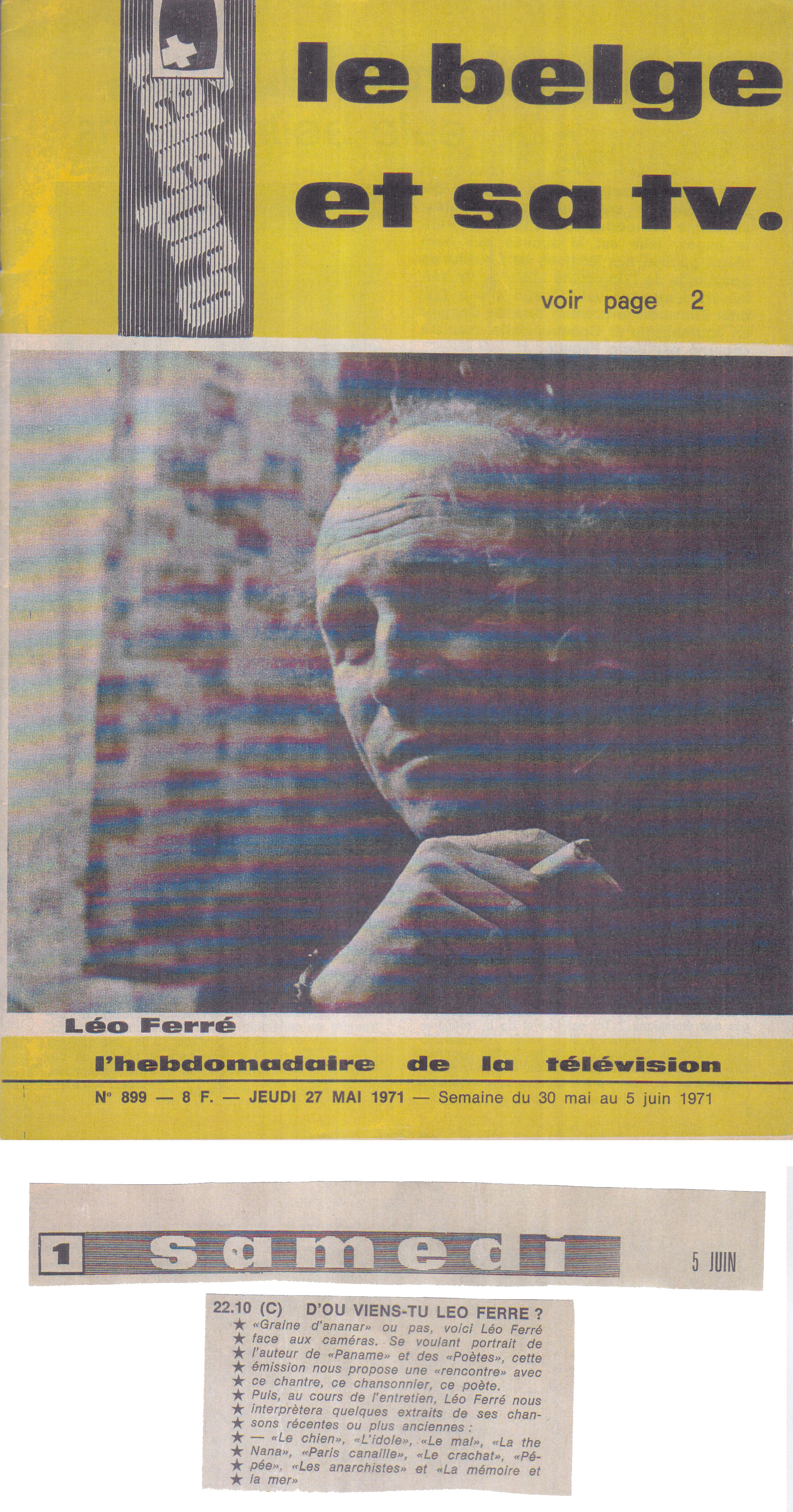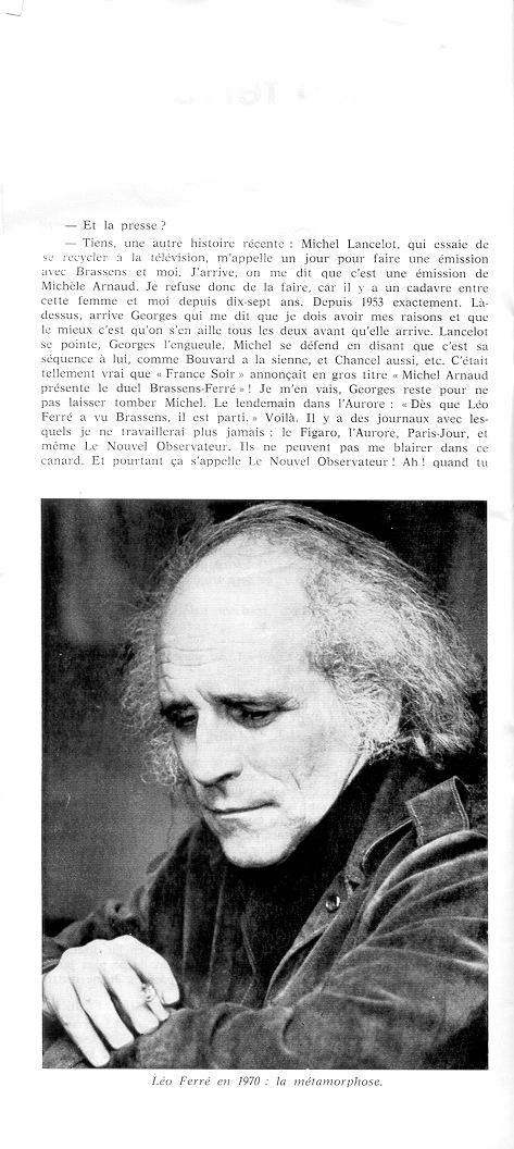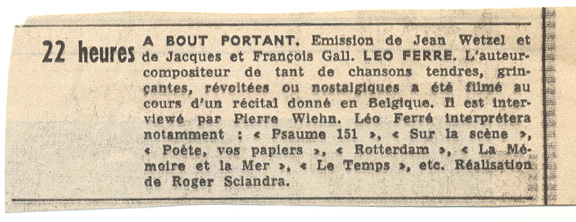- Discussion avec des belges : "je me considère comme un intellectuel de gauche... la gauche où c'est ? La gauche c'est une salle d'attente pour le fascisme... Les ouvriers vont peu au spectacle, c'est cher... on n'a pas le droit de chanter dans la rue... (quelqu'un dans l'assemblée ose dire que ça ne rapporte pas de chanter dans la rue et Ferré se met en colère), "Je ne chante pas pour gagner de l'argent... Je ne suis pas assez riche pour donner de l'argent aux ouvriers !... L'argent c'est la liberté, c'est le sourire du désespoir..."