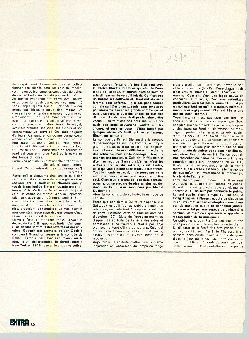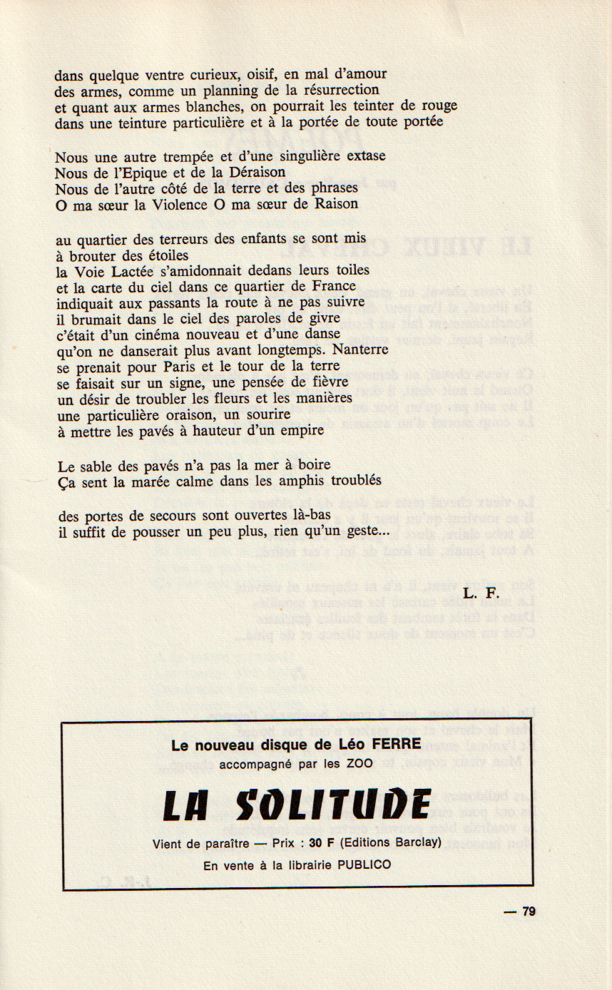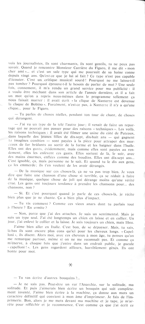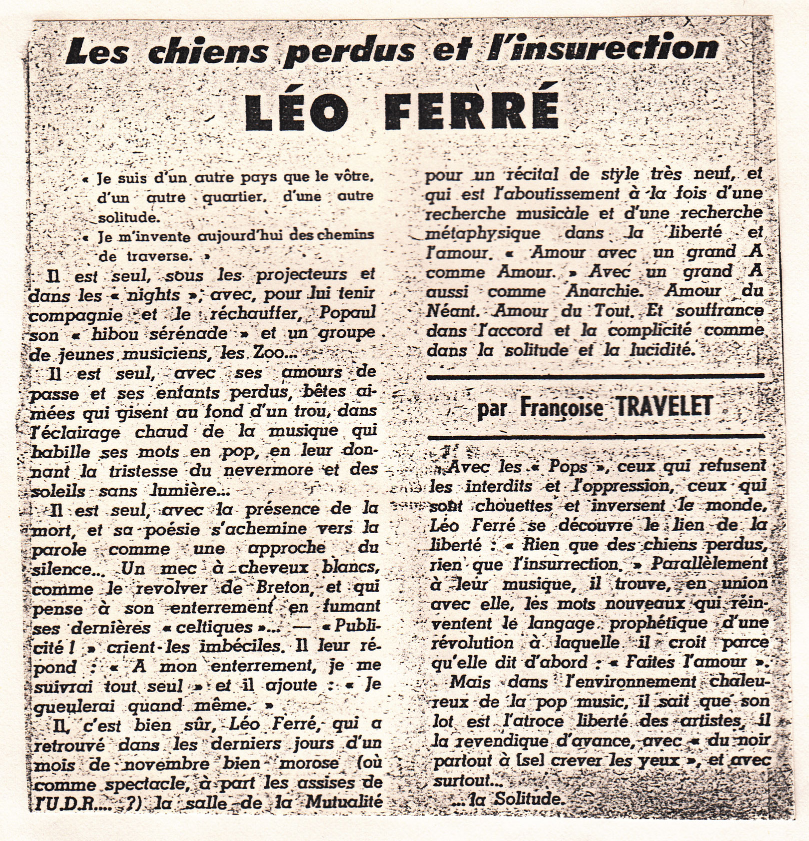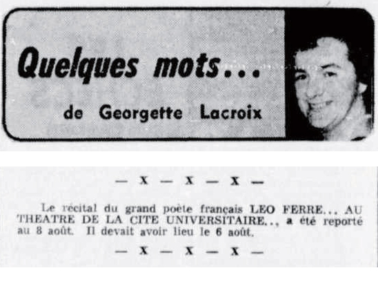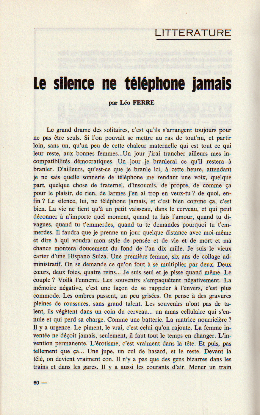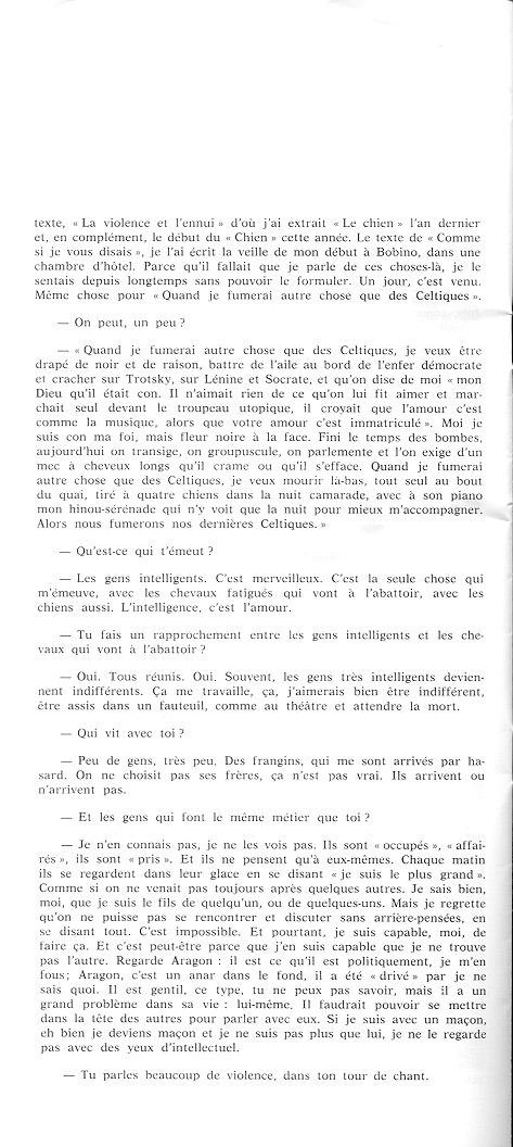 - Discussion avec des belges : "je me considère comme un intellectuel de gauche... la gauche où c'est ? La gauche c'est une salle d'attente pour le fascisme... Les ouvriers vont peu au spectacle, c'est cher... on n'a pas le droit de chanter dans la rue... (quelqu'un dans l'assemblée ose dire que ça ne rapporte pas de chanter dans la rue et Ferré se met en colère), "Je ne chante pas pour gagner de l'argent... Je ne suis pas assez riche pour donner de l'argent aux ouvriers !... L'argent c'est la liberté, c'est le sourire du désespoir..."