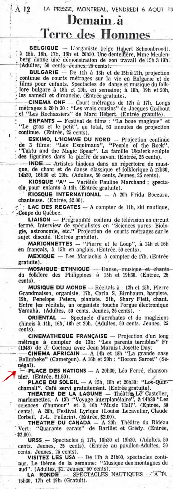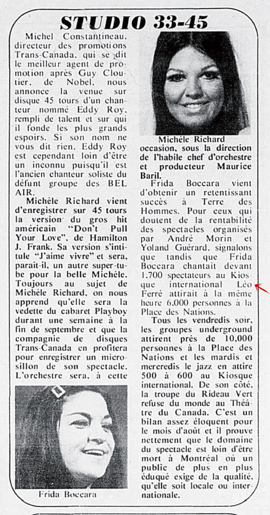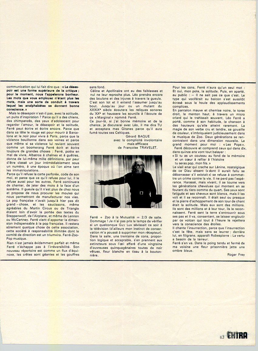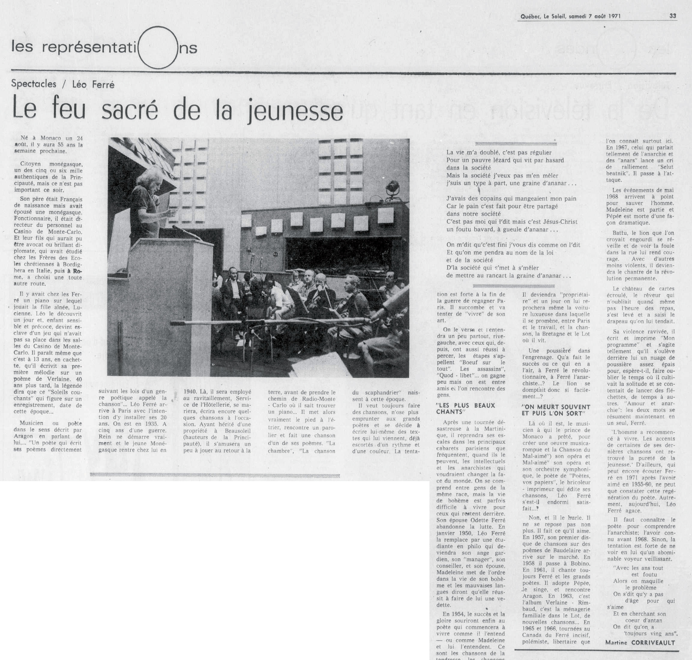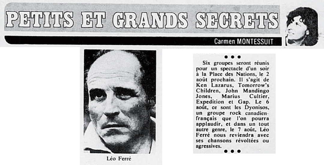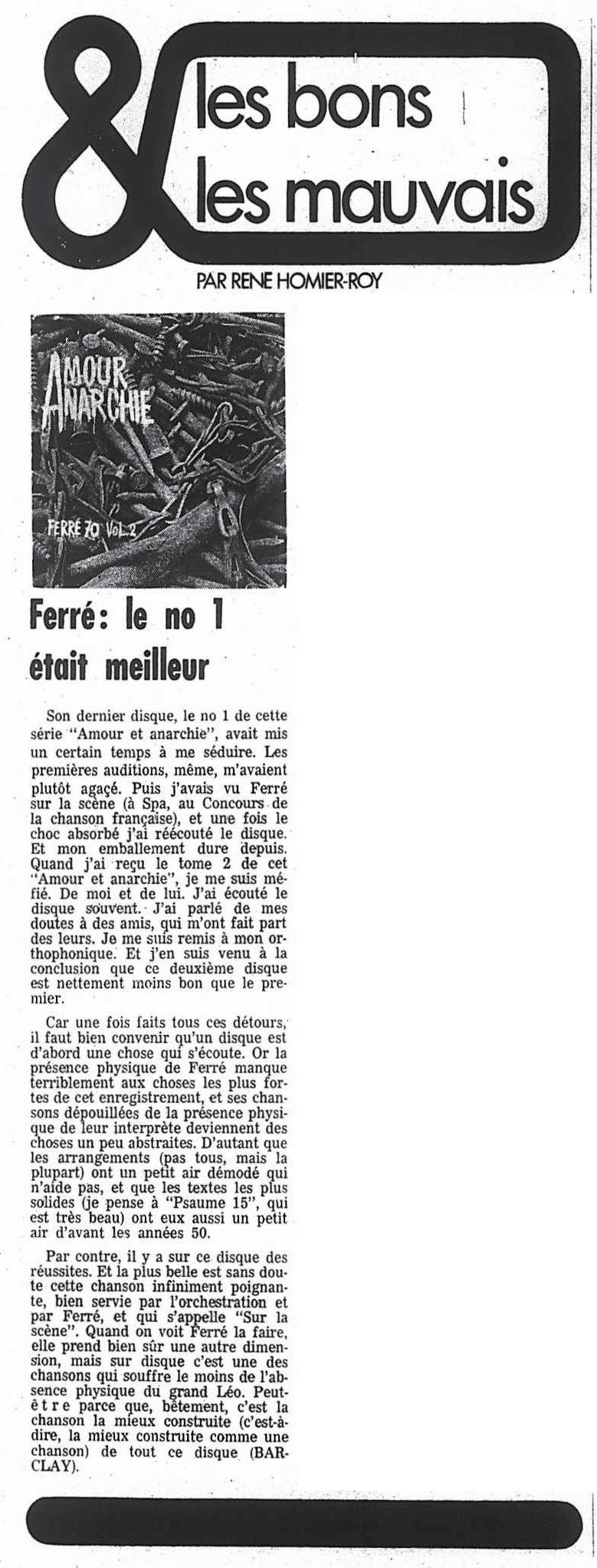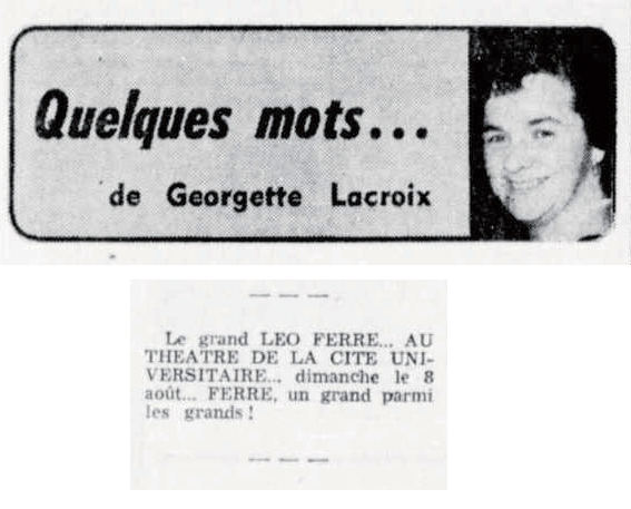 - Discussion avec des belges : "je me considère comme un intellectuel de gauche... la gauche où c'est ? La gauche c'est une salle d'attente pour le fascisme... Les ouvriers vont peu au spectacle, c'est cher... on n'a pas le droit de chanter dans la rue... (quelqu'un dans l'assemblée ose dire que ça ne rapporte pas de chanter dans la rue et Ferré se met en colère), "Je ne chante pas pour gagner de l'argent... Je ne suis pas assez riche pour donner de l'argent aux ouvriers !... L'argent c'est la liberté, c'est le sourire du désespoir..."