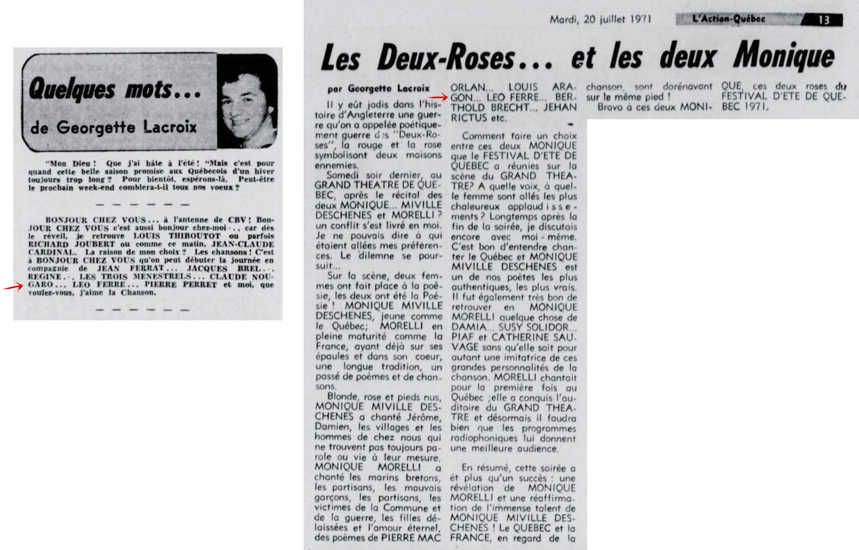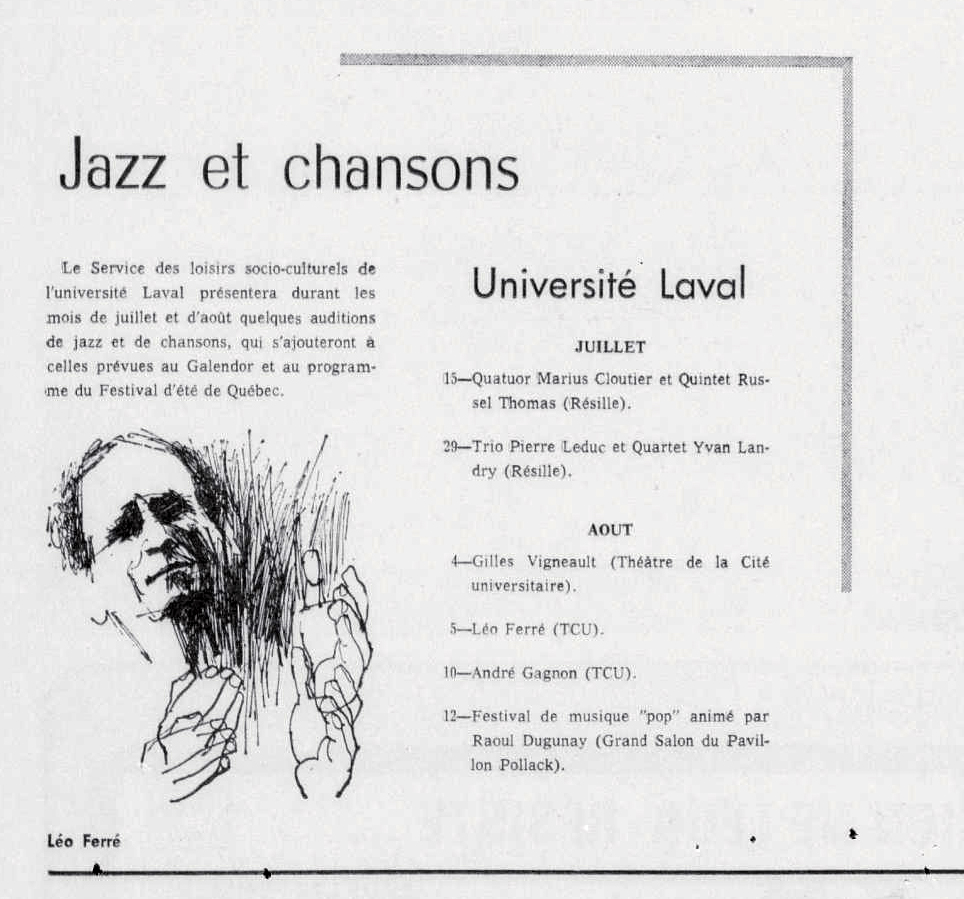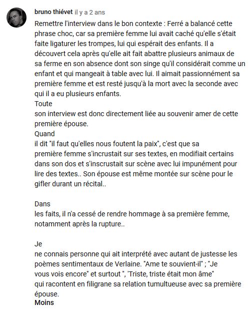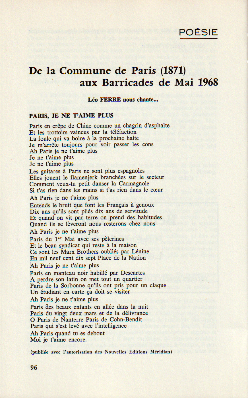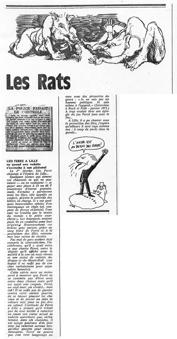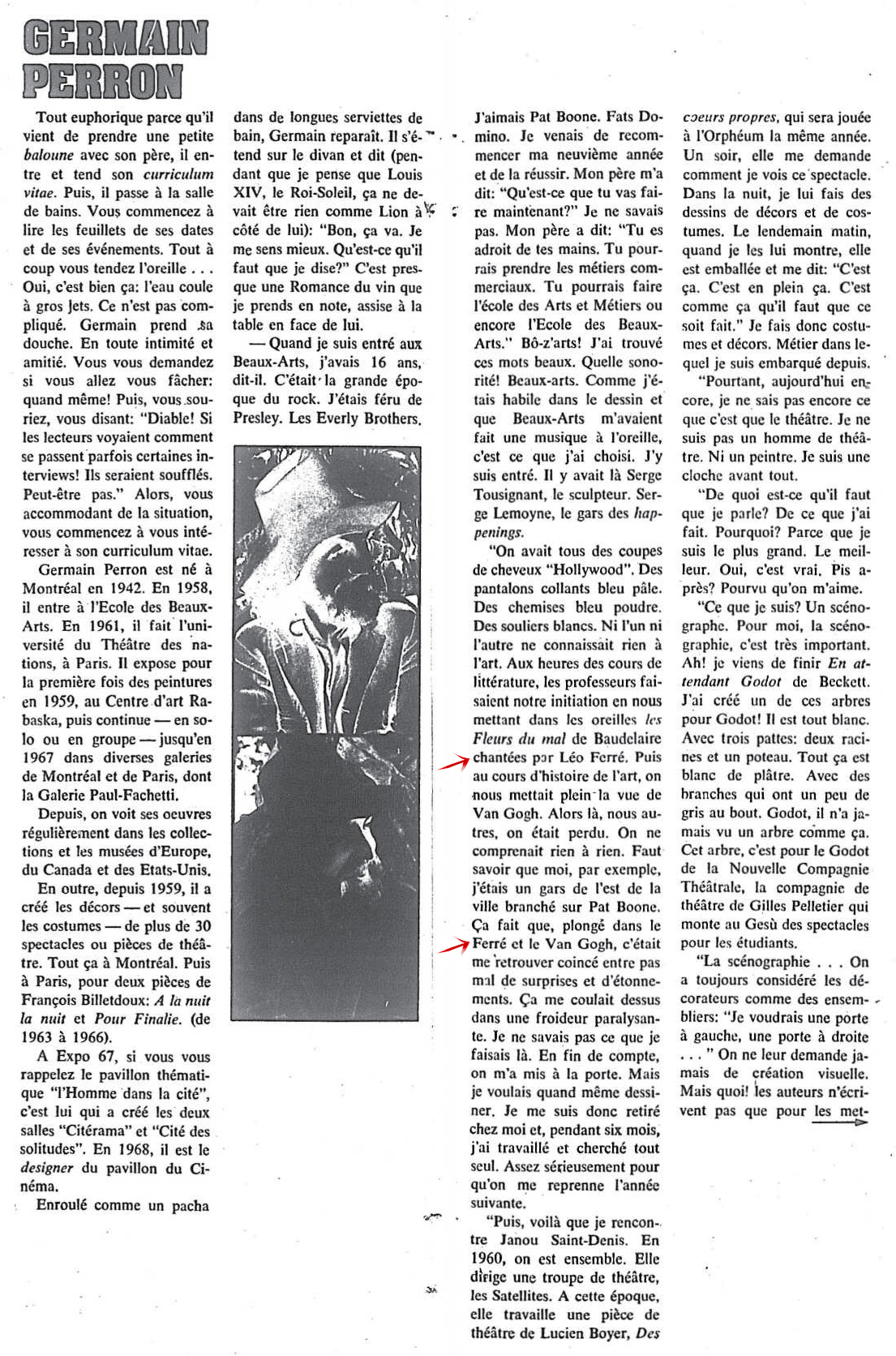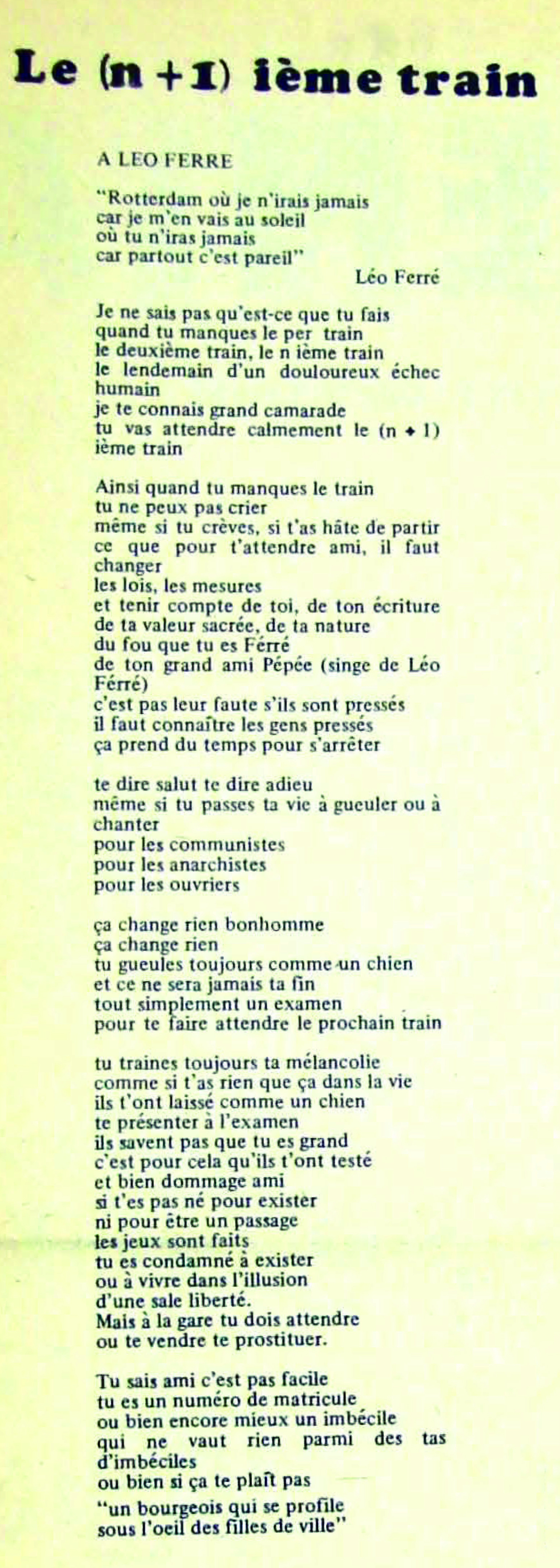 - Discussion avec des belges : "je me considère comme un intellectuel de gauche... la gauche où c'est ? La gauche c'est une salle d'attente pour le fascisme... Les ouvriers vont peu au spectacle, c'est cher... on n'a pas le droit de chanter dans la rue... (quelqu'un dans l'assemblée ose dire que ça ne rapporte pas de chanter dans la rue et Ferré se met en colère), "Je ne chante pas pour gagner de l'argent... Je ne suis pas assez riche pour donner de l'argent aux ouvriers !... L'argent c'est la liberté, c'est le sourire du désespoir..."