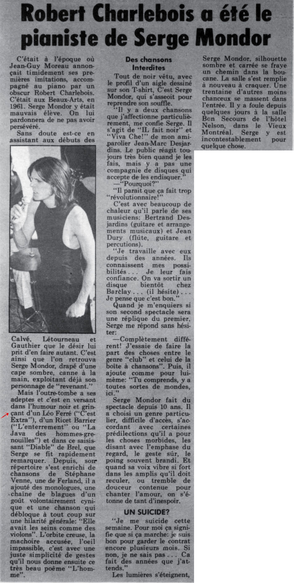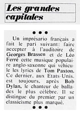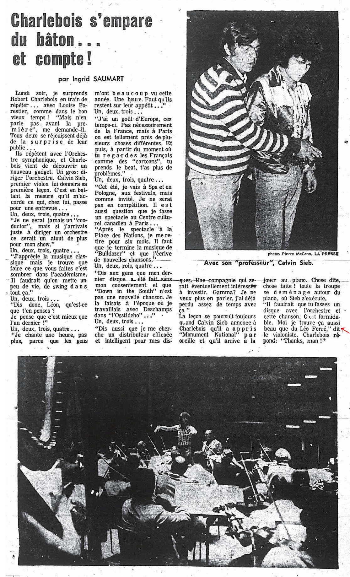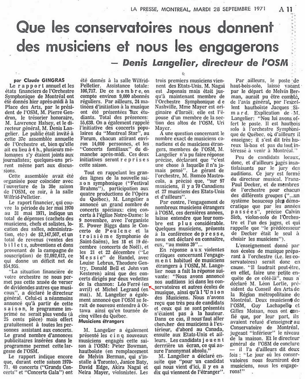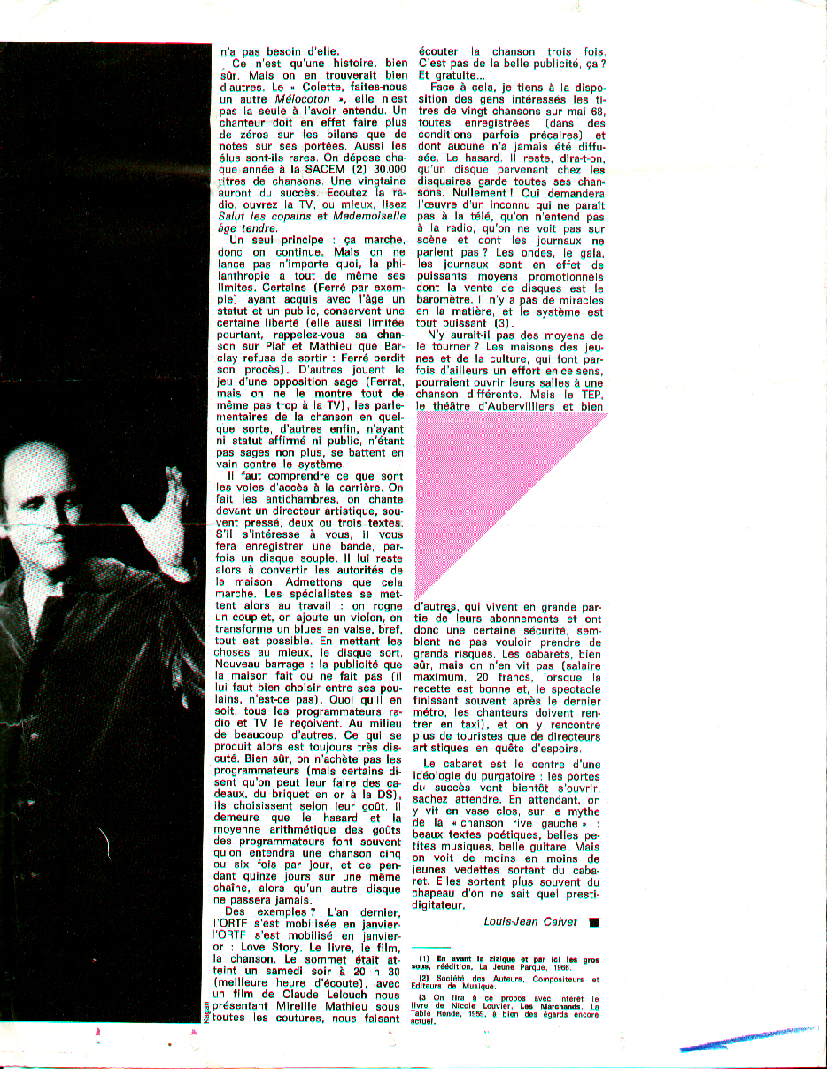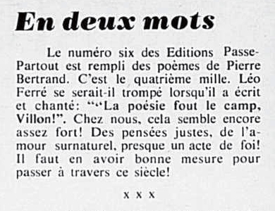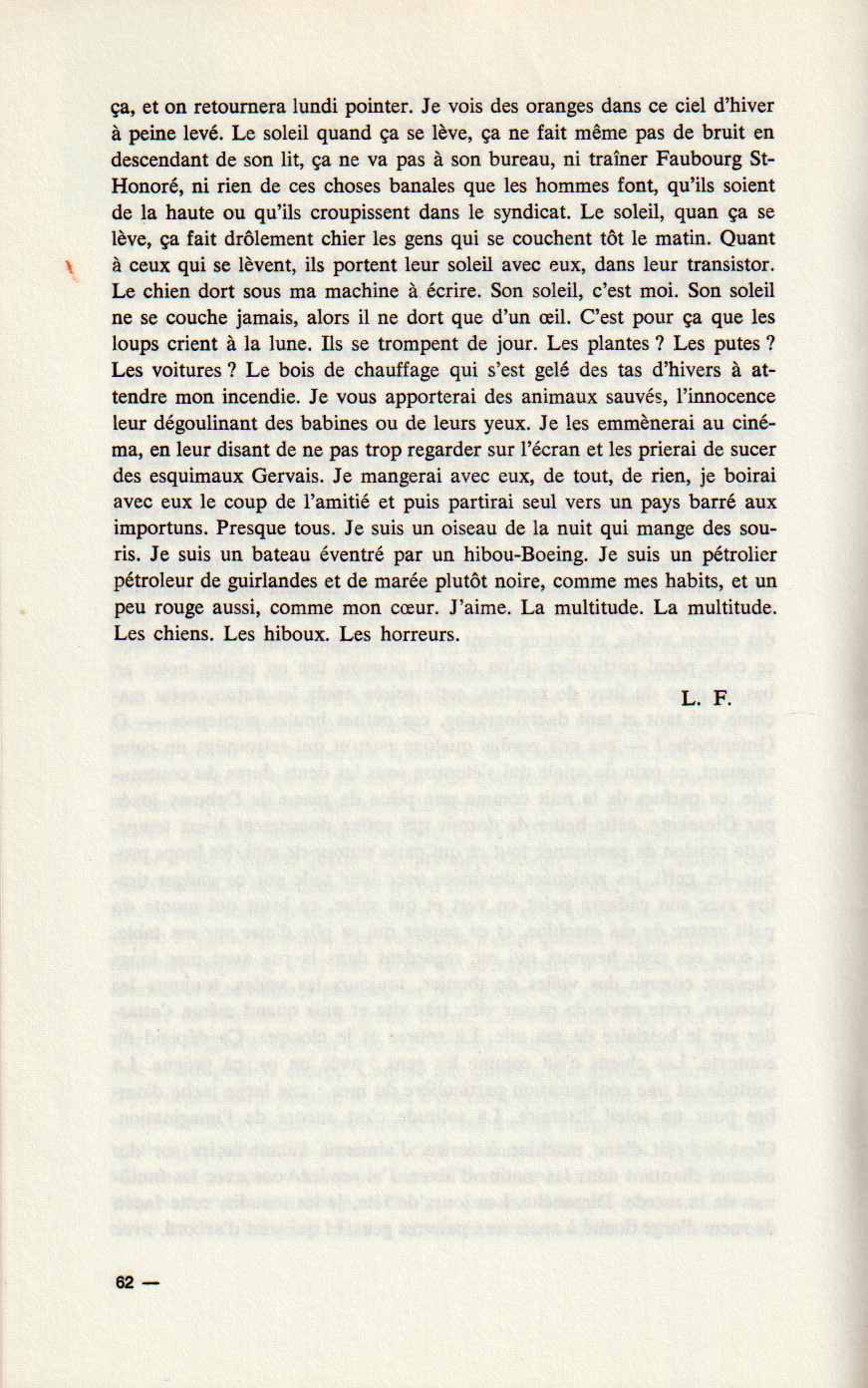 - Discussion avec des belges : "je me considère comme un intellectuel de gauche... la gauche où c'est ? La gauche c'est une salle d'attente pour le fascisme... Les ouvriers vont peu au spectacle, c'est cher... on n'a pas le droit de chanter dans la rue... (quelqu'un dans l'assemblée ose dire que ça ne rapporte pas de chanter dans la rue et Ferré se met en colère), "Je ne chante pas pour gagner de l'argent... Je ne suis pas assez riche pour donner de l'argent aux ouvriers !... L'argent c'est la liberté, c'est le sourire du désespoir..."