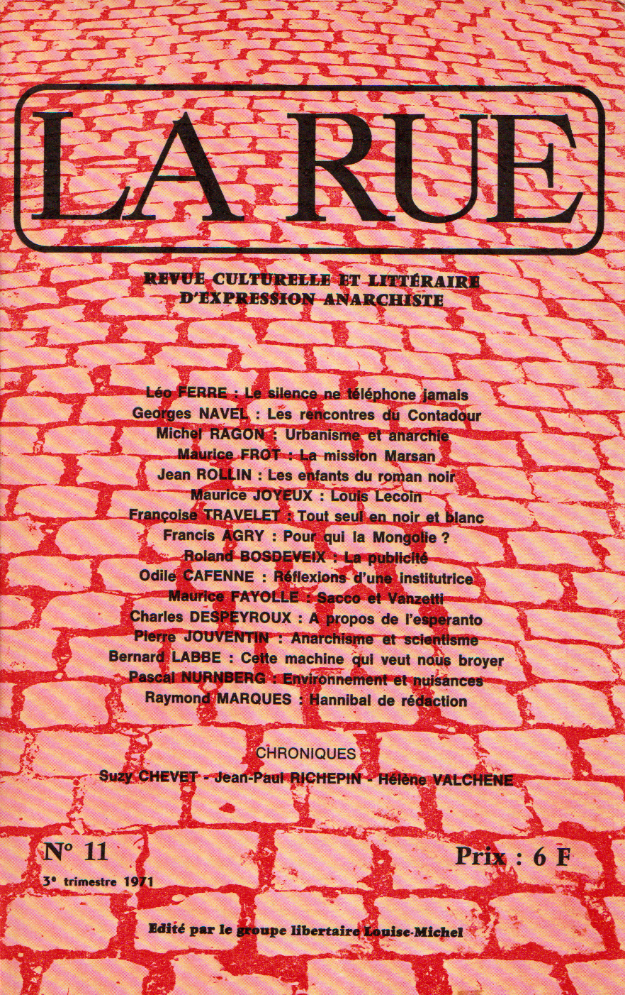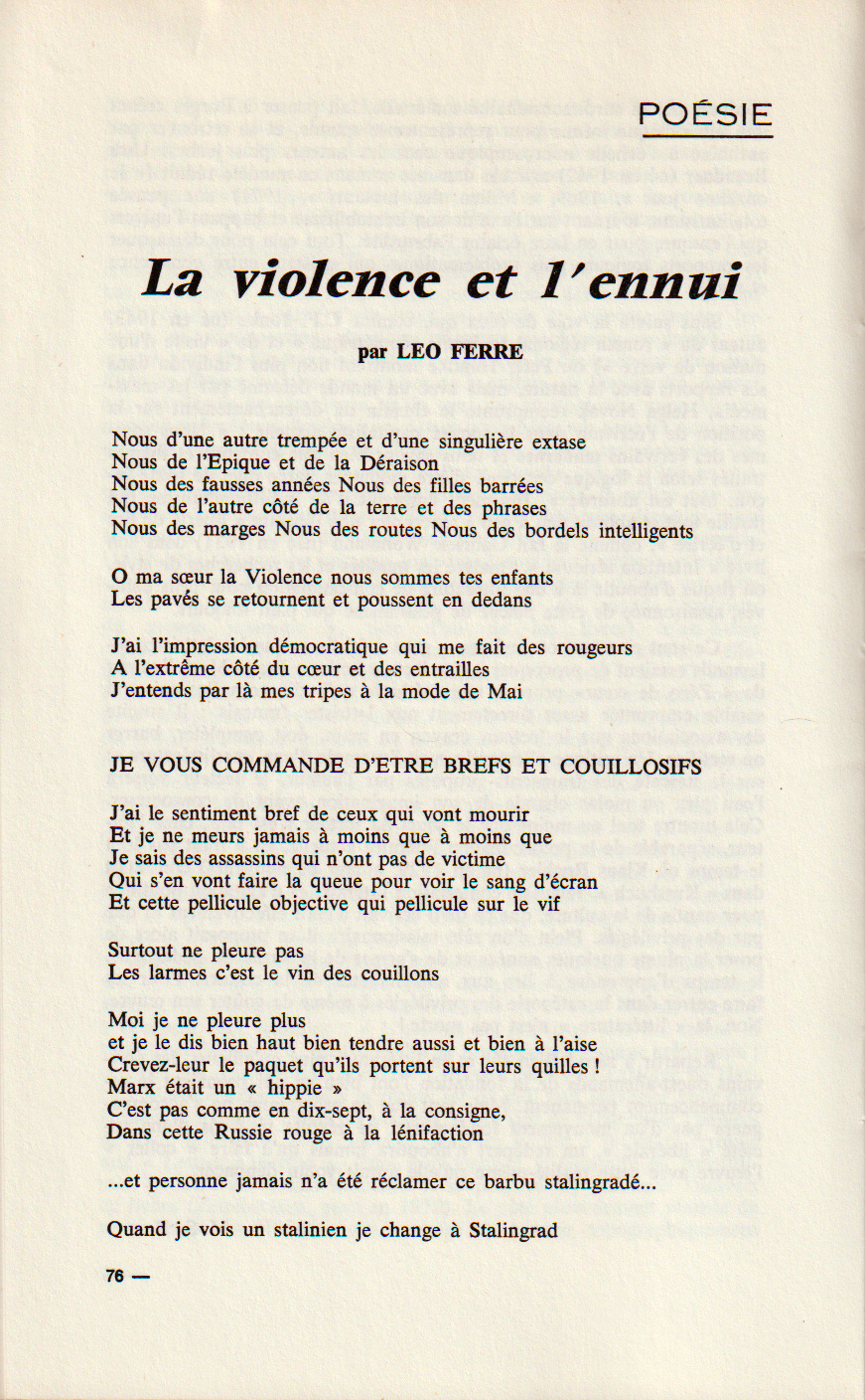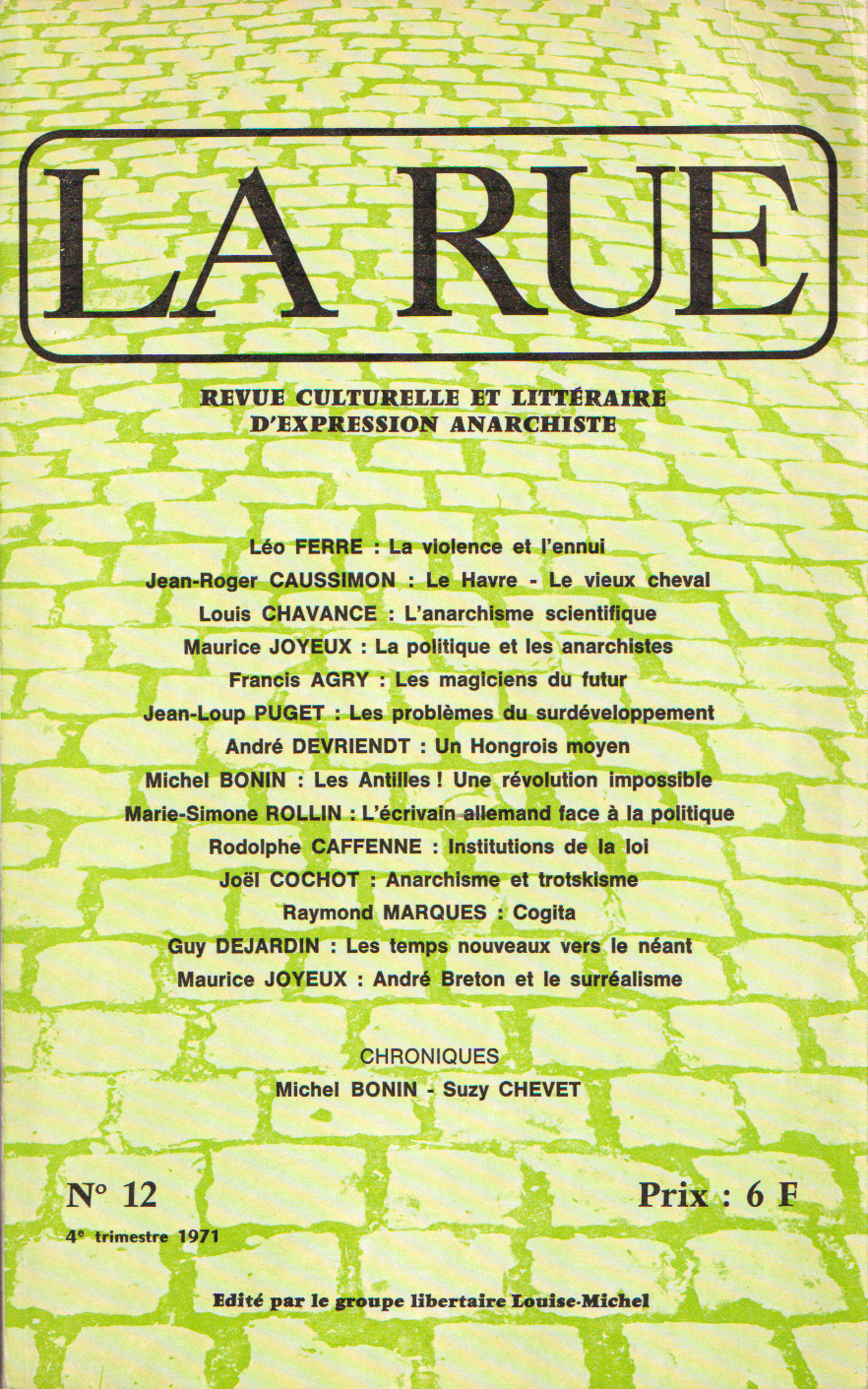 Dans La Rue n° 12, daté du 4ème trimestre, est publié le poème La violence et l'ennui.