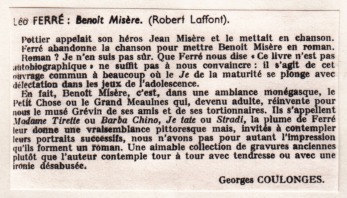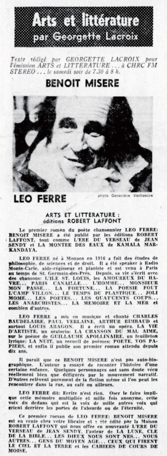 En 1971, le chanteur compositeur et interprète Léo Ferré avait enregistré quatre entretiens pour l'émission "Profils" dans lesquels il évoquait sa vie et son oeuvre. Dans cette première partie, il était question de son roman autobiographique "Benoît Misère".