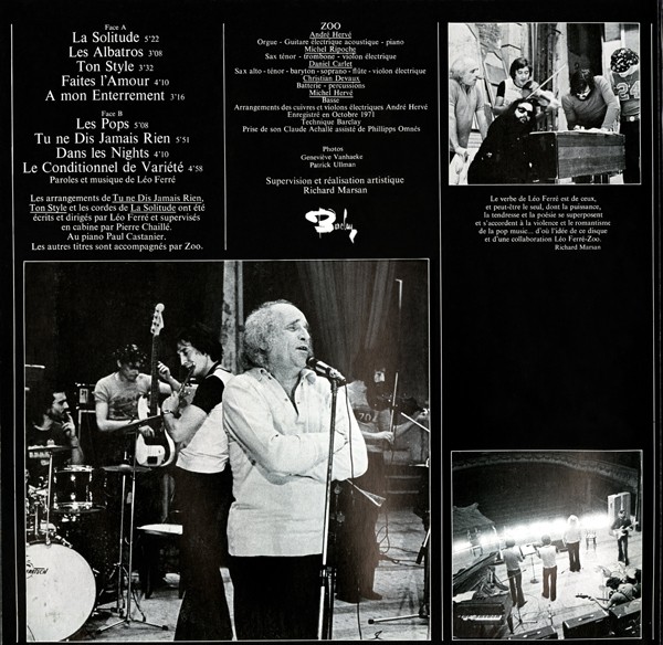Résumé : Léo Ferré accompagné par le groupe Les Zoo chante Les Pops sur la scène de la Mutualité.