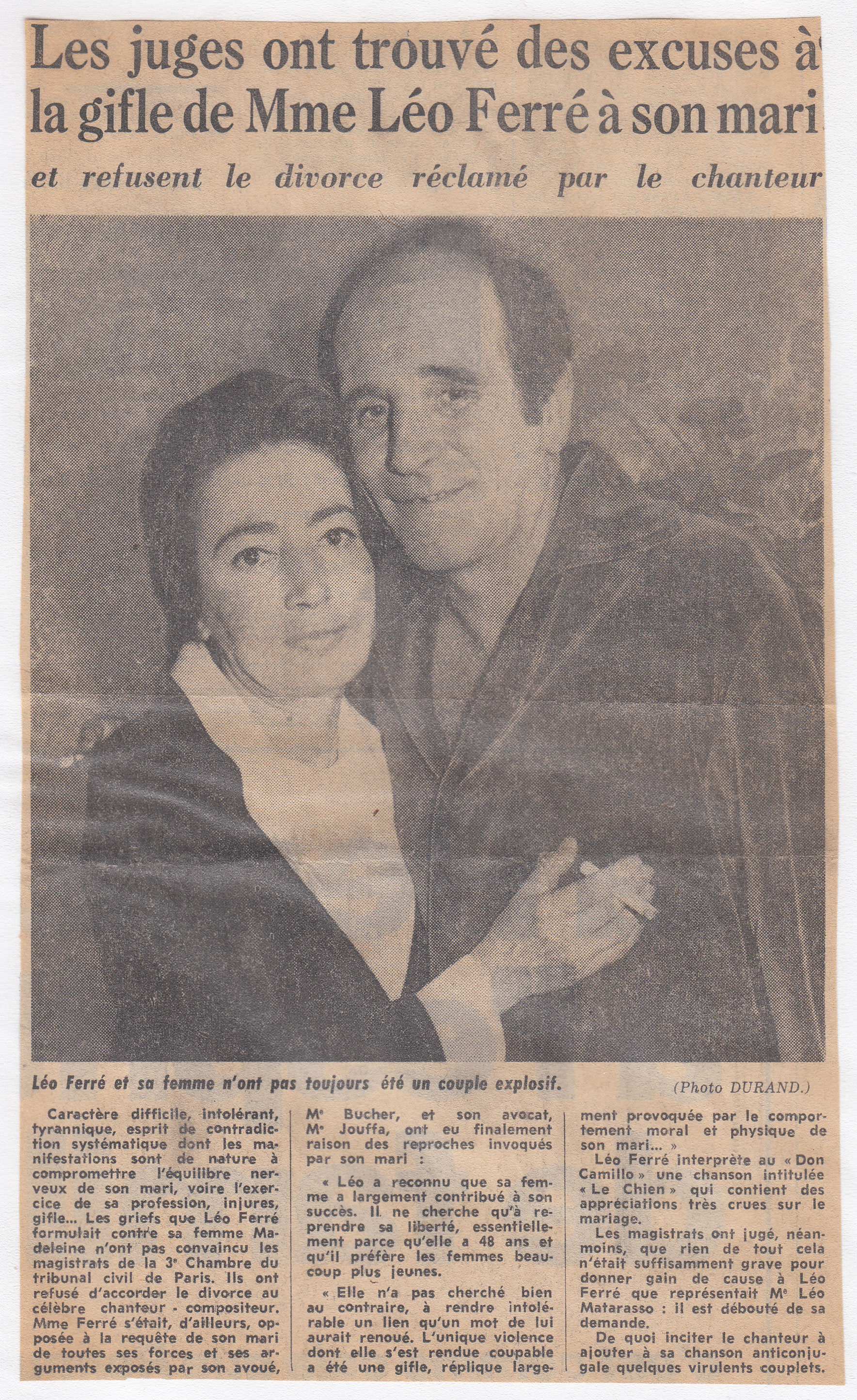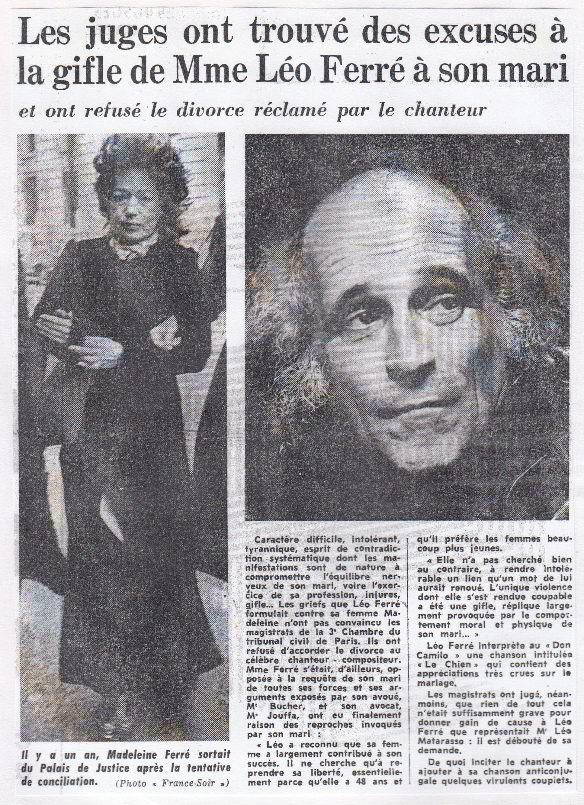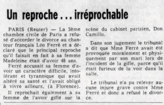 • Les juges ont trouvé des excuses à la gifle de Mme Léo Ferré à son mari et ont refusé le divorce réclamé par le chanteur