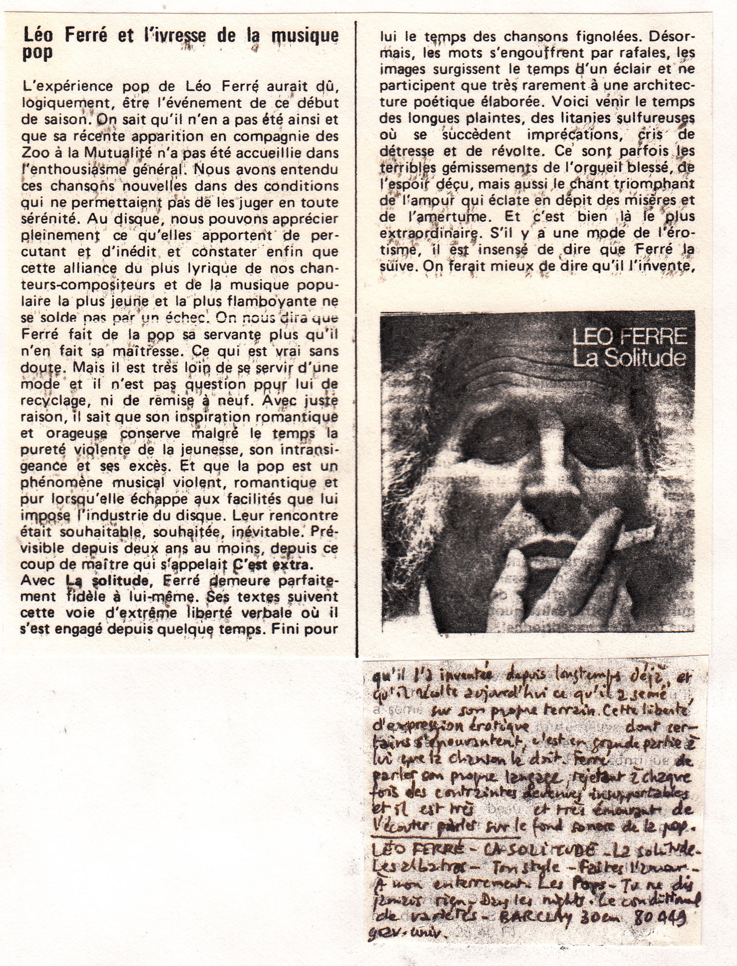 La chanson Avec le temps initialement prévue pour figurer sur le deuxième volume de l'album Amour Anarchie puis écartée par la maison de disques Barclay sort finalement la même année en 45 tours et obtient un très grand succès public, le plus grand pour Ferré depuis C’est extra en 1969.