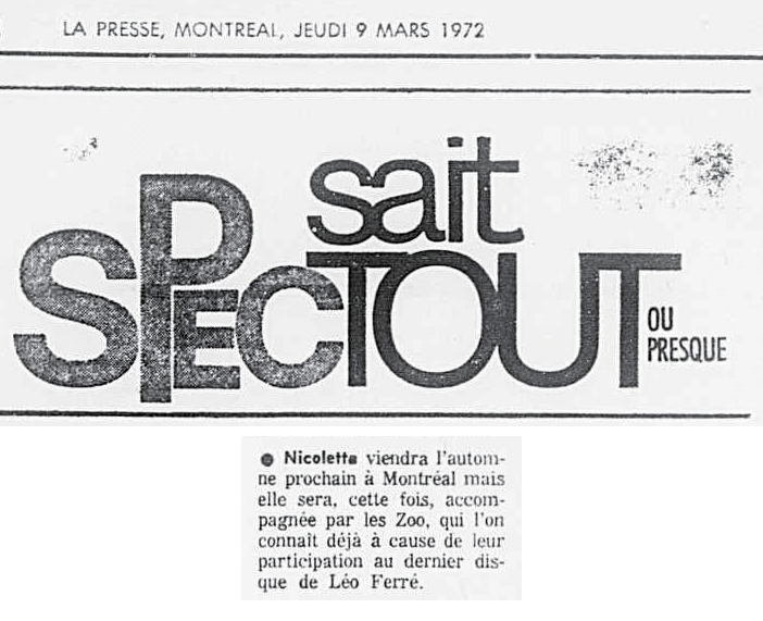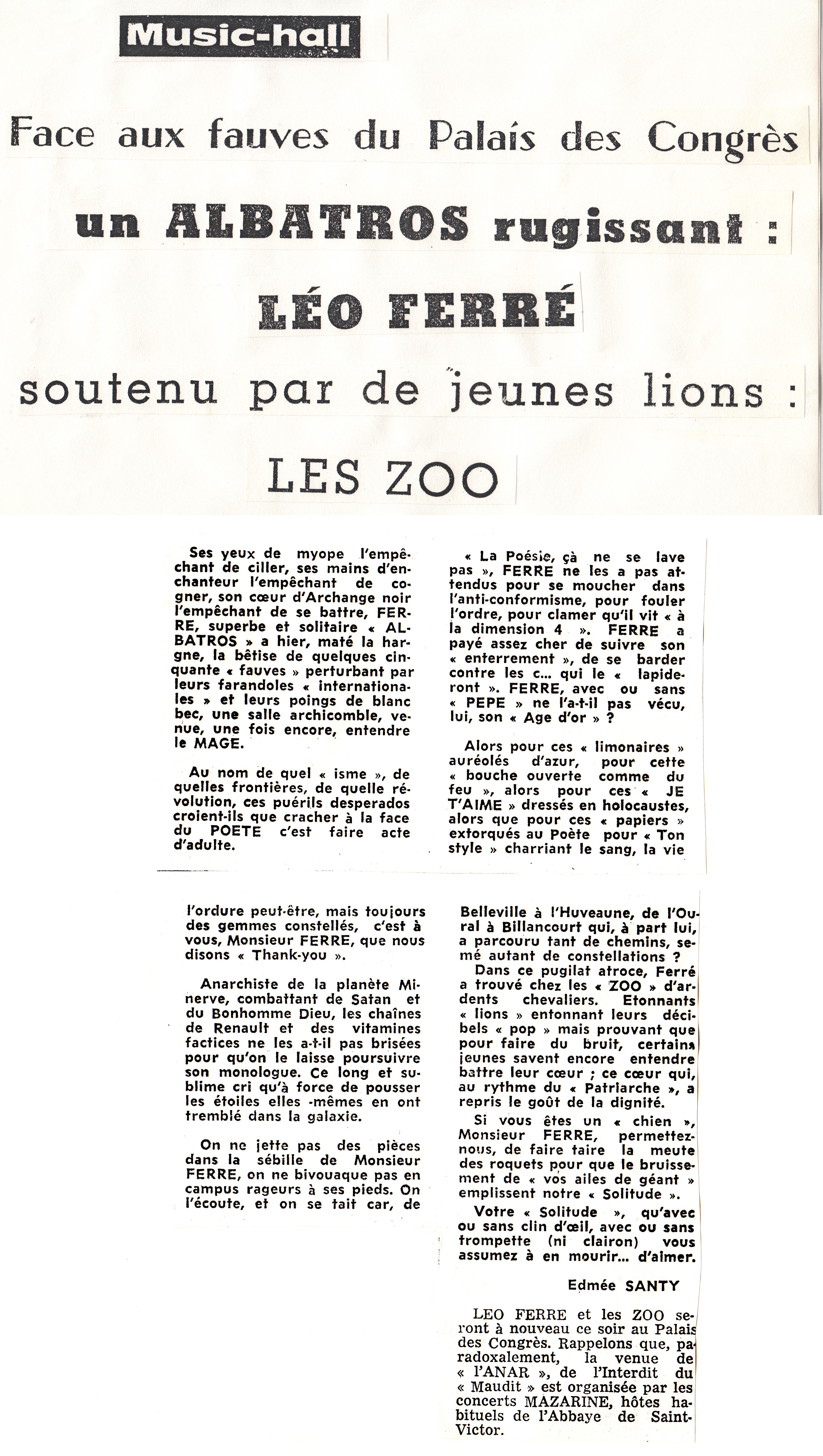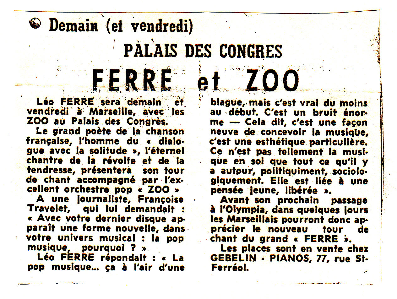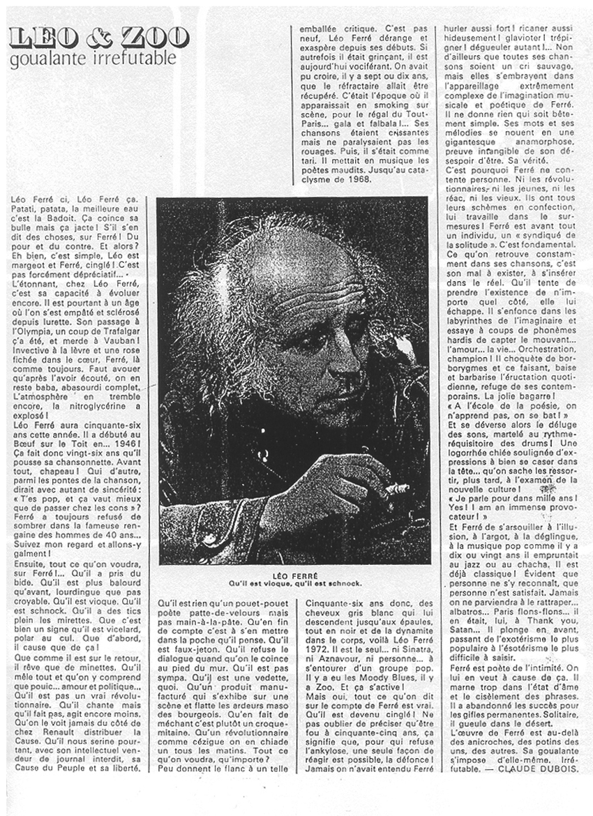 • Face aux fauves du Palais des congrès un albatros rugissant : Léo Ferré soutenu par de jeunes lions : Les Zoo
