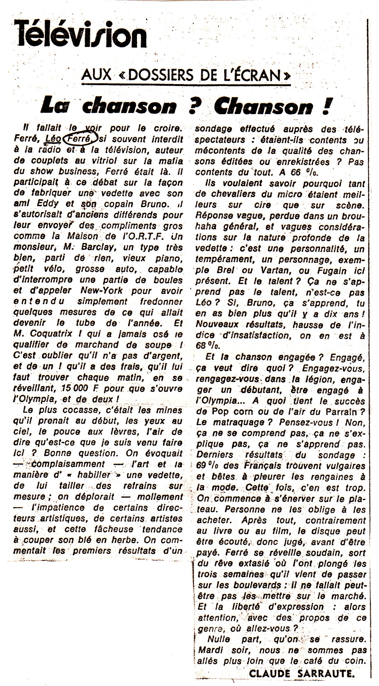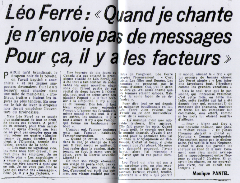 • Léo Ferré : "Quand je chante je n'envoie pas de messages. Pour ça, il y a les facteurs"