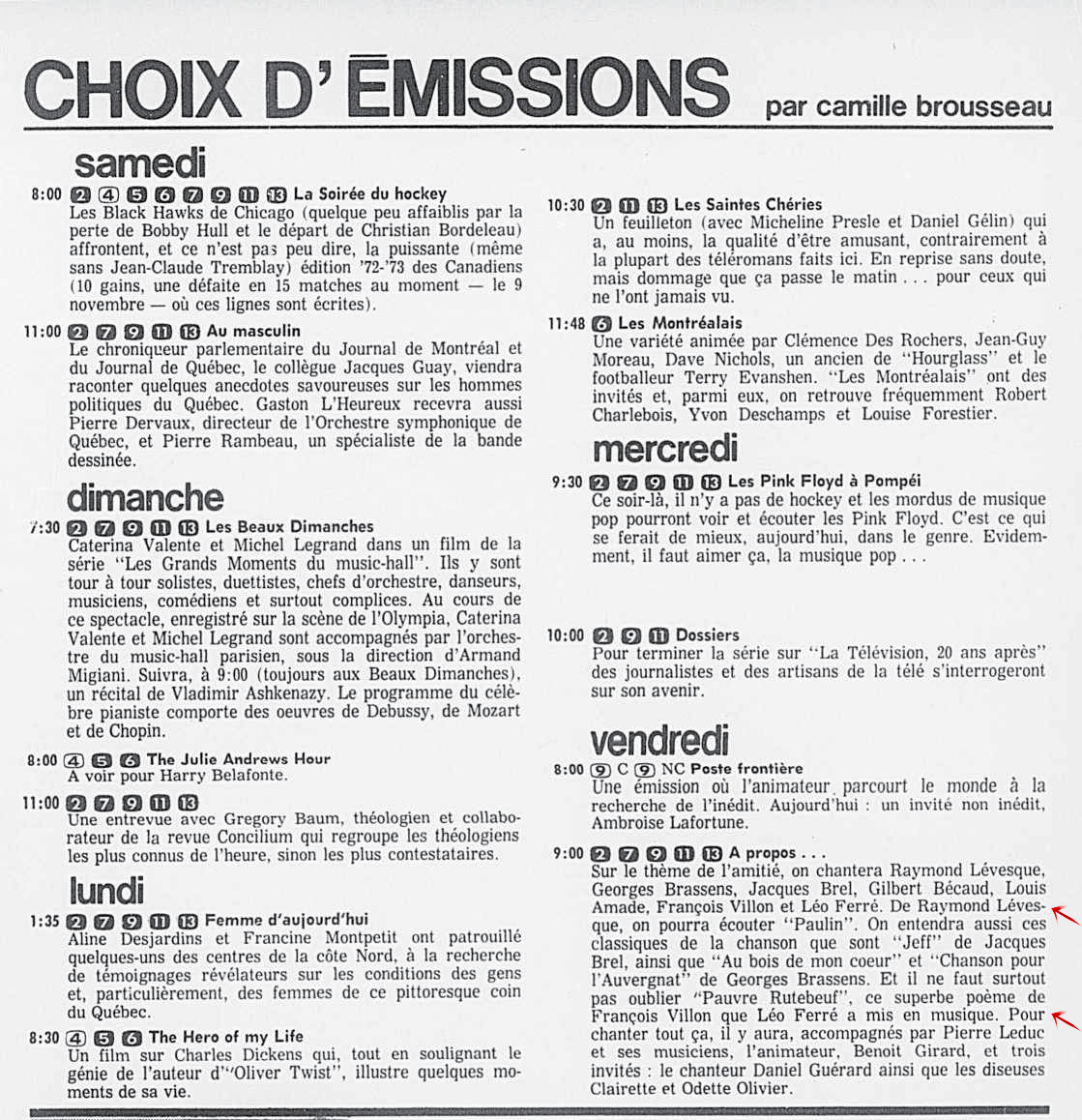 Choix d'émissions, par Camille Brousseau