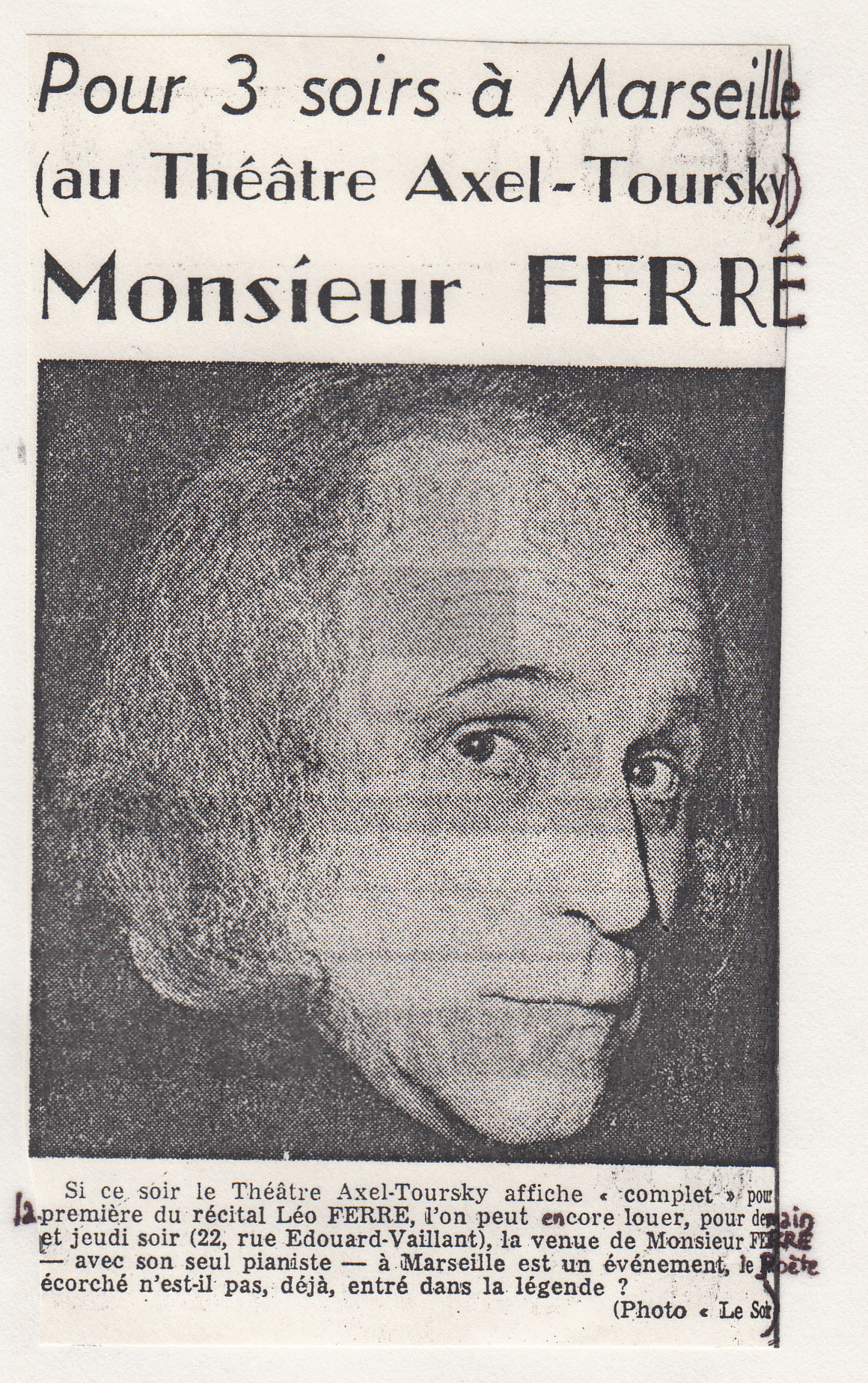 • Pour 3 soirs à Marseille (au Théâtre toursky) Monsieur Ferré
