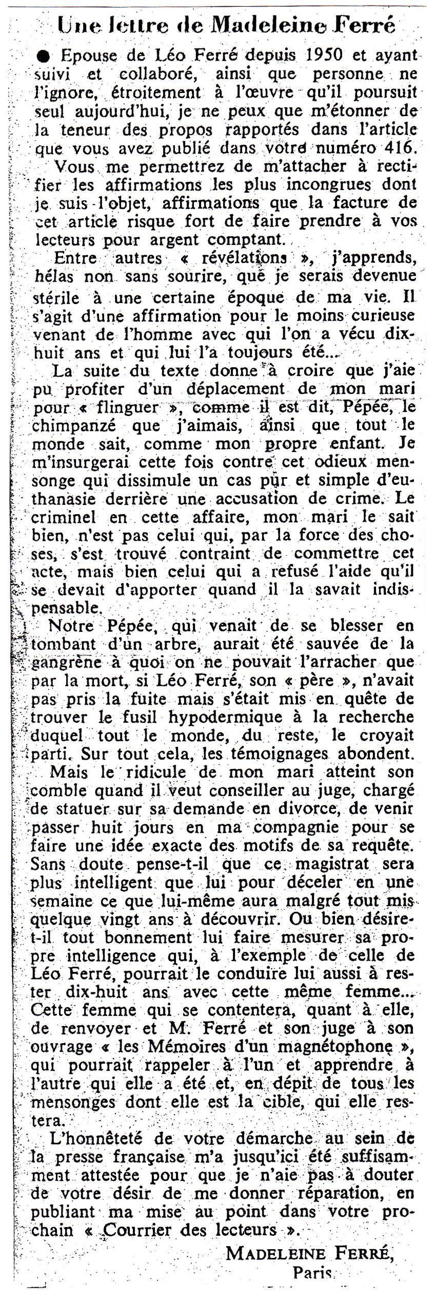 • Une lettre de Madeleine Ferré