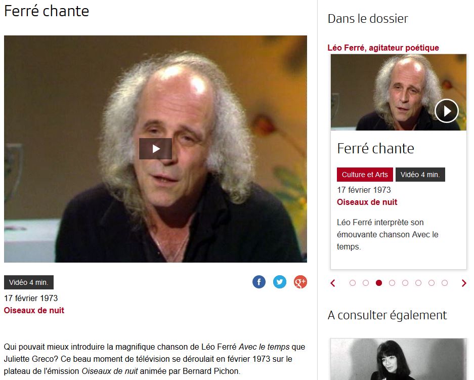 17.02 : Qui pouvait mieux introduire la magnifique chanson de Léo Ferré Avec le temps que Juliette Greco ? Ce beau moment de télévision se déroulait en février 1973 sur le plateau de l'émission Oiseaux de nuit animée par Bernard Pichon.