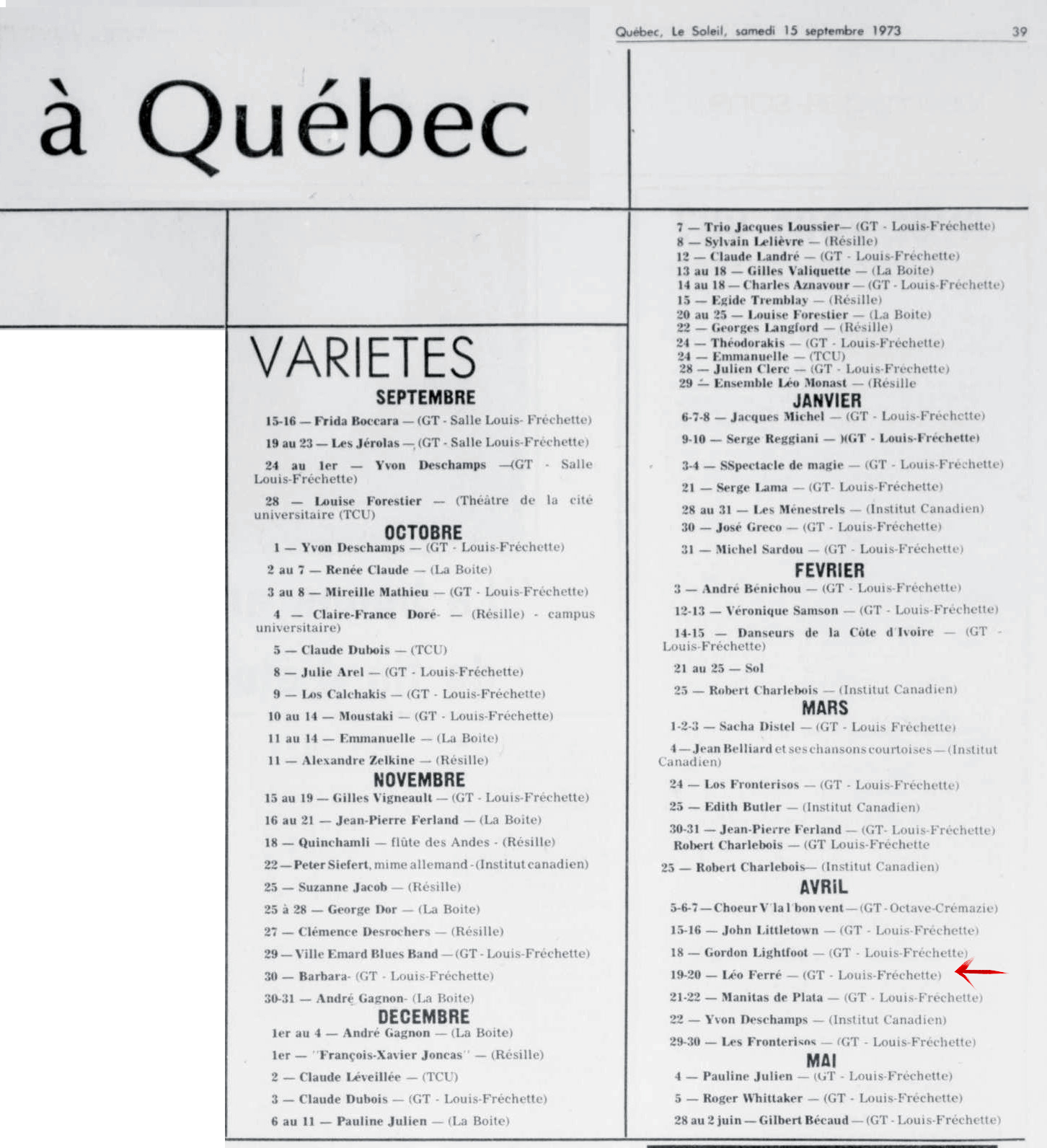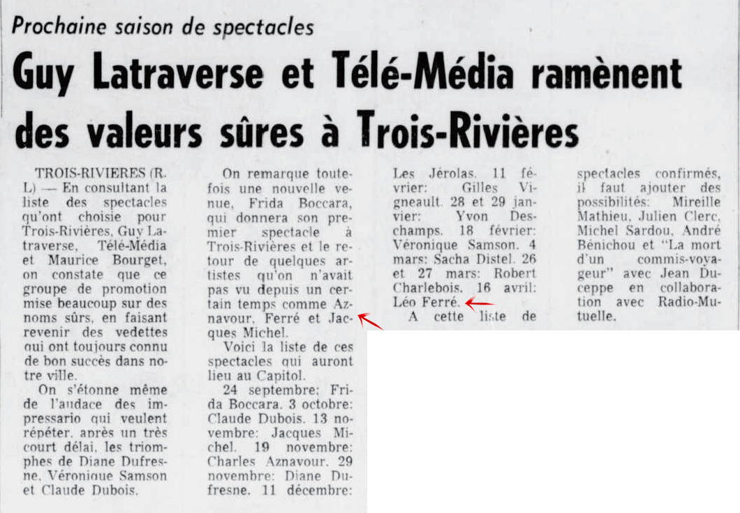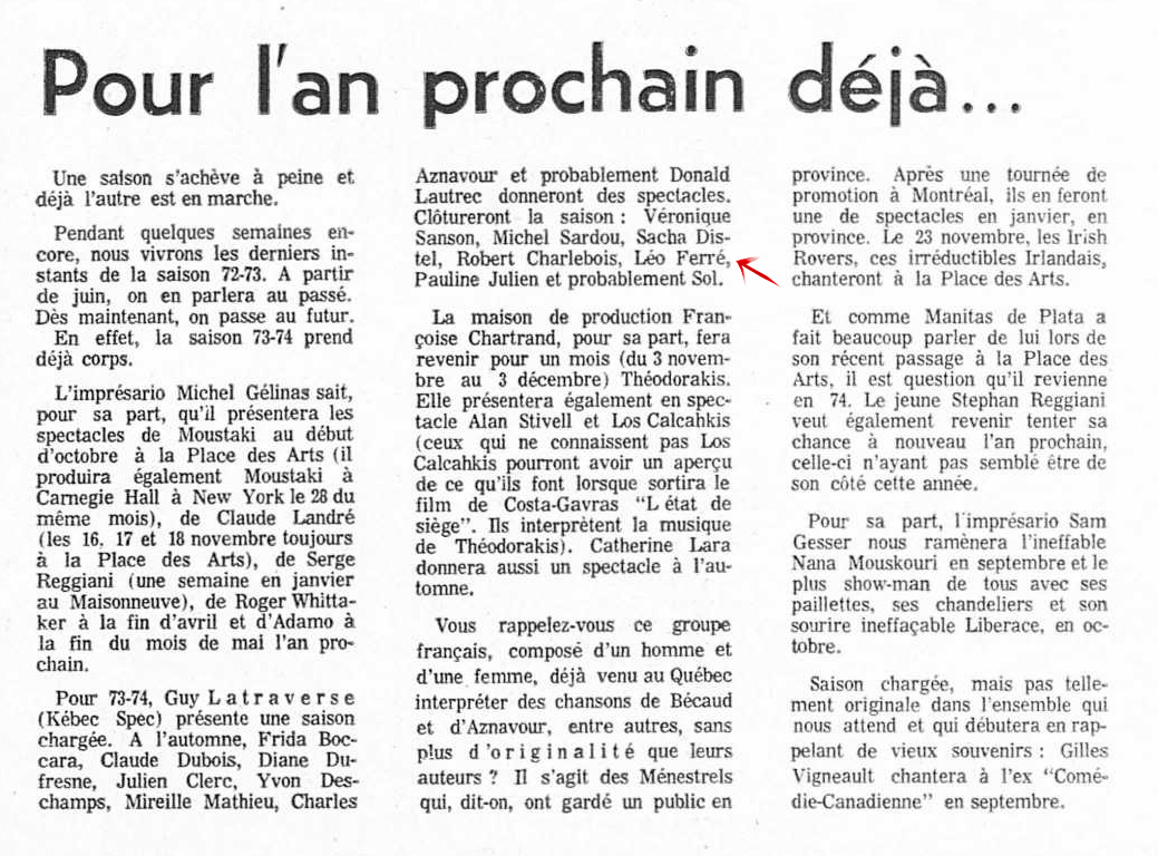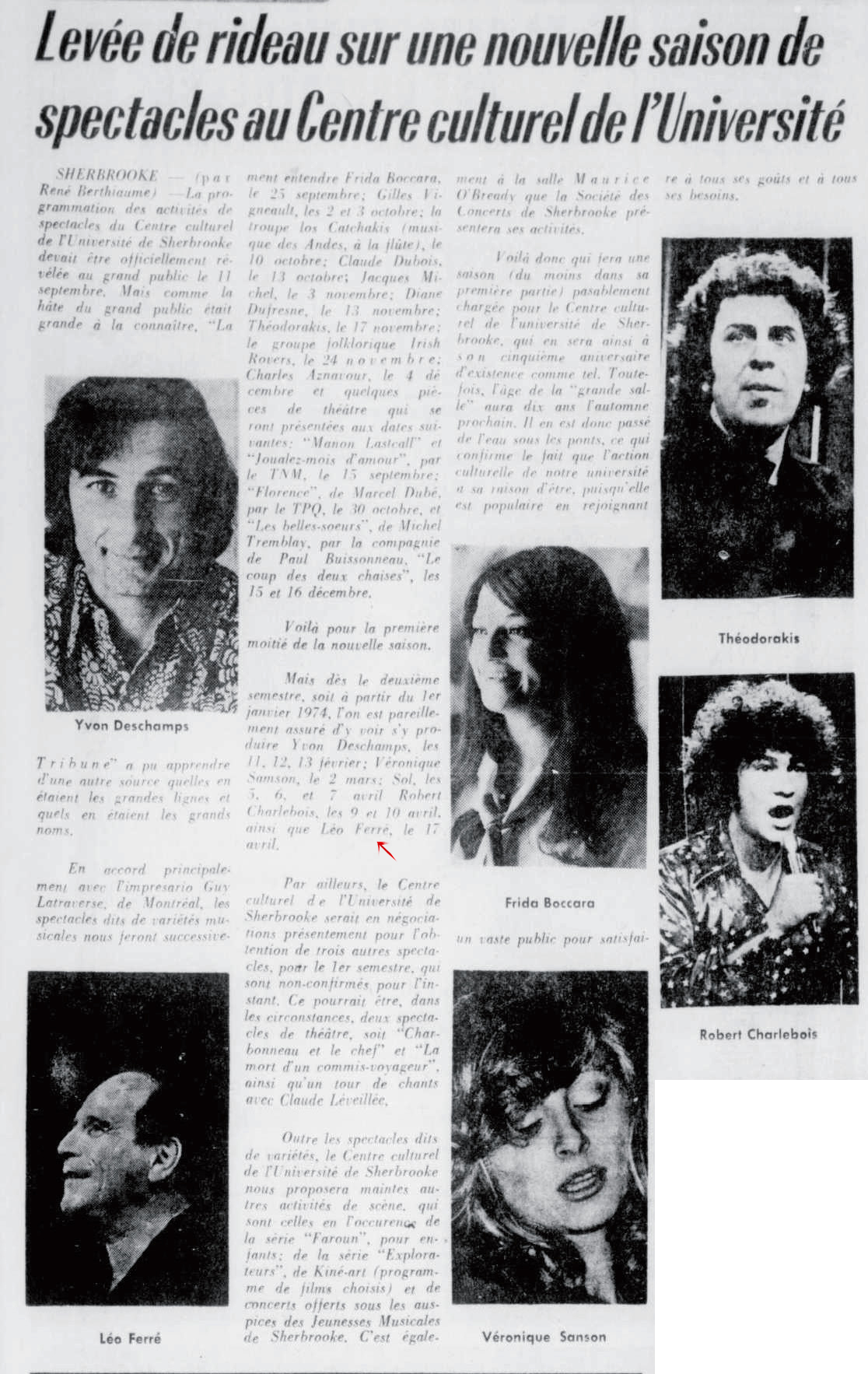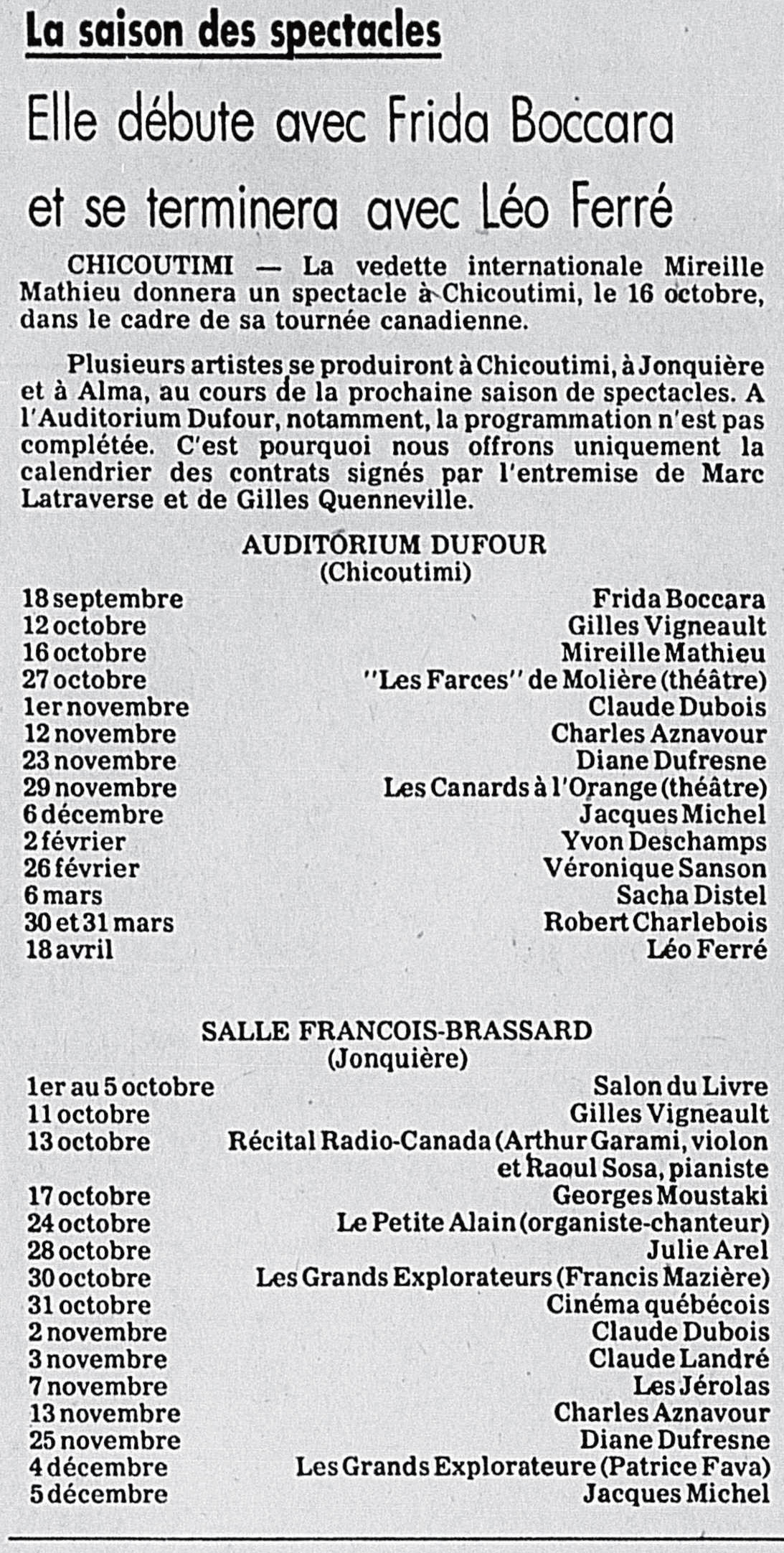 • La saison des spectacles - Elle débute avec Frida Boccara et se terminera avec Léo Ferré