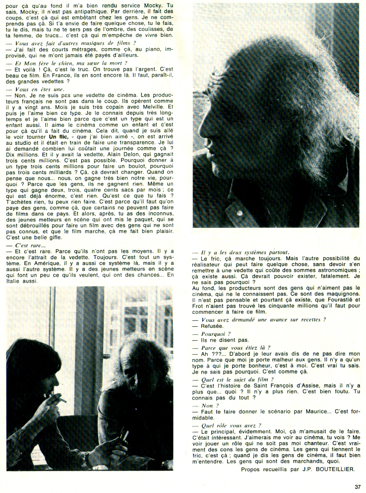 Projet de film Mon frère le chien, ma sœur la mort de Philippe Fourastié, scénario écrit pour Ferré par Maurice Frot version contemporaine de la vie de Saint François d’Assise.