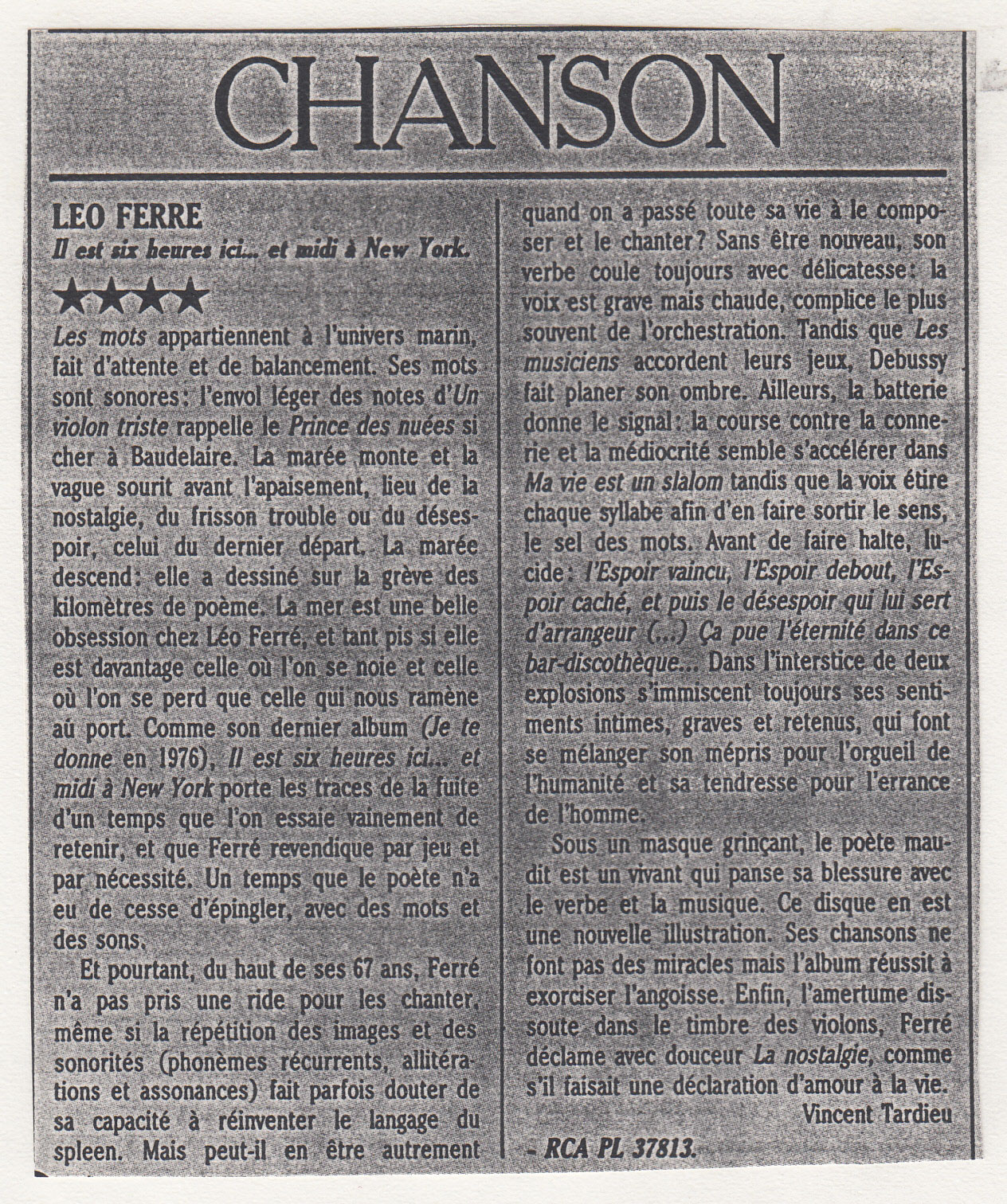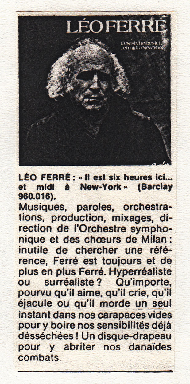 • Léo Ferré : "Il est six heures ici... et midi à New-York"