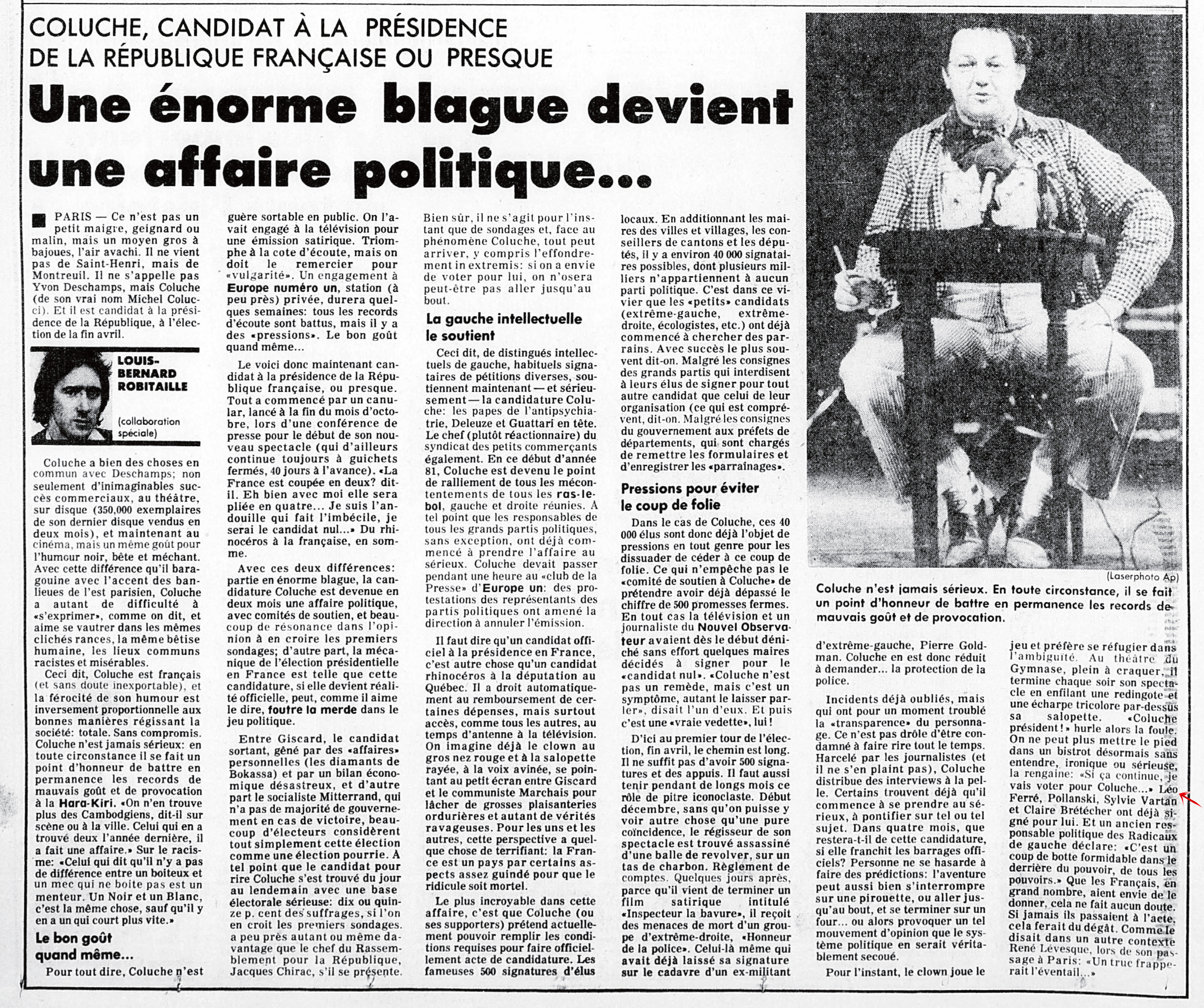 • Coluche, candidat à la présidence de la République française ou presque - Une énorme blague devient une affaire politique...