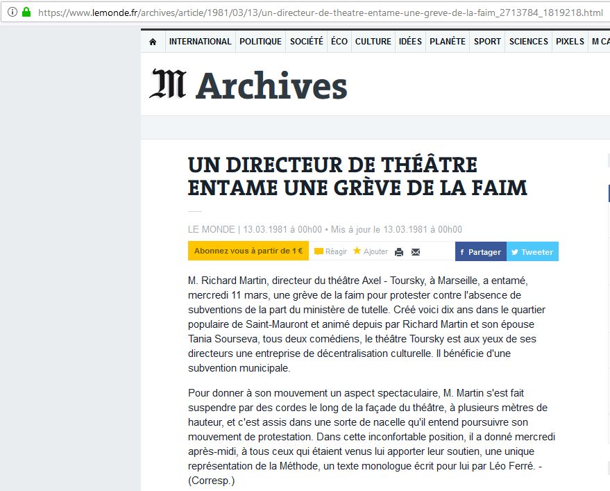 M. Richard Martin, directeur du théâtre Axel - Toursky, à Marseille, a entamé, mercredi 11 mars, une grève de la faim pour protester contre l'absence de subventions de la part du ministère de tutelle. Créé voici dix ans dans le quartier populaire de Saint-Mauront et animé depuis par Richard Martin et son épouse Tania Sourseva, tous deux comédiens, le théâtre Toursky est aux yeux de ses directeurs une entreprise de décentralisation culturelle. Il bénéficie d'une subvention municipale.