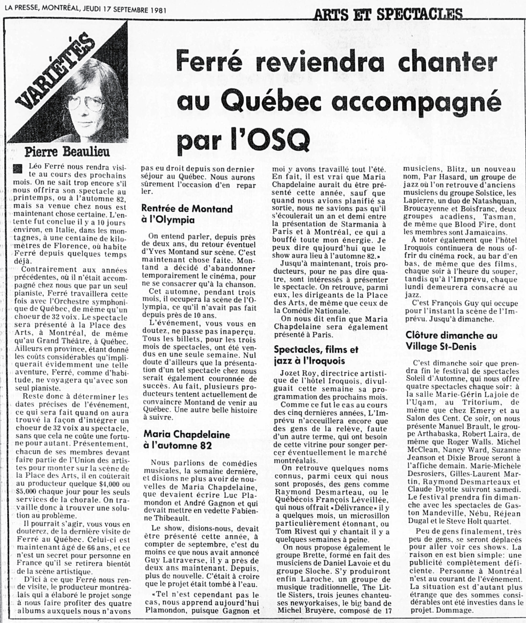 • Ferré reviendra chanter au Québec accompagné par l'OSQ