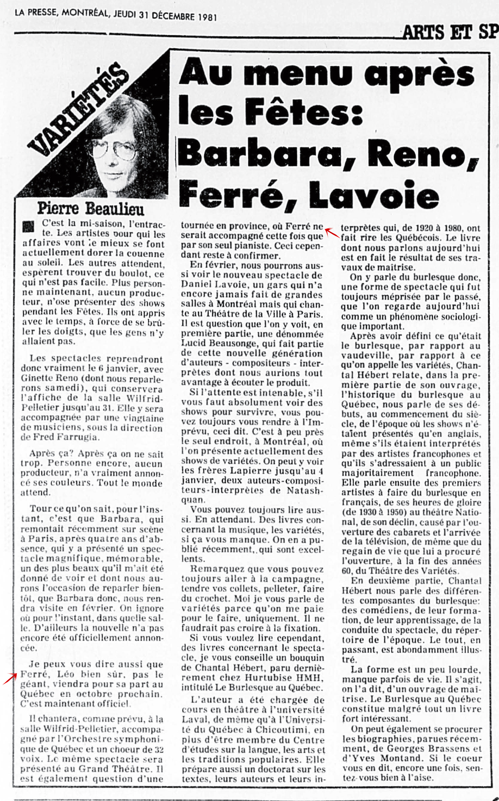 Arts et Spectacles, par Pierre Beaulieu