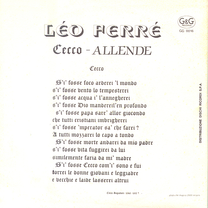 Léo Ferré chante S'i' fosse foco, arderei 'l mondo (Texte de Cecco A.)
