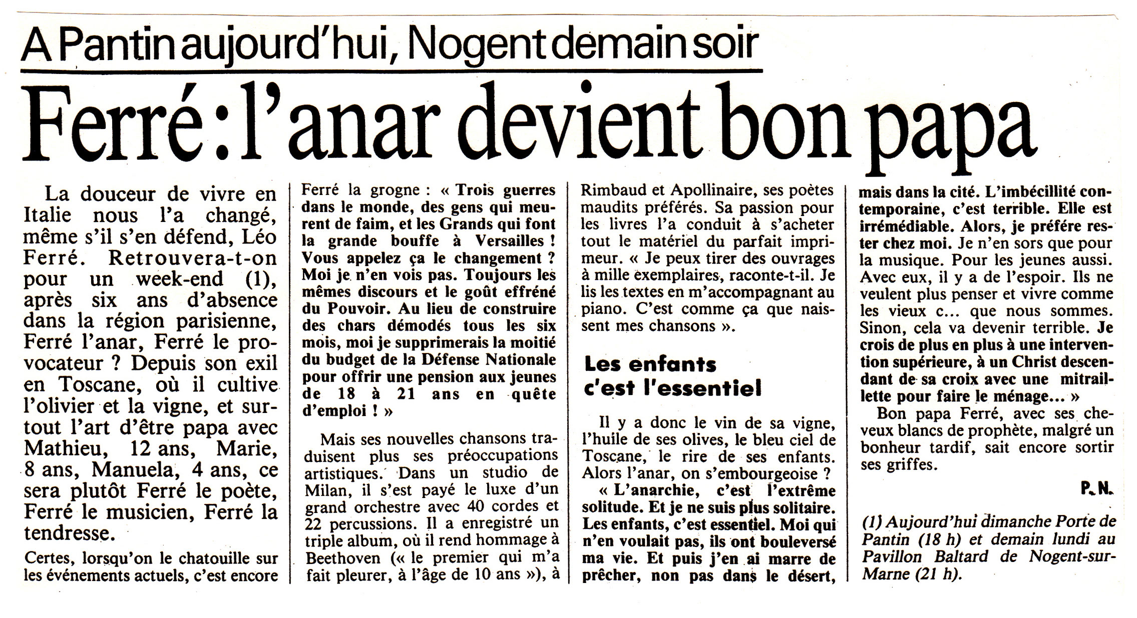 • À Pantin aujourd'hui, Nogent demain soir - Feré : l'anar devient bon papa