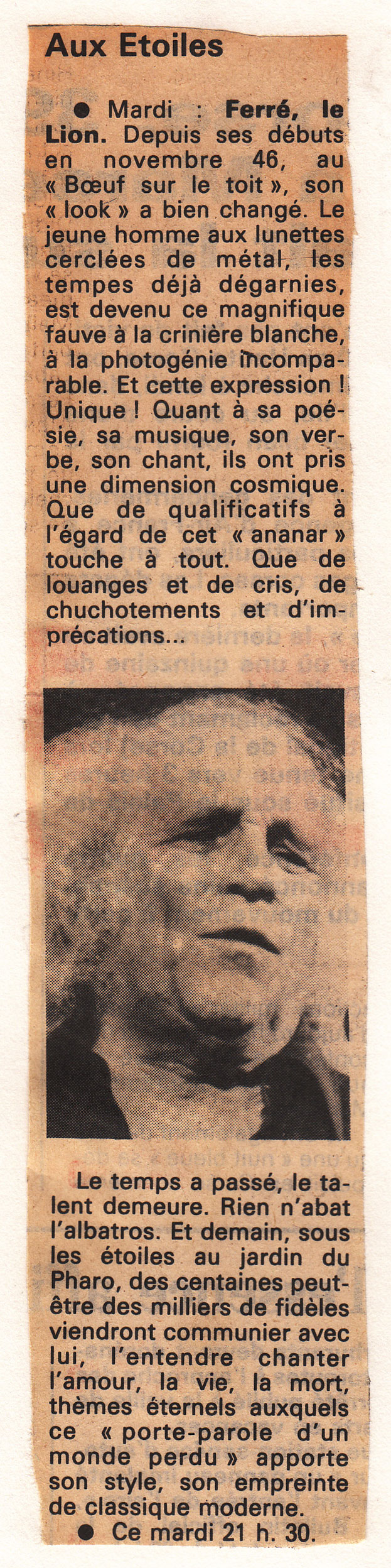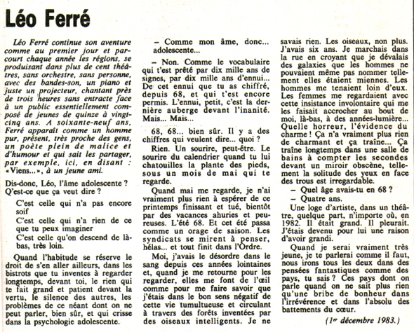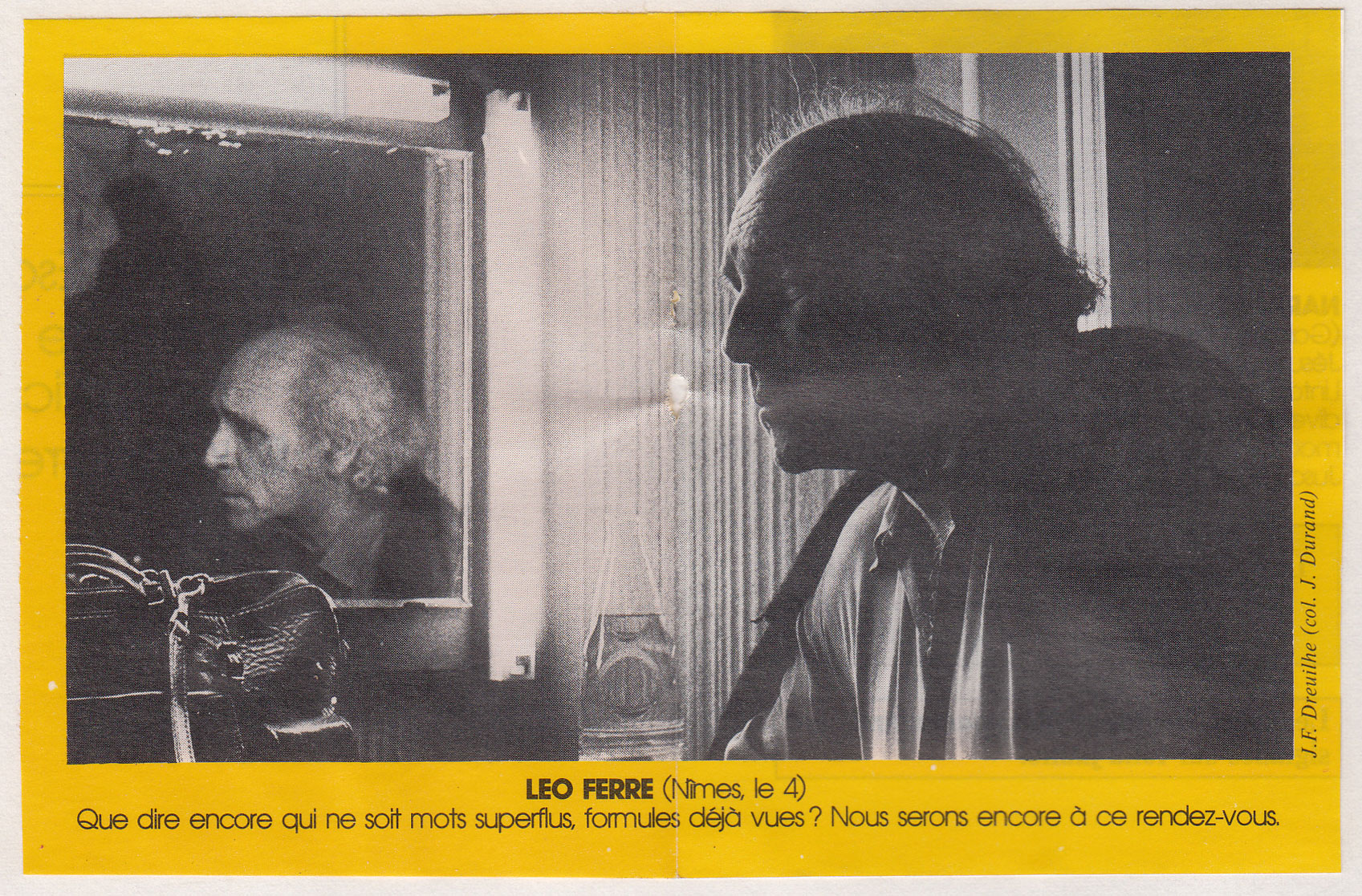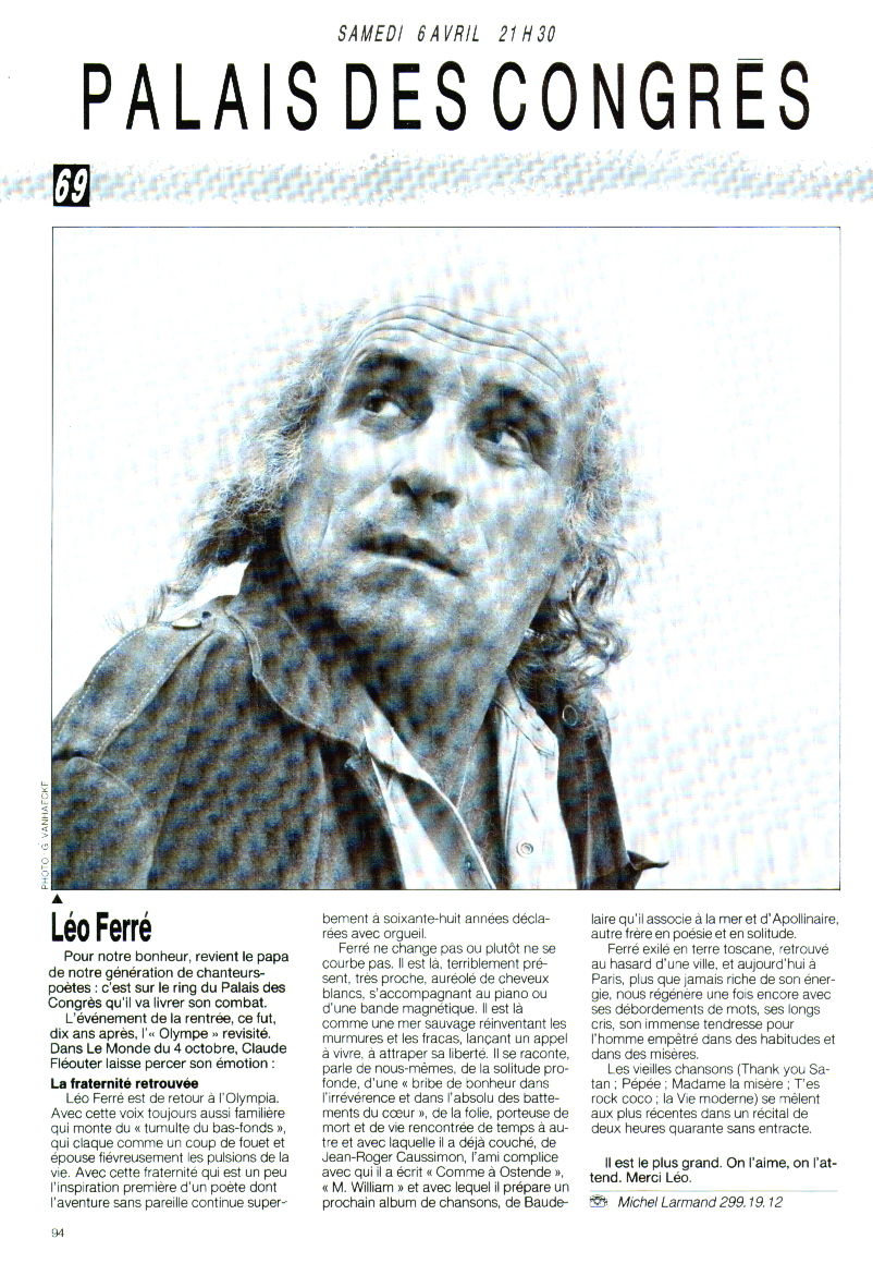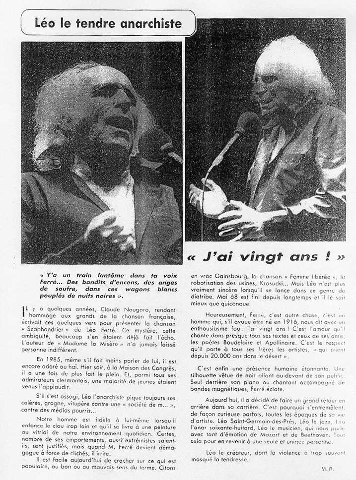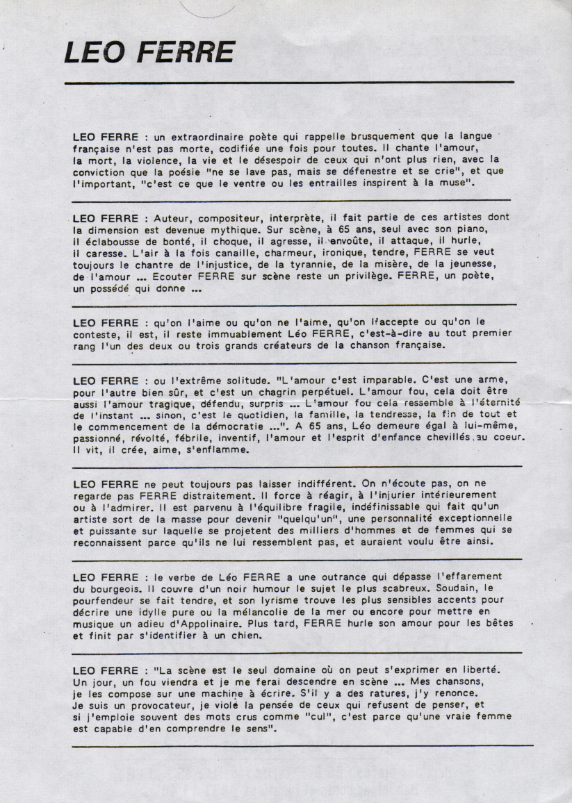 A près de soixante-dix ans, Léo Ferré continue à rassembler naturellement des foules de jeunes de quinze à vingt-cinq ans. Sa voix monte du tumulte du " bas-fond ", claque comme un coup de fouet et épouse fiévreusement les passions de la vie. Nul besoin d'un titre au hit parade pour que des milliers de spectateurs aillent à la rencontre de ce dernier géant de la chanson française, toujours en train de réinventer les murmures et les fracas, de se raconter et de parler de nous-mêmes, avec ses débordements de mots et ses cris, avec son insolence, sa tendresse.