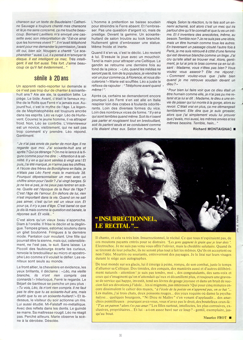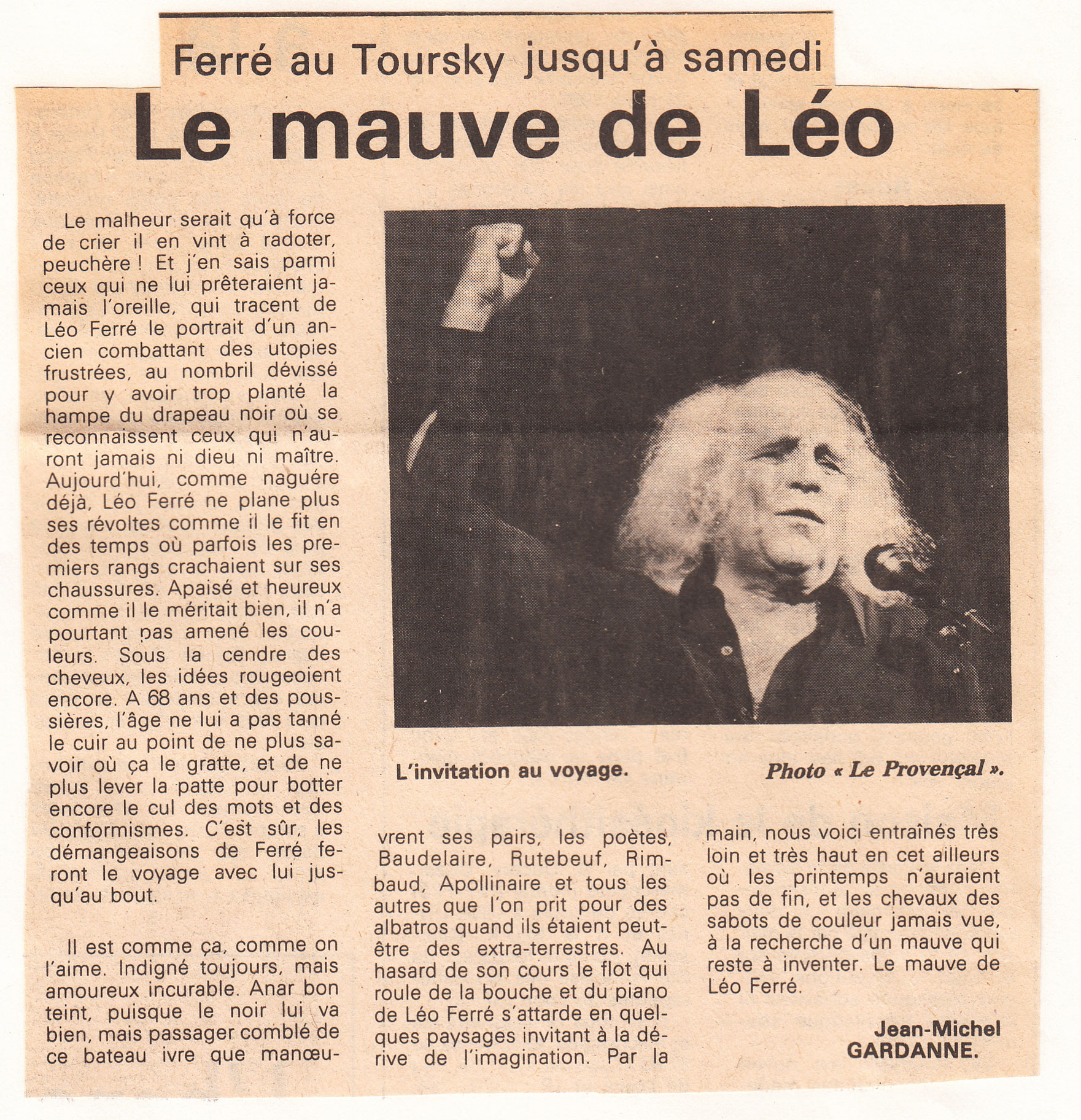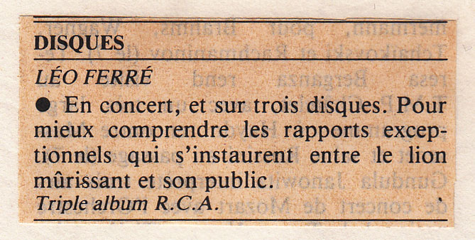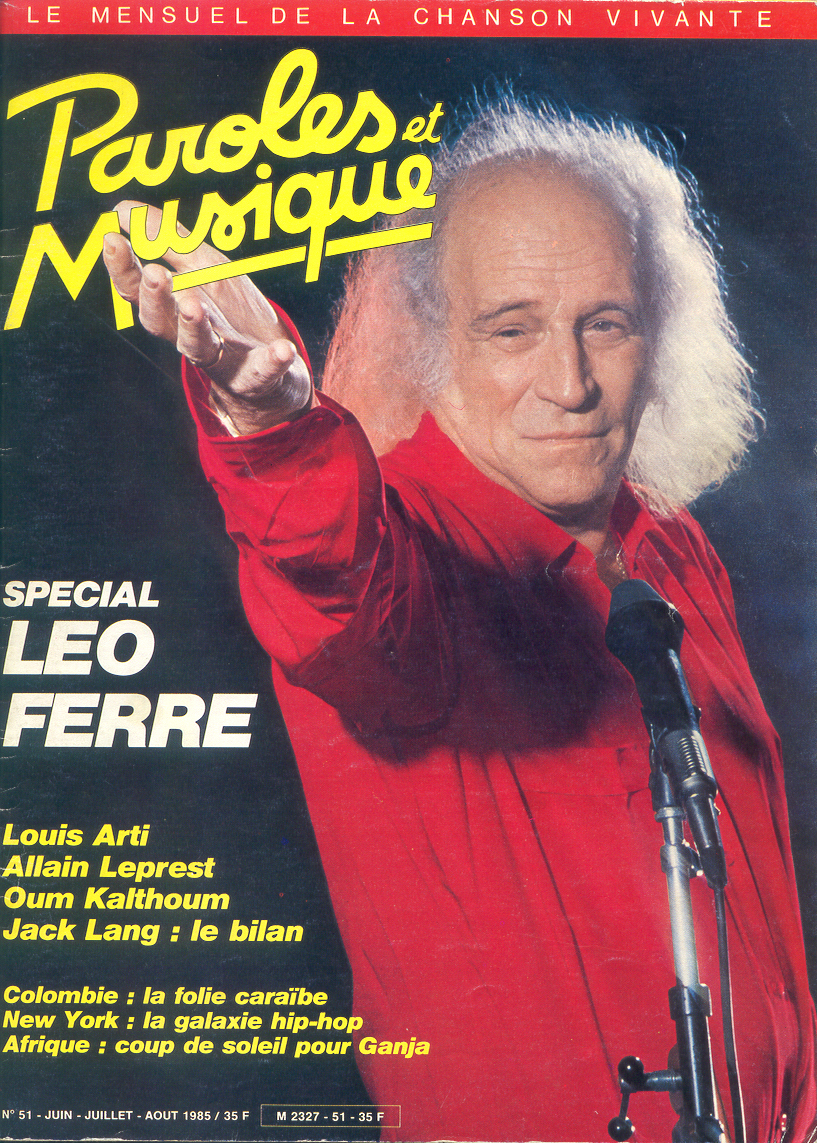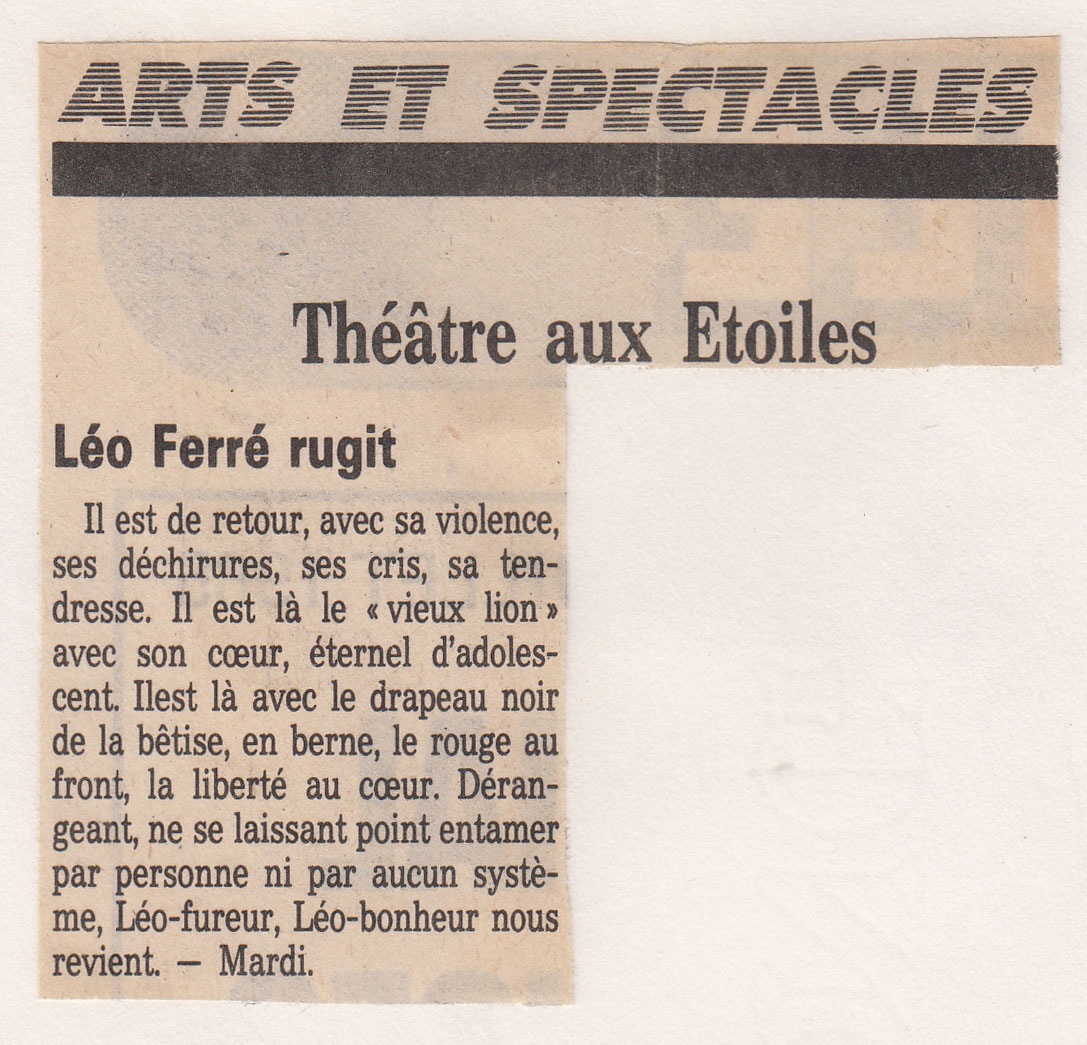 A près de soixante-dix ans, Léo Ferré continue à rassembler naturellement des foules de jeunes de quinze à vingt-cinq ans. Sa voix monte du tumulte du " bas-fond ", claque comme un coup de fouet et épouse fiévreusement les passions de la vie. Nul besoin d'un titre au hit parade pour que des milliers de spectateurs aillent à la rencontre de ce dernier géant de la chanson française, toujours en train de réinventer les murmures et les fracas, de se raconter et de parler de nous-mêmes, avec ses débordements de mots et ses cris, avec son insolence, sa tendresse.