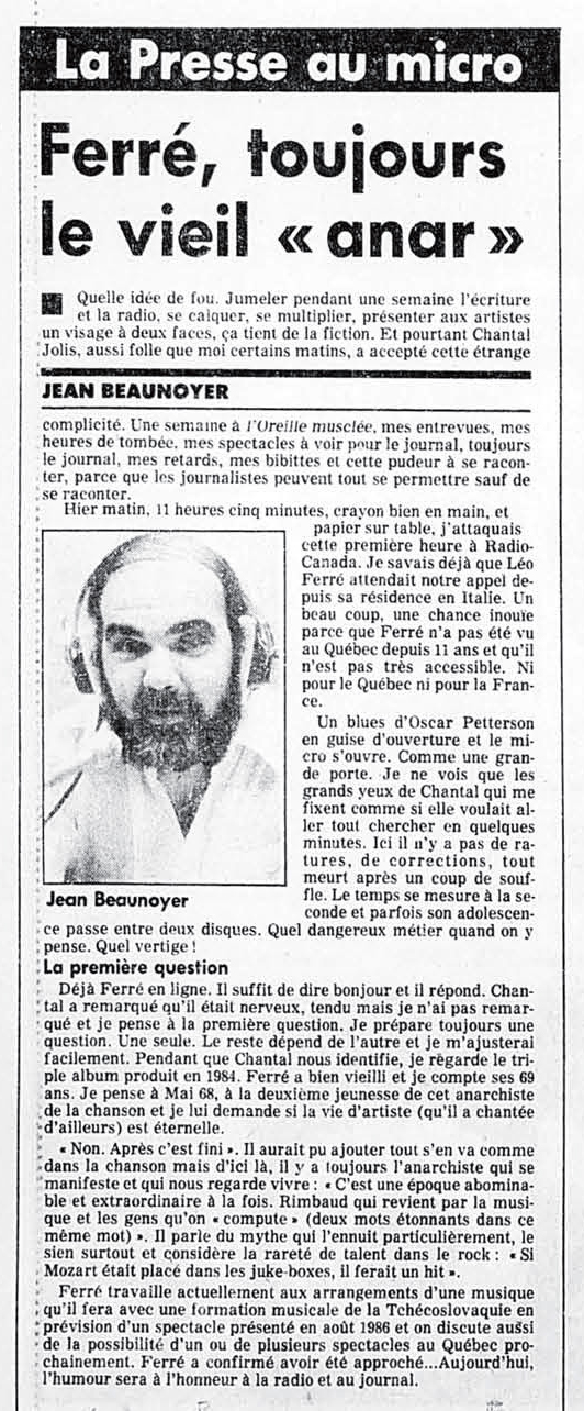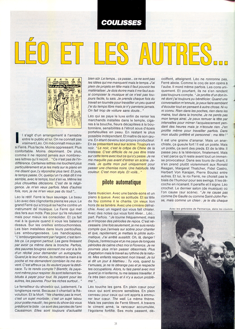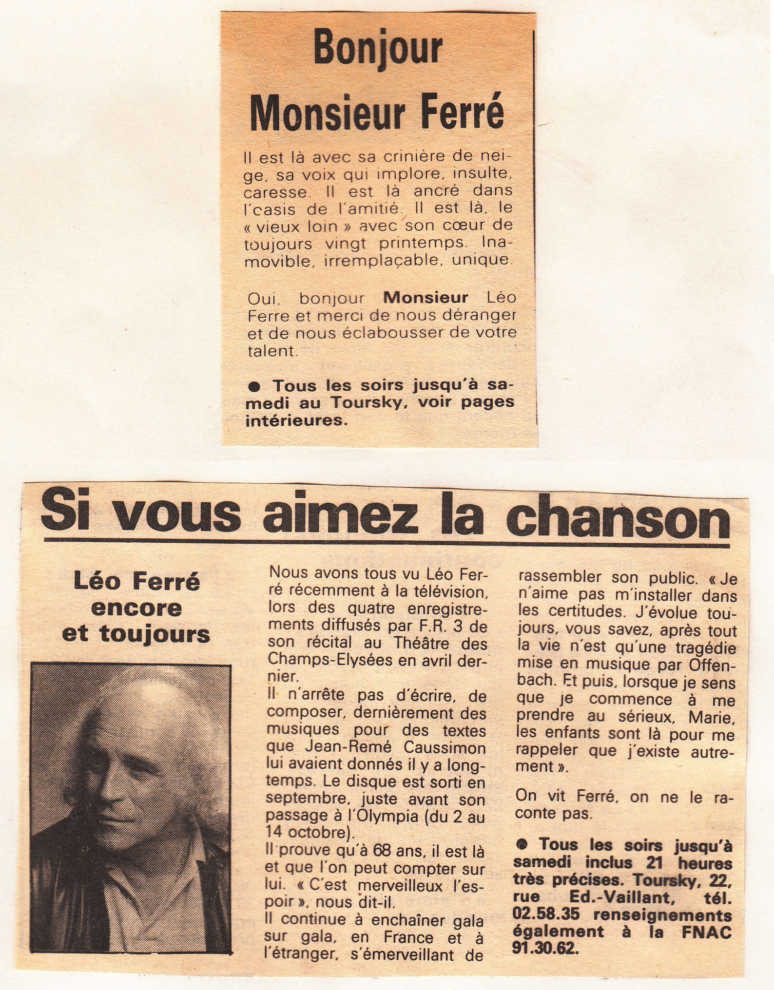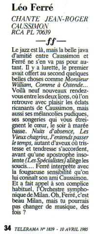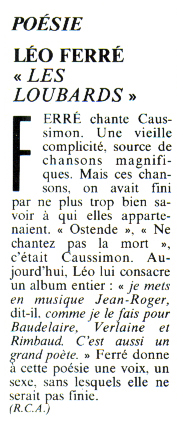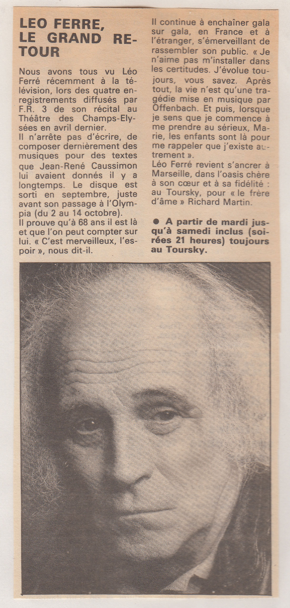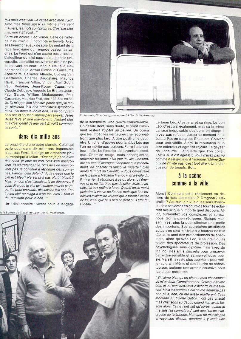 Ferré ne chante pas les textes inédits de Jean-Roger Caussimon qu'il vient de mettre en musique et qu'il a rassemblé dans un album RCA. Il n'a pas eu le temps de les apprendre par cœur. Il est tout le temps sur la route, avec Marie, sa compagne : pour des tours de chant ou des concerts, comme celui qu'il va diriger en mai prochain avec l'Orchestre de la RTB ou celui prévu en juillet avec l'Orchestre et les chœurs de Bratislava.