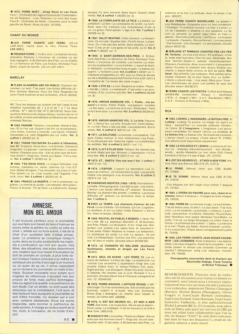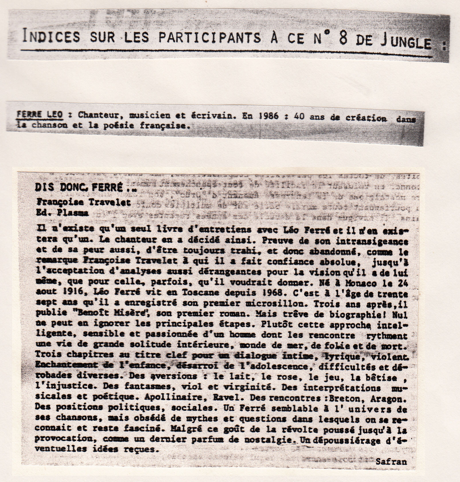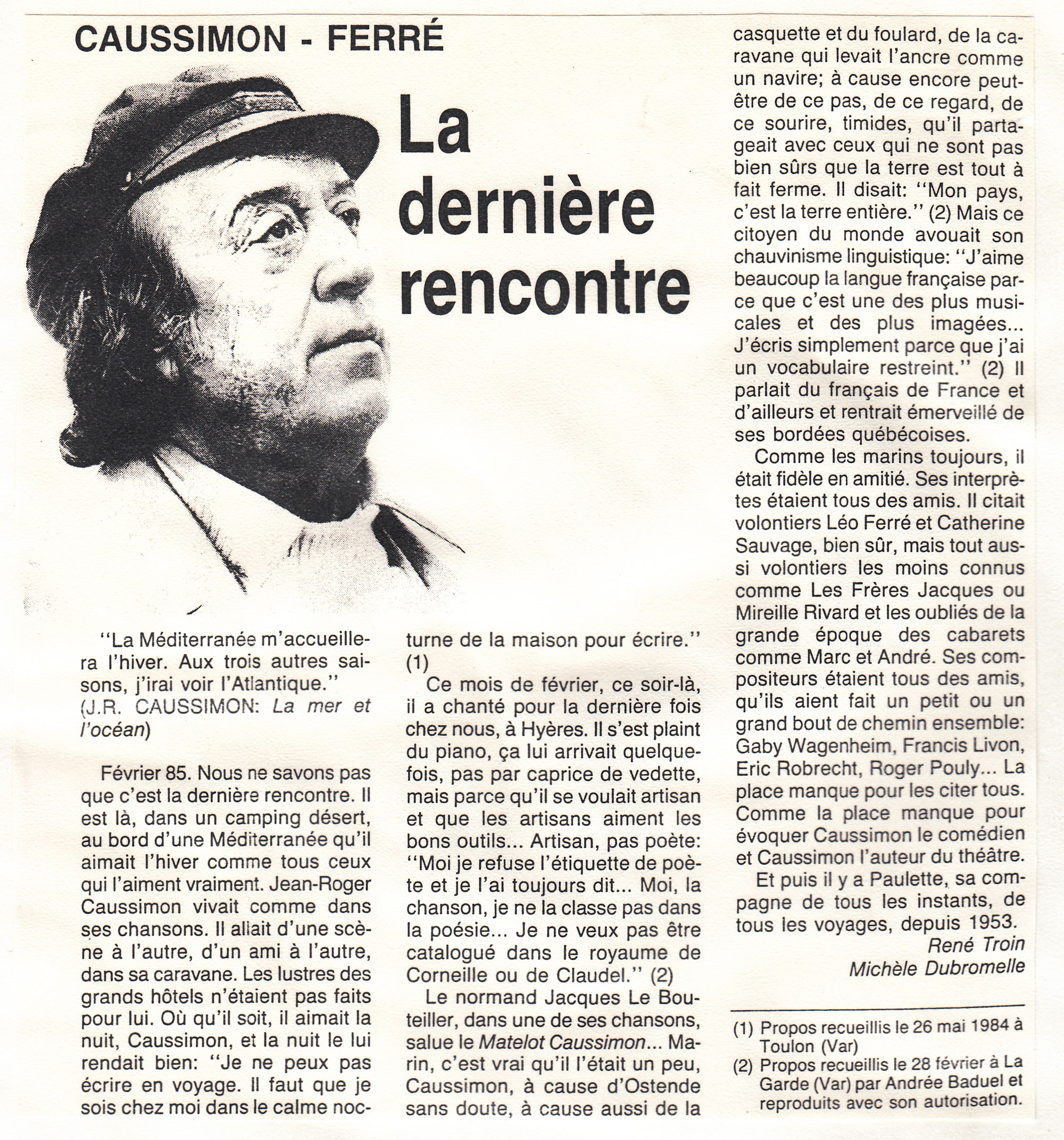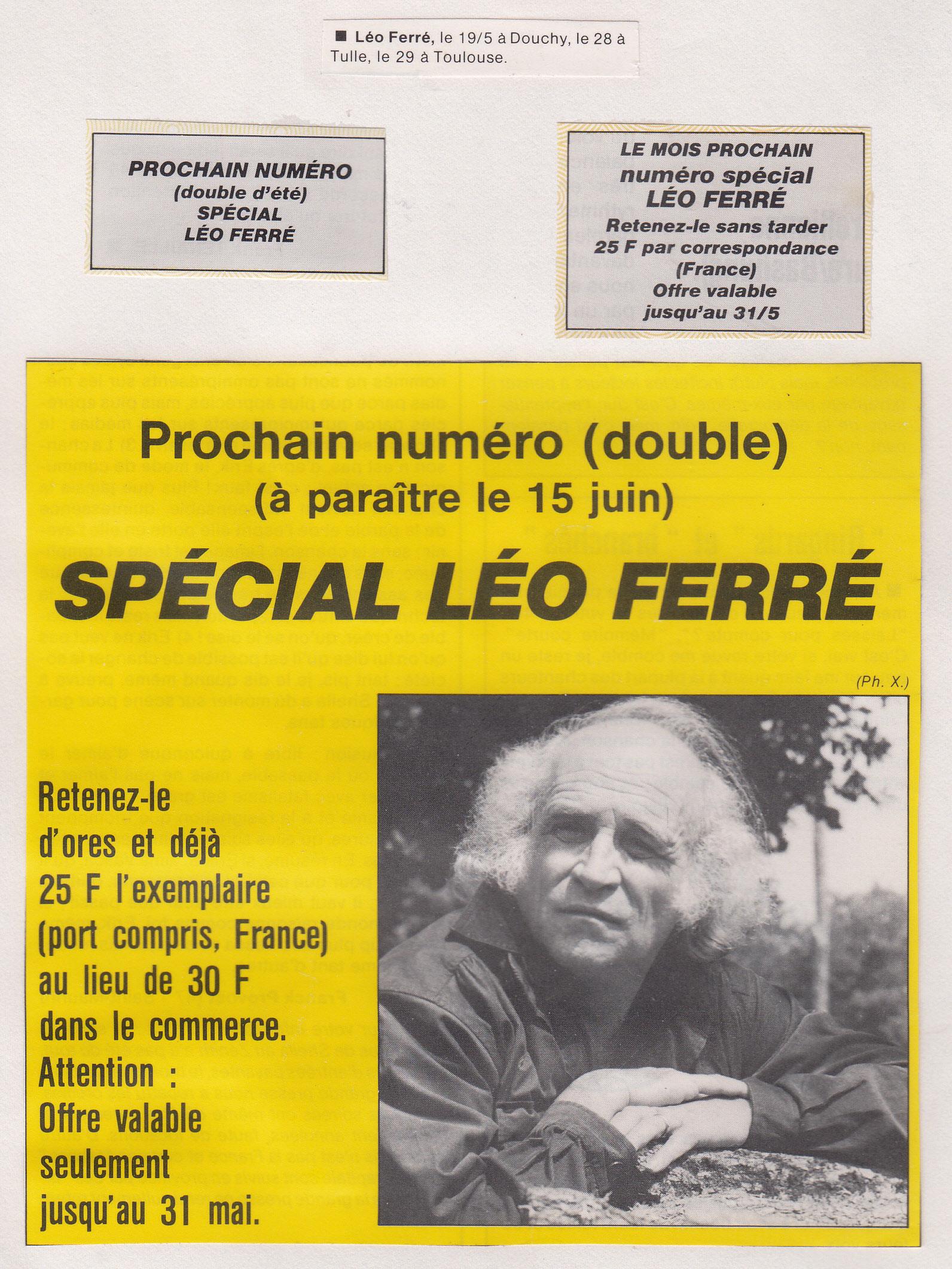 Ferré ne chante pas les textes inédits de Jean-Roger Caussimon qu'il vient de mettre en musique et qu'il a rassemblé dans un album RCA. Il n'a pas eu le temps de les apprendre par cœur. Il est tout le temps sur la route, avec Marie, sa compagne : pour des tours de chant ou des concerts, comme celui qu'il va diriger en mai prochain avec l'Orchestre de la RTB ou celui prévu en juillet avec l'Orchestre et les chœurs de Bratislava.