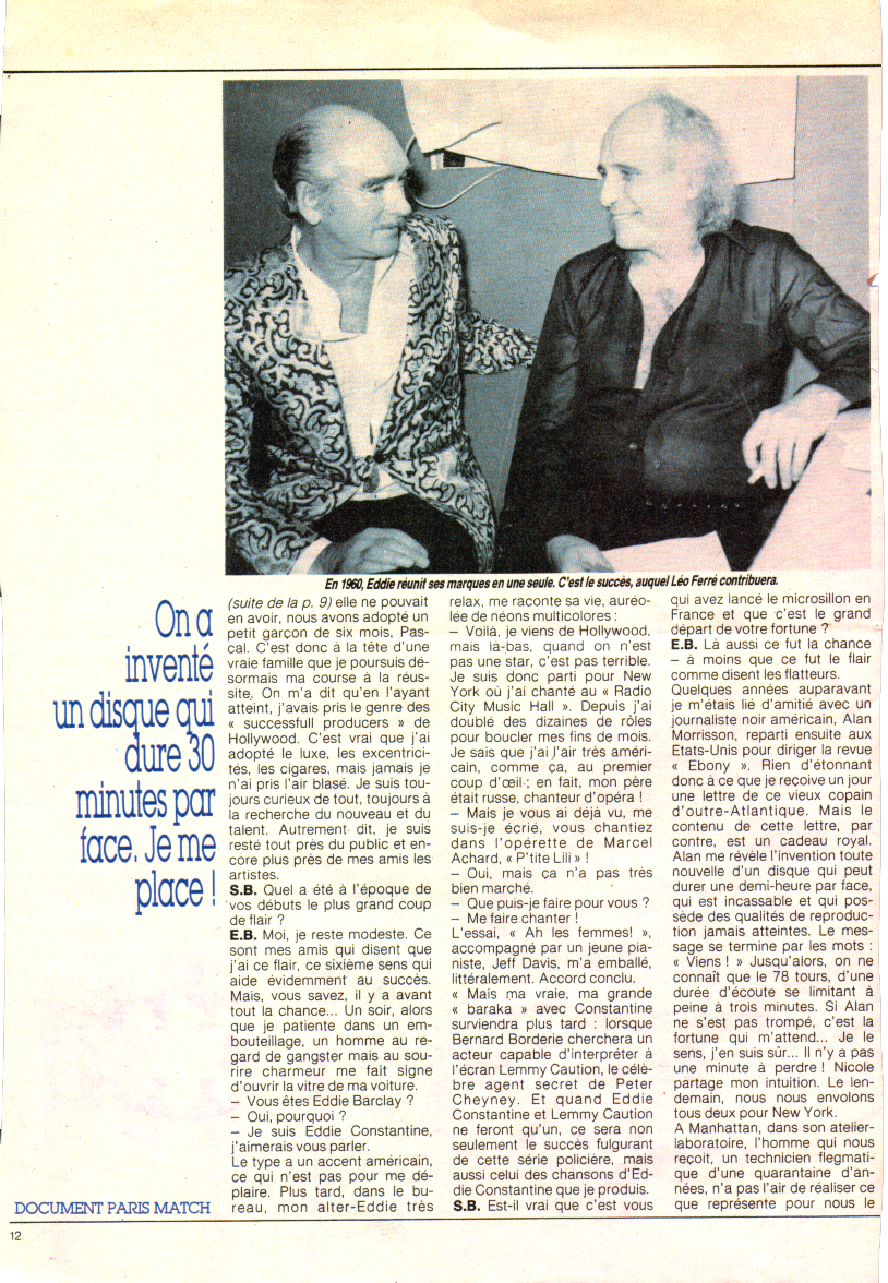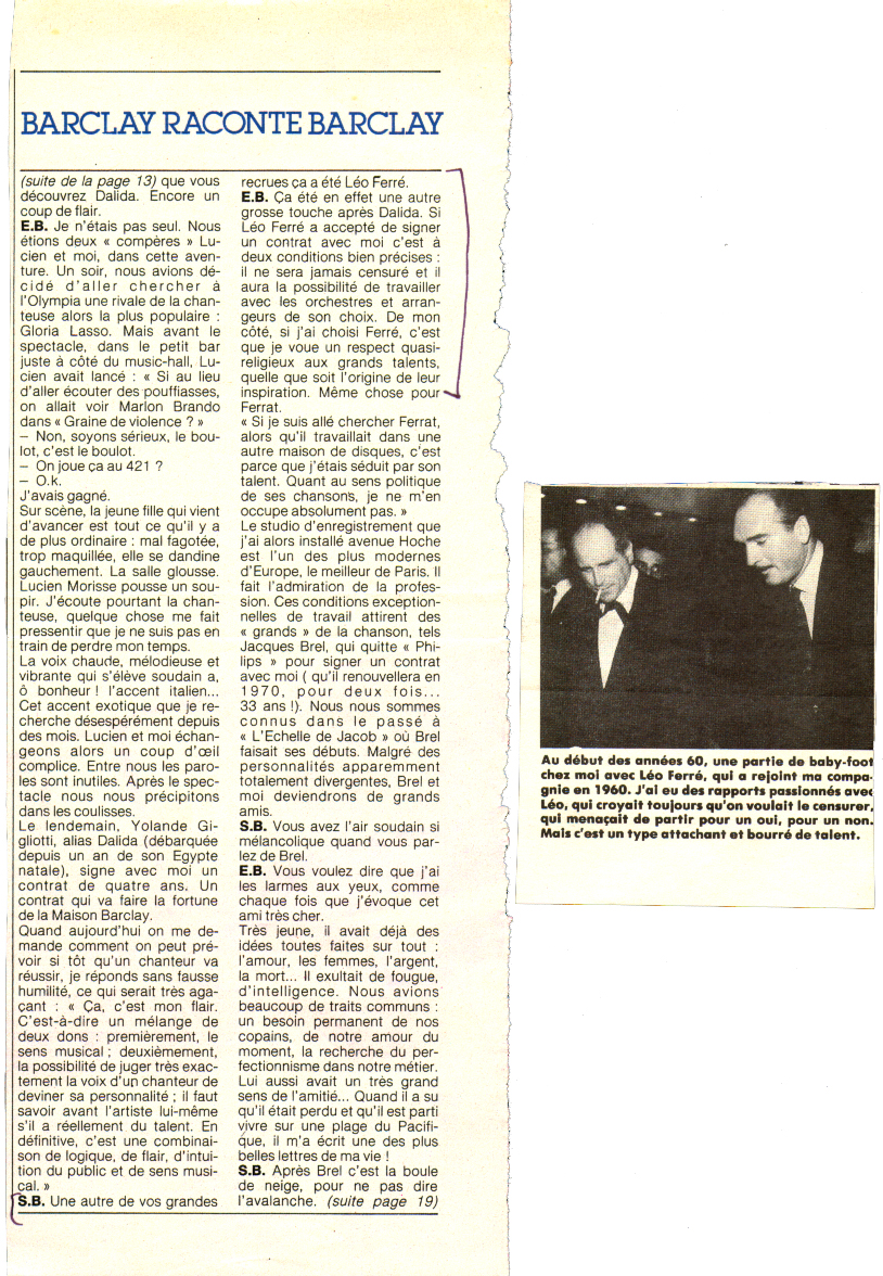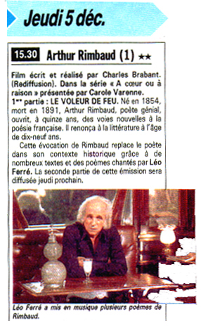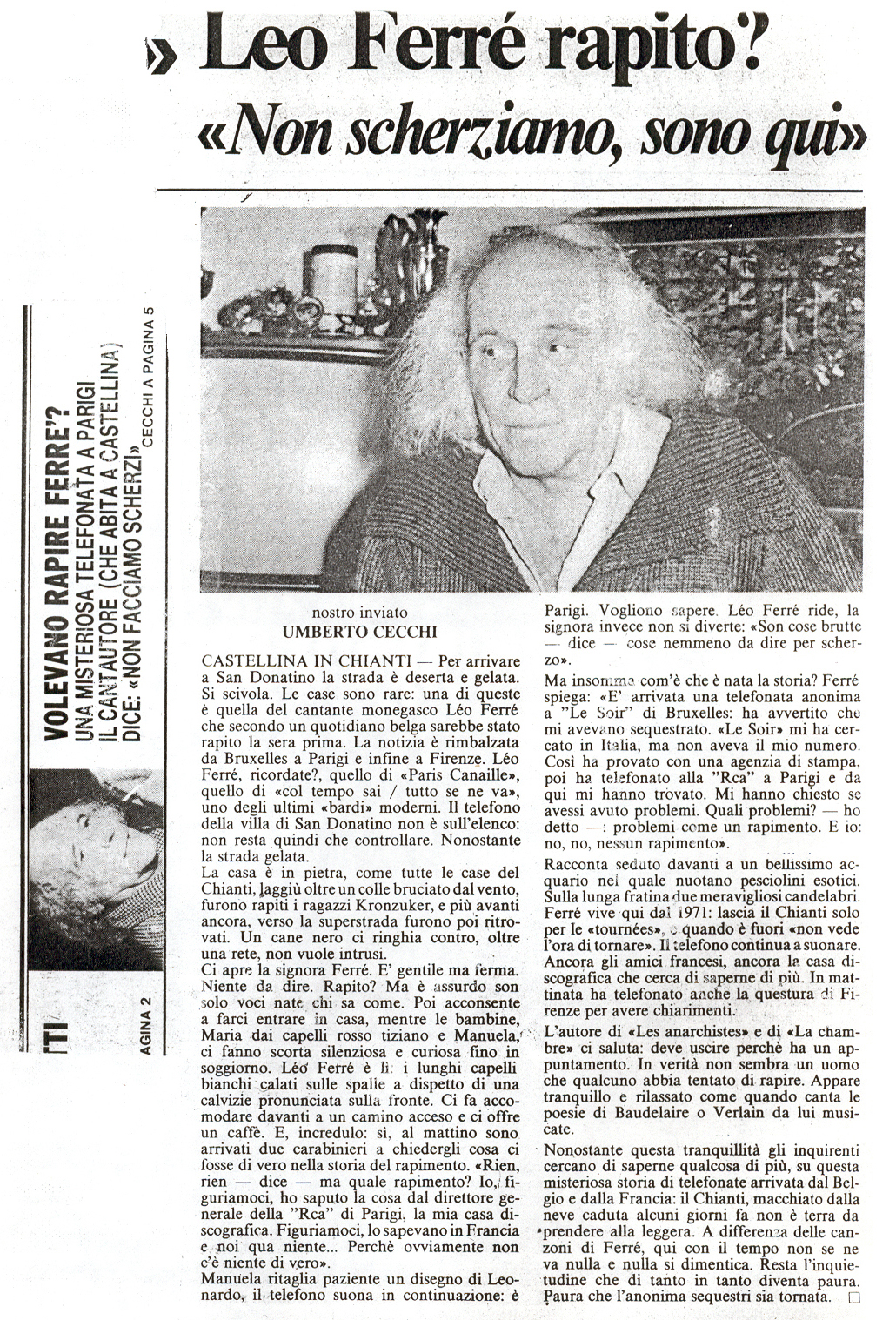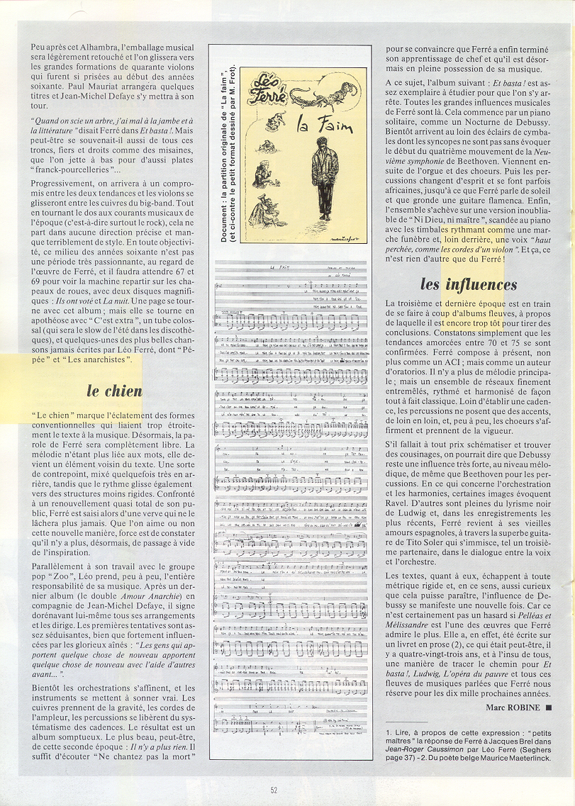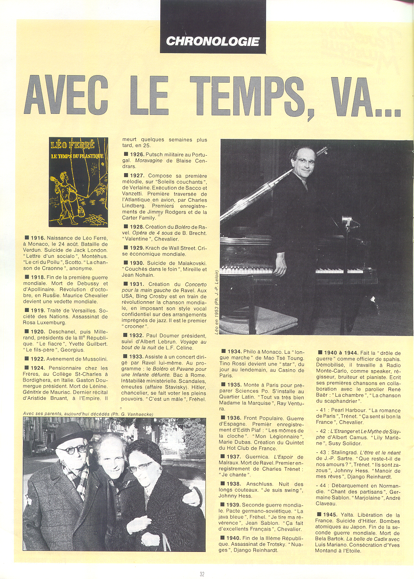 Ferré ne chante pas les textes inédits de Jean-Roger Caussimon qu'il vient de mettre en musique et qu'il a rassemblé dans un album RCA. Il n'a pas eu le temps de les apprendre par cœur. Il est tout le temps sur la route, avec Marie, sa compagne : pour des tours de chant ou des concerts, comme celui qu'il va diriger en mai prochain avec l'Orchestre de la RTB ou celui prévu en juillet avec l'Orchestre et les chœurs de Bratislava.