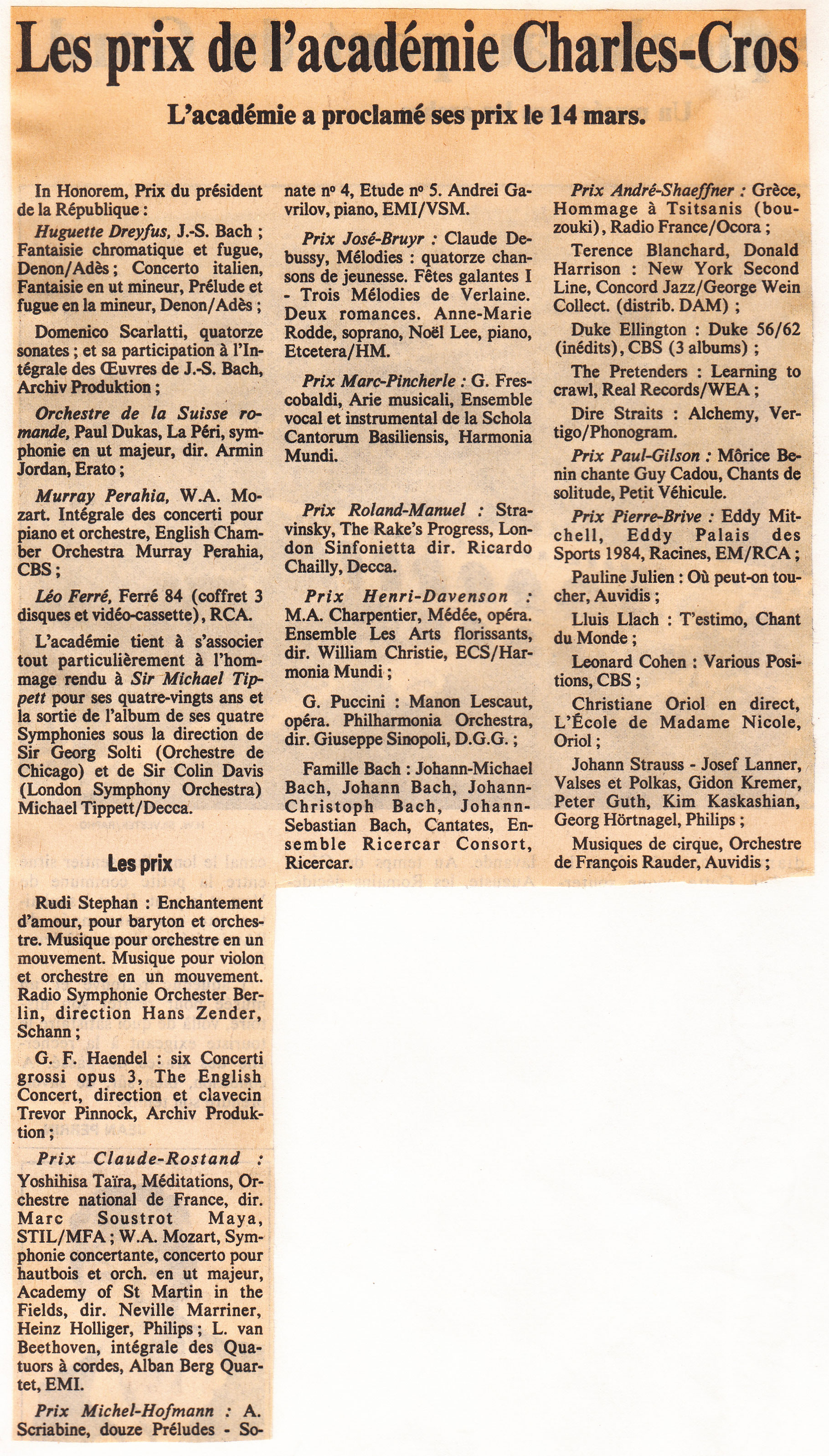 • Léo Ferré, Murray Perahia et Huguette Dreyfus au palmarès 85 de l'académis Charles Cros