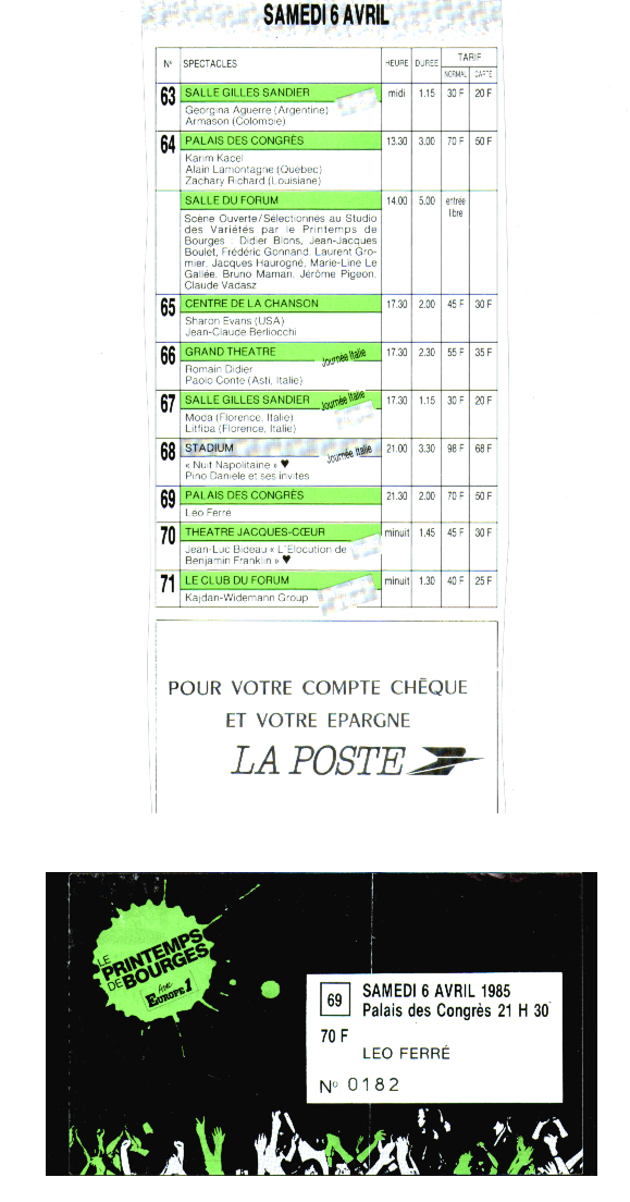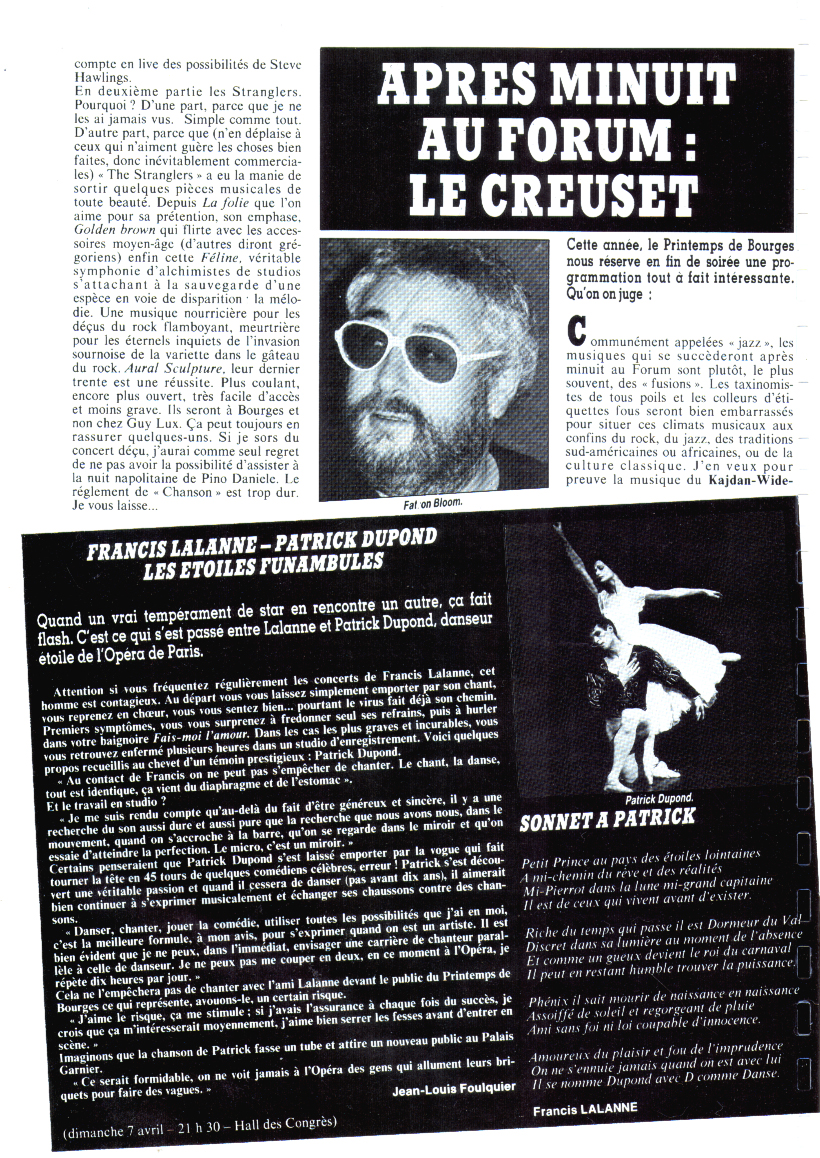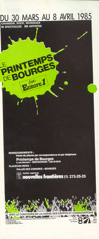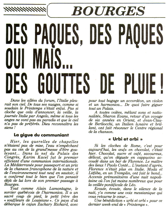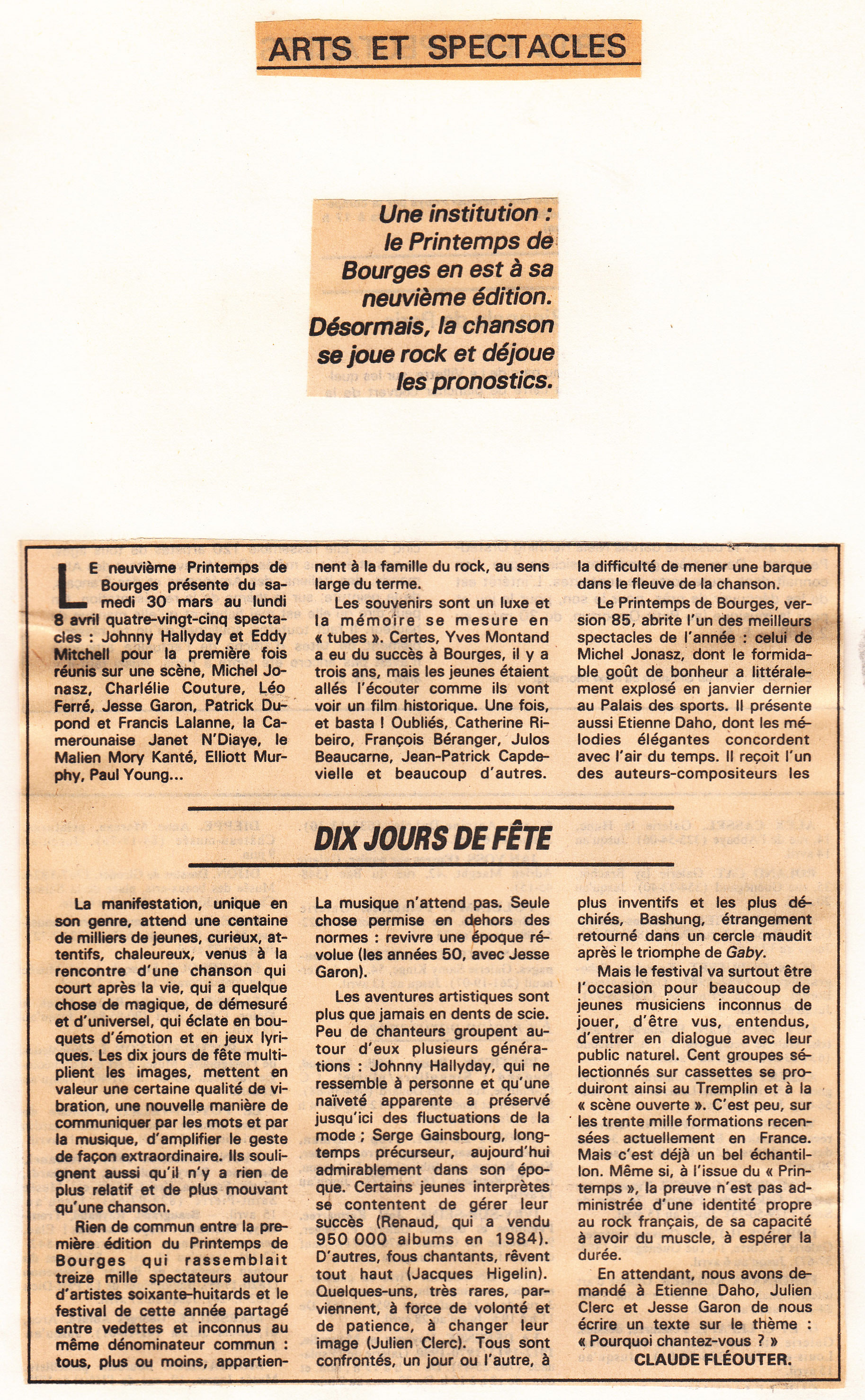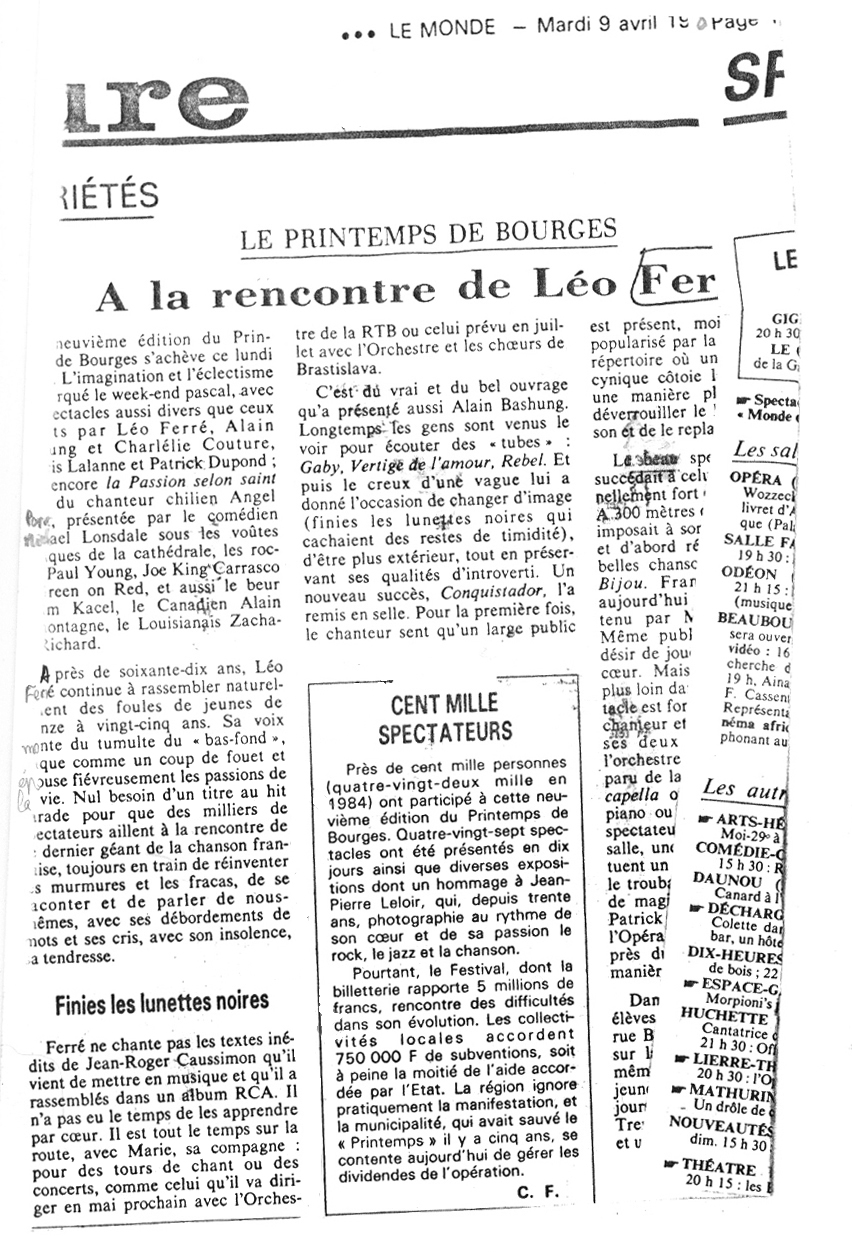 La neuvième édition du Printemps de Bourges s'achève ce lundi 8 avril. L'imagination et l'éclectisme ont marqué le week-end pascal, avec des spectacles aussi divers que ceux offerts par Léo Ferré, Alain Bashung et Charlélie Couture, Francis Lalanne et Patrick Dupond ; mais encore la Passion selon saint Jean du chanteur chilien Angel Parra, présentée par le comédien Michael Lonsdale sous les voûtes gothiques de la cathédrale, les rockers Paul Young, Joe King Carrasco et Green on Red, et aussi le beur Karim Kacel, le Canadien Alain Lamontagne, le Louisianais Zacharie Richard.