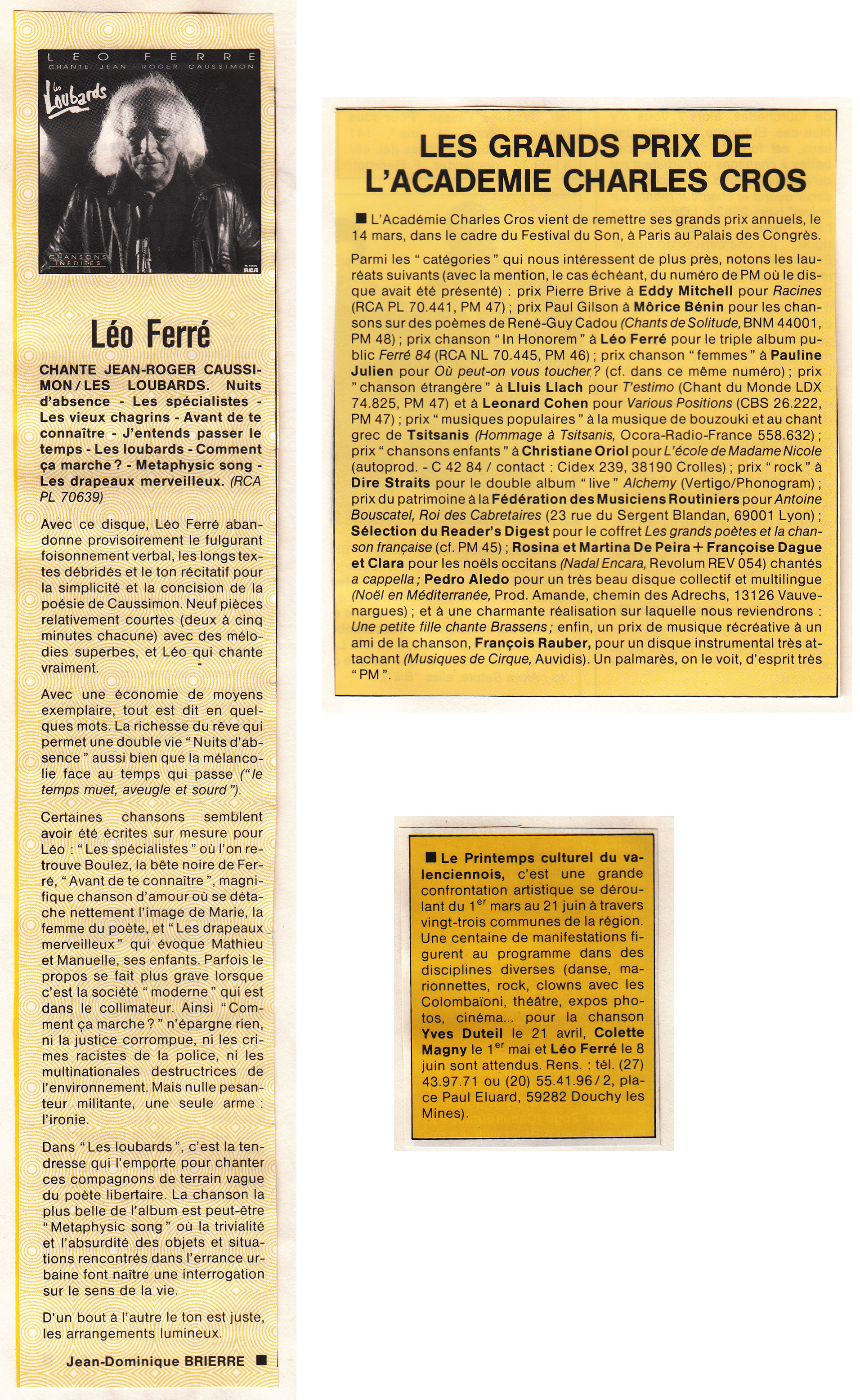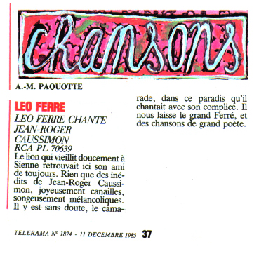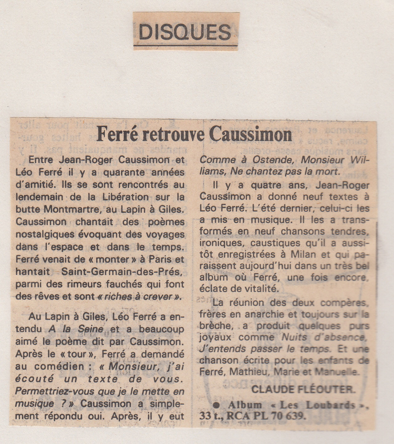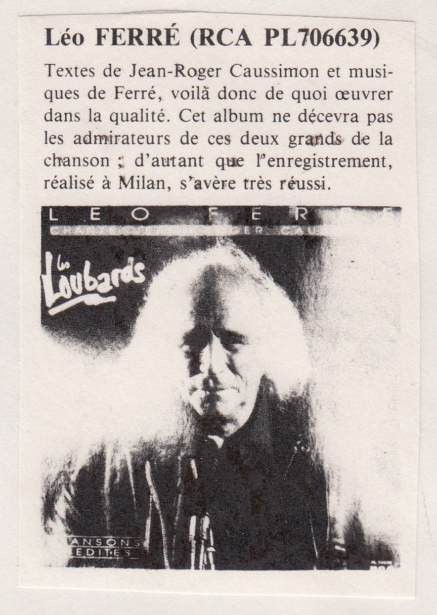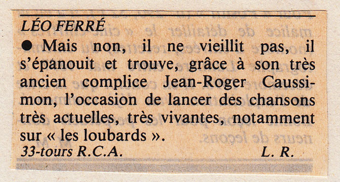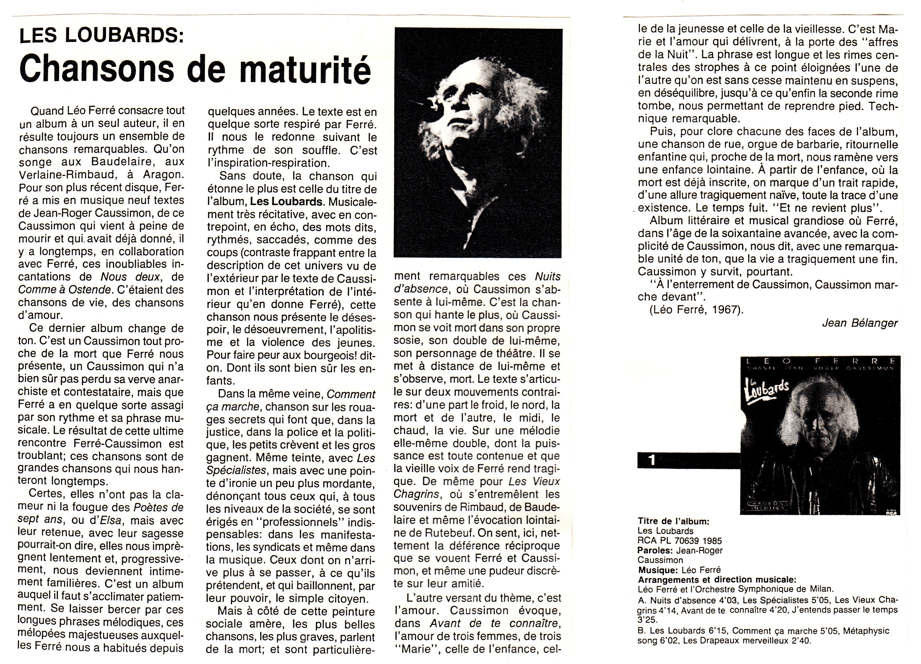 À la fois grave et léger, mélancolique et serein, limpide et mystérieux, symphonique mais retenu, empli de contrechants chiadés, parsemé de petites touches d'humour et de clins d'œil ludiques, ce calme effilochage des clameurs et des passions d'avant-hier émeut doucement mais sûrement, laissant dans l'équilibre des contraires toute sa place à une lucidité désabusée, qui n'exclut pas la tendresse. Pour un pas de côté c'est plutôt un pas en avant, un peu comme si Ferré s'autorisait via l'intercesseur Caussimon à entrer dans la saison automnale de la vie et à l'habiter de sa plénitude. Assurément une grande réussite, à (re)découvrir !