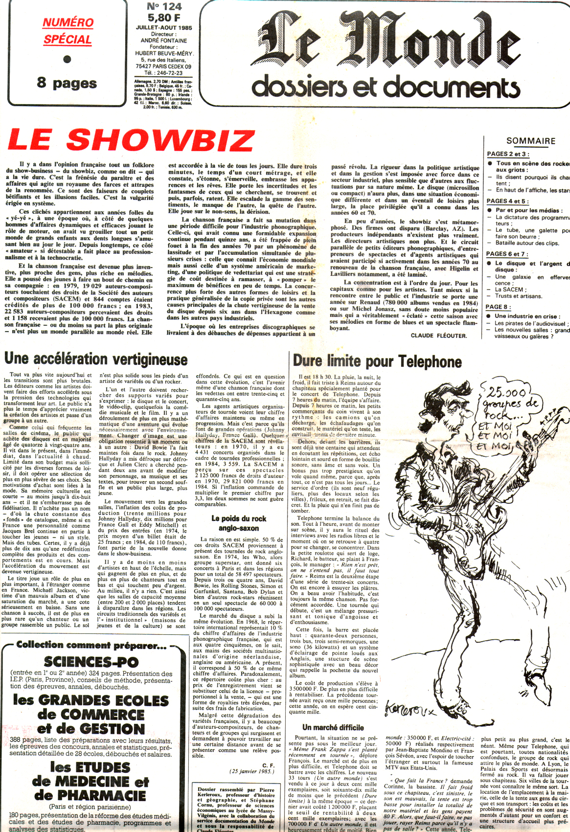 Le Monde Numéro spécial LE SHOWBIZ N°124 de Juillet/Août 1985