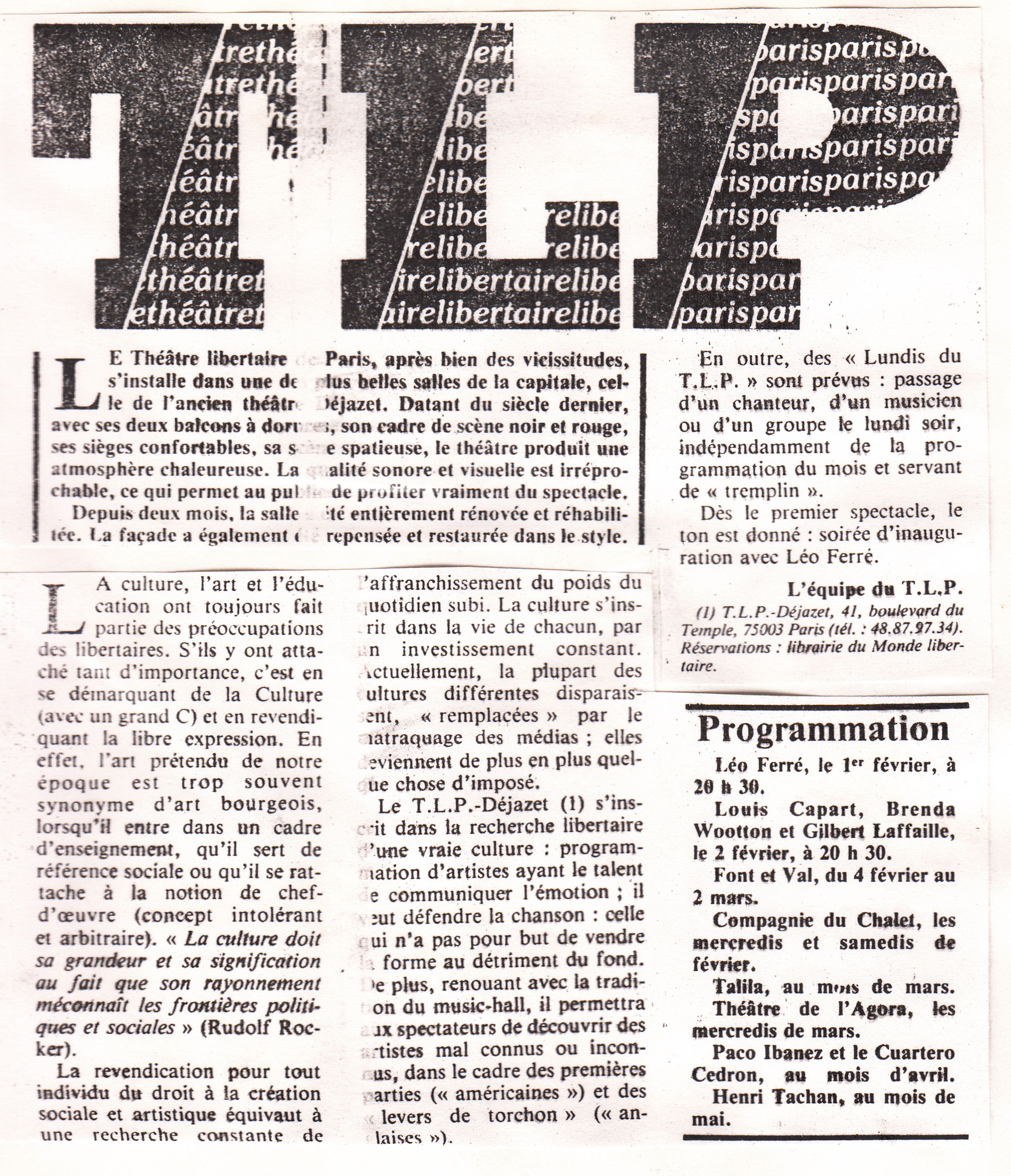 Avec d'autres amoureux de la chanson, parmi lesquels les militantes anarchistes Corinne Rousseau, Paulette Piedbois et le chanteur Alain Aurenche, ils entreprennent la restauration sous la supervision de l'architecte Antoine Monnet et de l'entrepreneur Claude Attienz. L'inauguration du Théâtre Libertaire de Paris ou TLP-Déjazet a lieu le 1er février 1986 avec une des plus grandes figures contestataires de la chanson, Léo Ferré. Le nom du théâtre ne sera toutefois pas divulgué sous cette forme à l'administration, les gérants préférant les appellations « Temple Loisirs Production », puis « Théâtre, Lyrique et Poésie » pour les sociétés exploitantes.