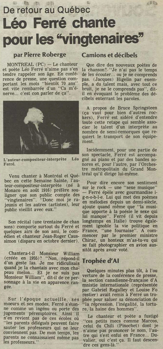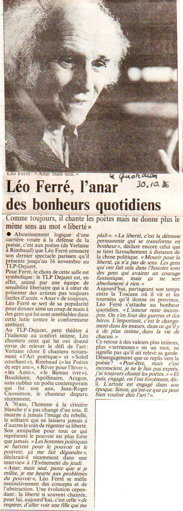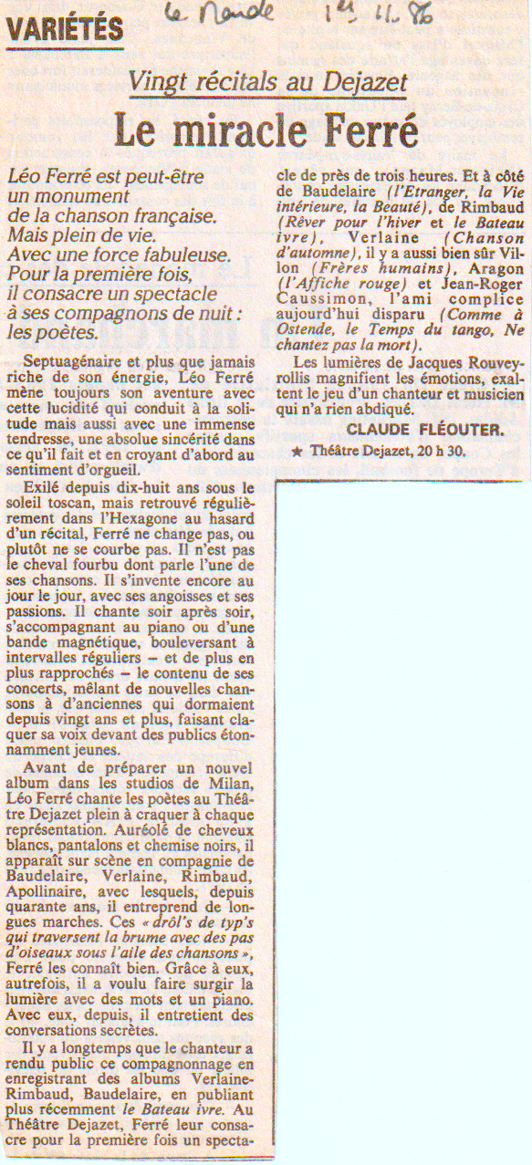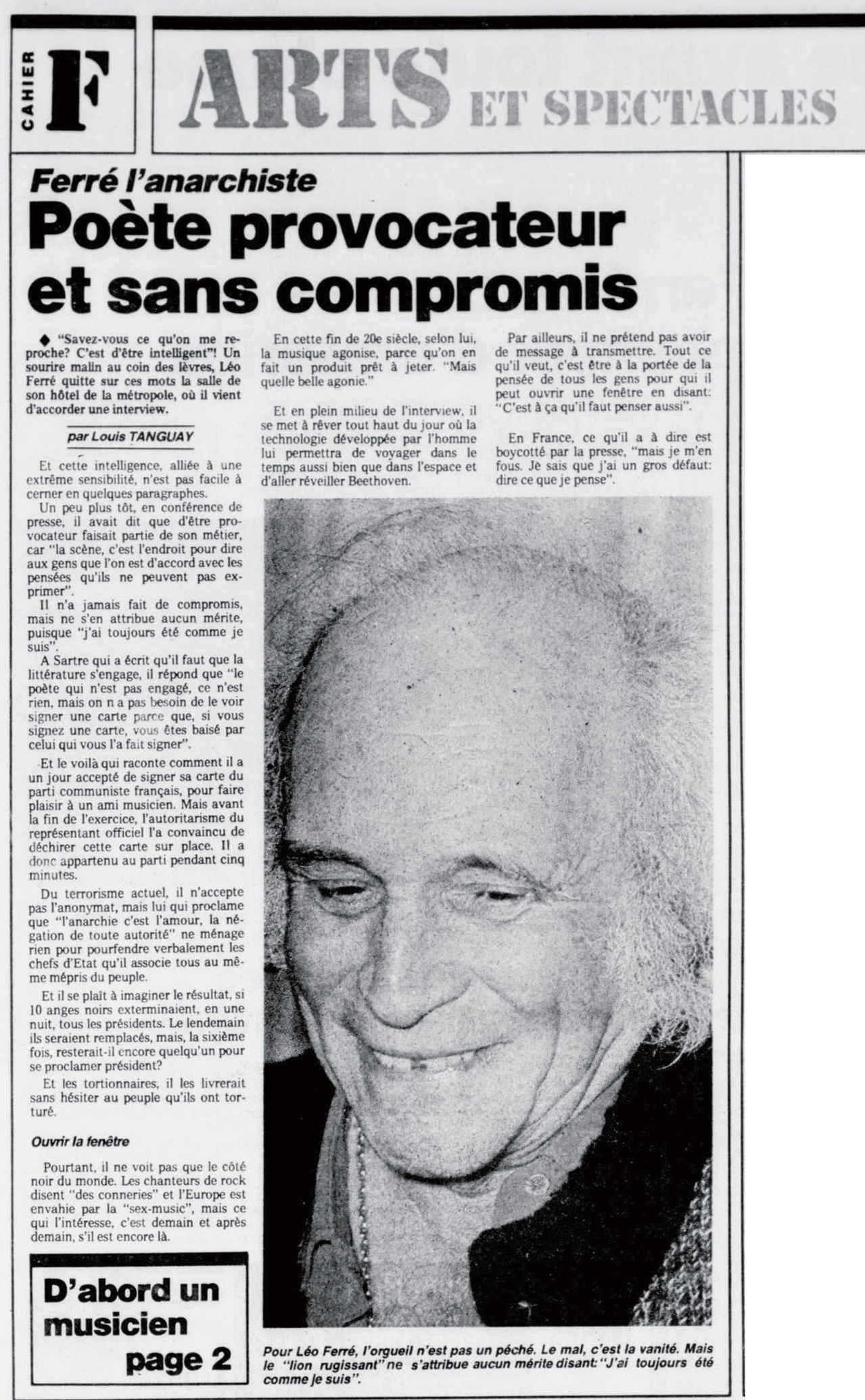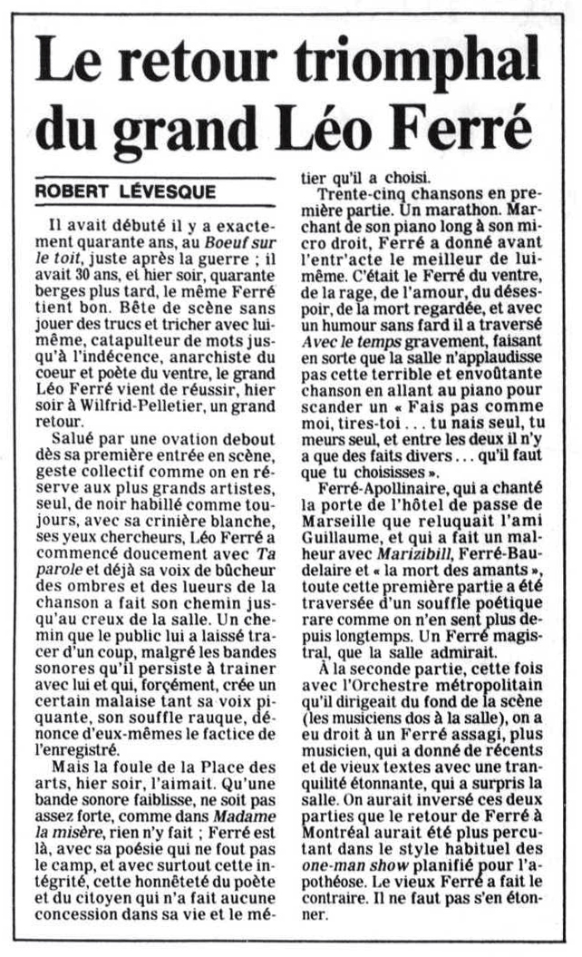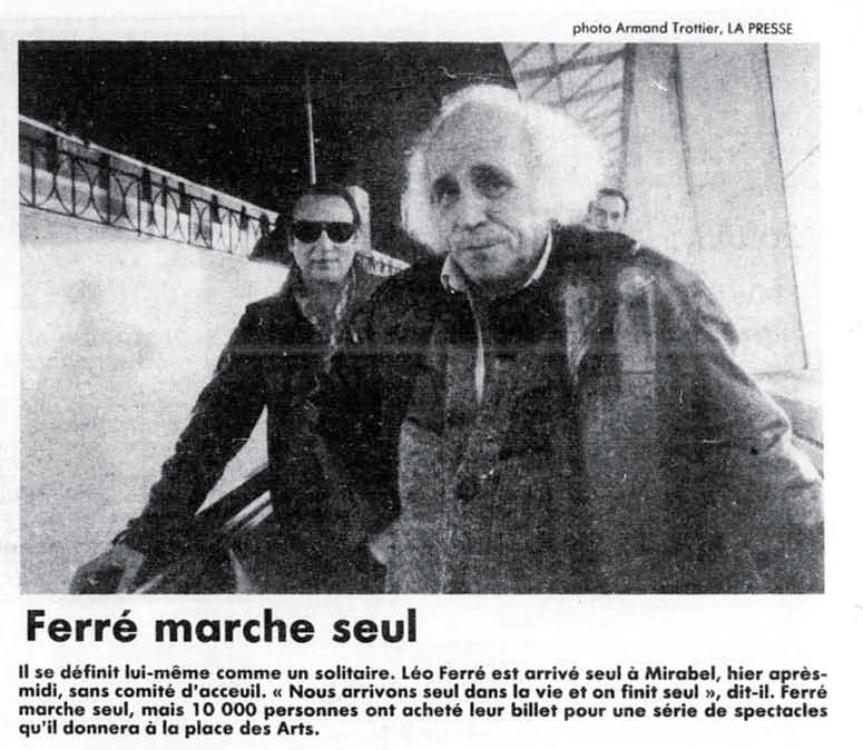 Exilé depuis dix-huit ans sous le soleil toscan, mais retrouvé régulièrement dans l'Hexagone au hasard d'un récital, Ferré ne change pas, ou plutôt ne se courbe pas. Il n'est pas le cheval fourbu dont parle l'une de ses chansons. Il s'invente encore au jour le jour, avec ses angoisses et ses passions. Il chante soir après soir, s'accompagnant au piano ou d'une bande magnétique, bouleversant à intervalles réguliers - et de plus en plus rapprochés - le contenu de ses concerts, mêlant de nouvelles chansons à d'anciennes qui dormaient depuis vingt ans et plus, faisant claquer sa voix devant des publics étonnamment jeunes.