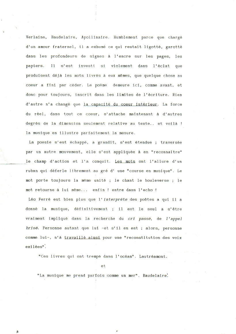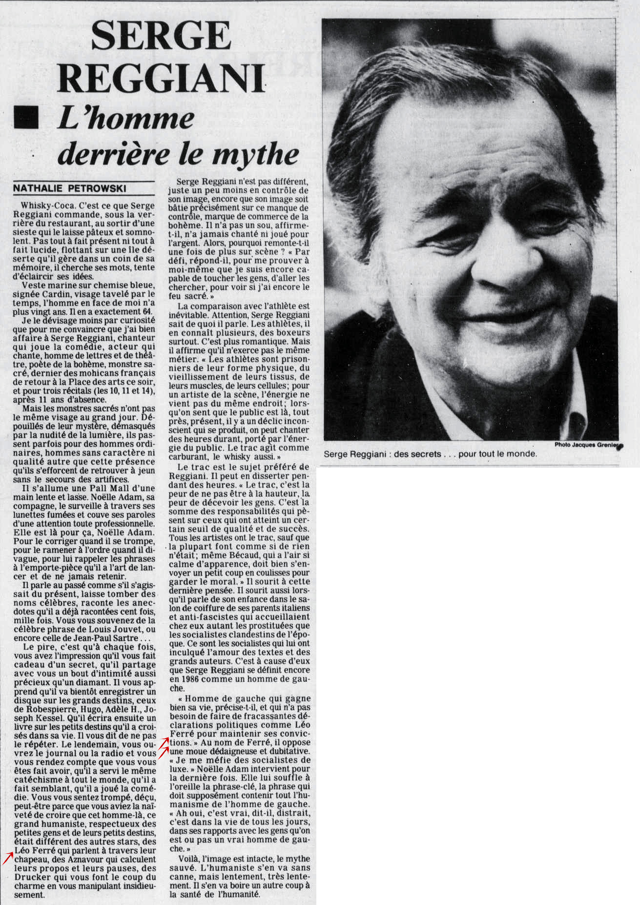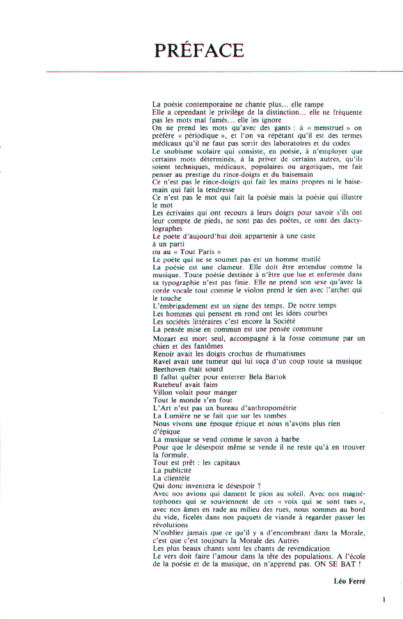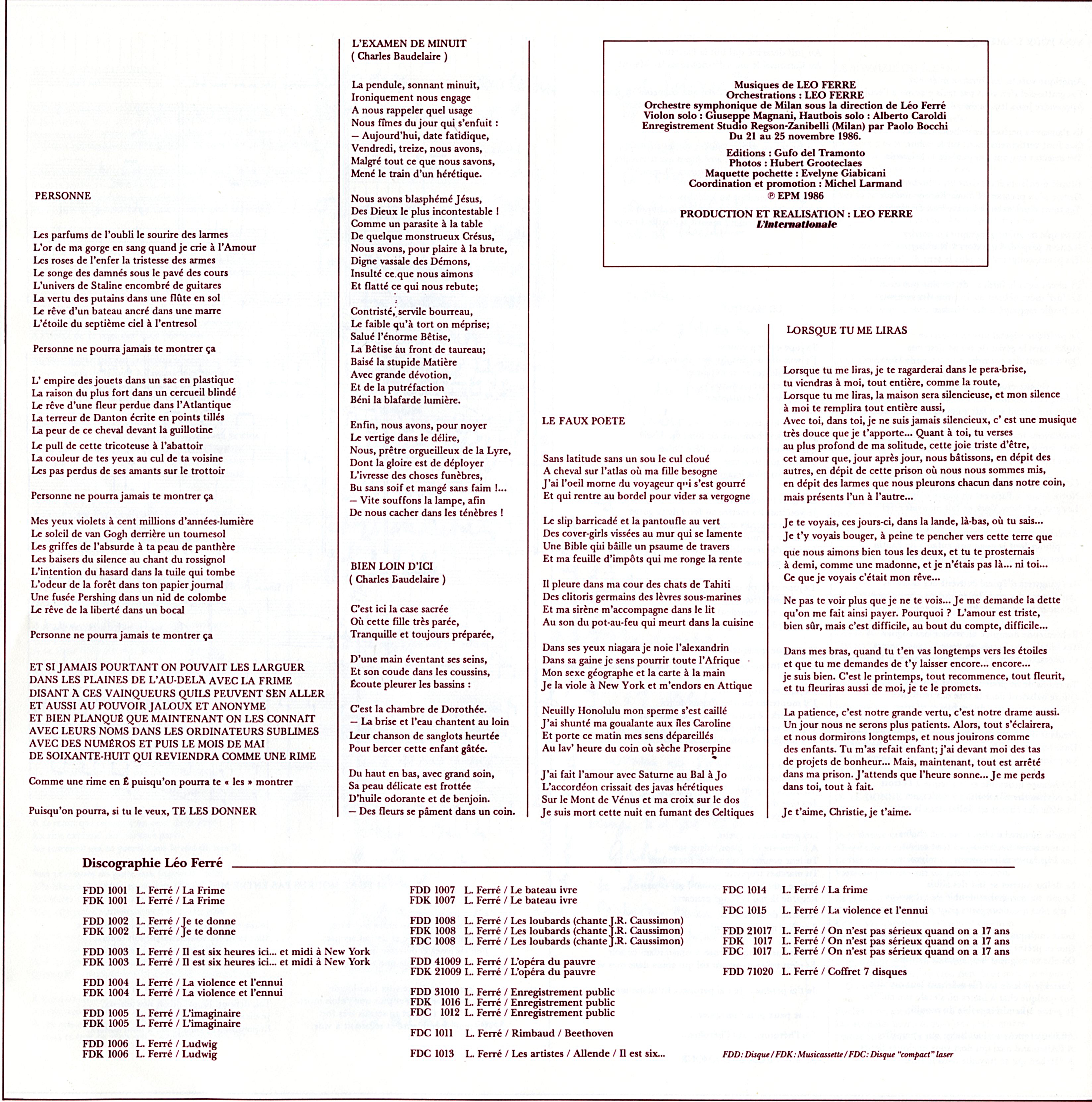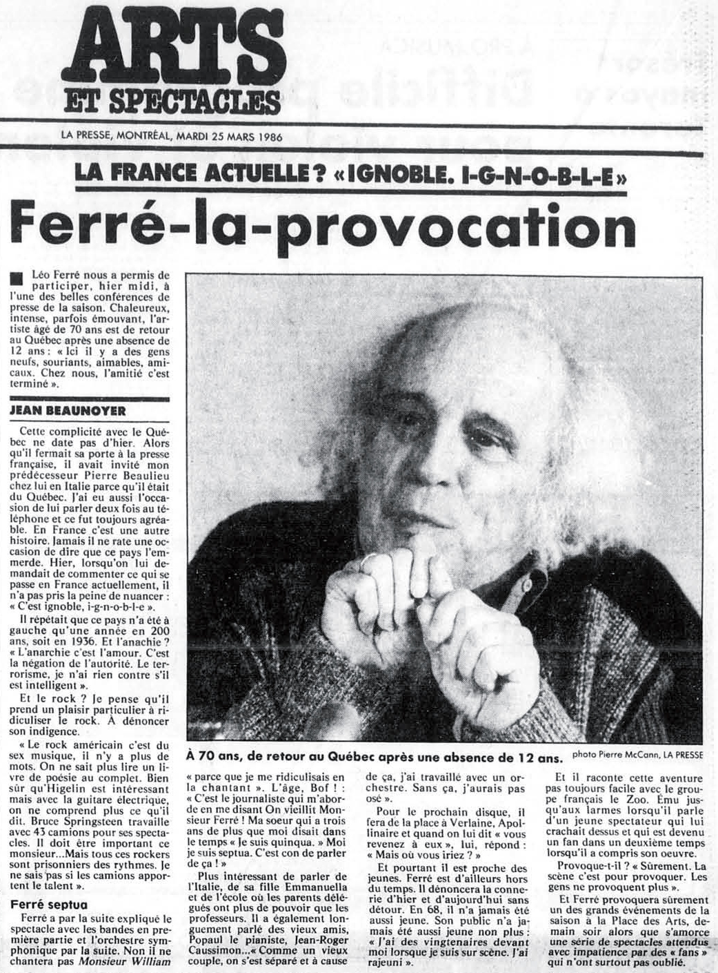 Exilé depuis dix-huit ans sous le soleil toscan, mais retrouvé régulièrement dans l'Hexagone au hasard d'un récital, Ferré ne change pas, ou plutôt ne se courbe pas. Il n'est pas le cheval fourbu dont parle l'une de ses chansons. Il s'invente encore au jour le jour, avec ses angoisses et ses passions. Il chante soir après soir, s'accompagnant au piano ou d'une bande magnétique, bouleversant à intervalles réguliers - et de plus en plus rapprochés - le contenu de ses concerts, mêlant de nouvelles chansons à d'anciennes qui dormaient depuis vingt ans et plus, faisant claquer sa voix devant des publics étonnamment jeunes.