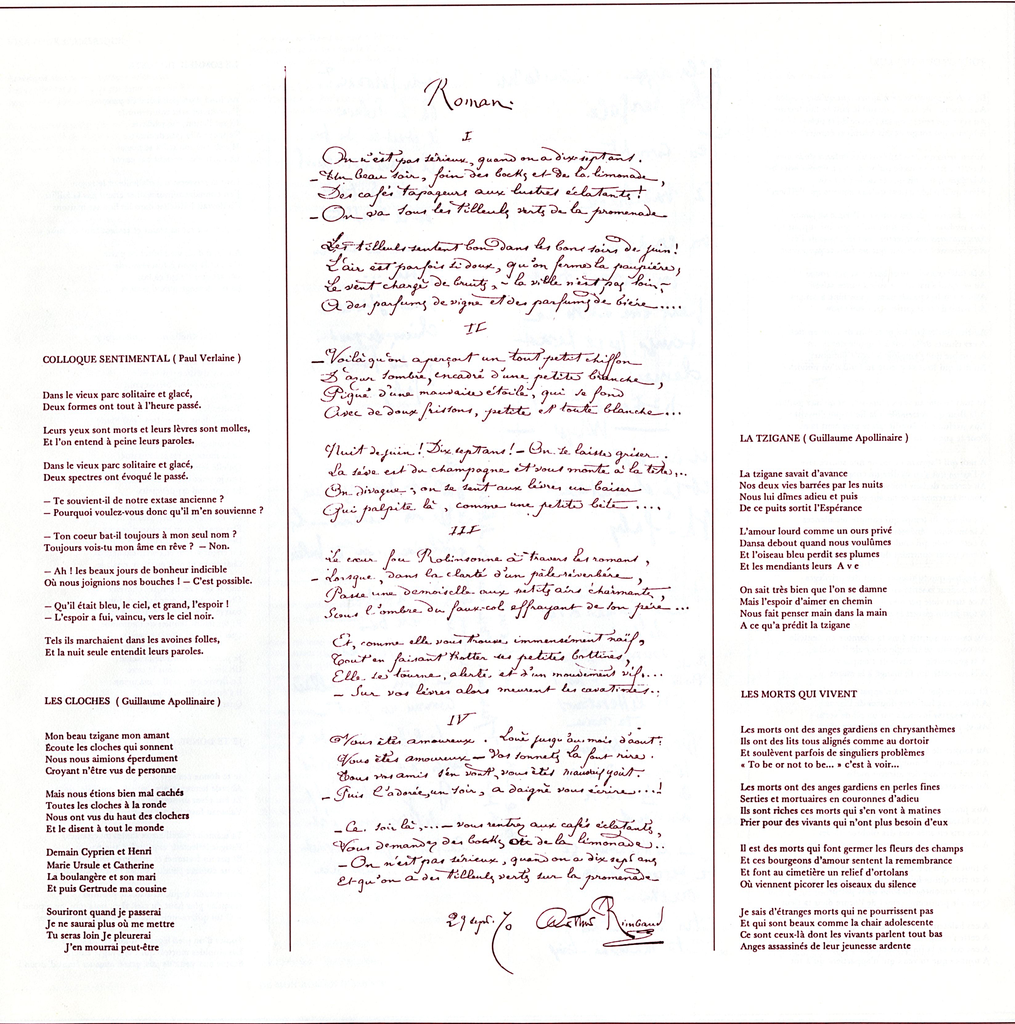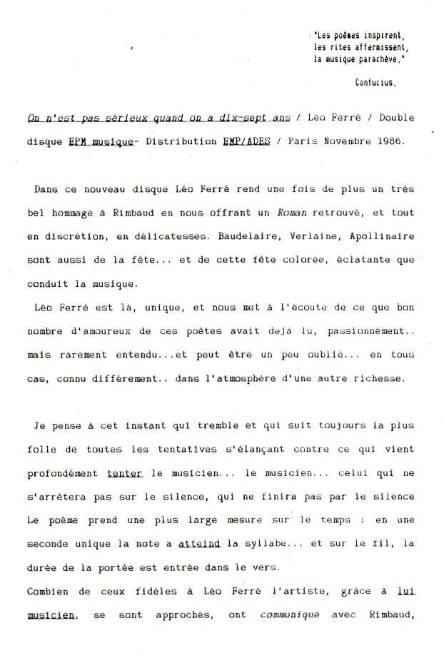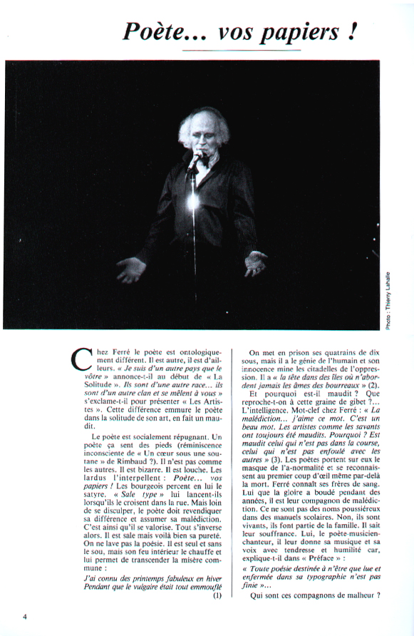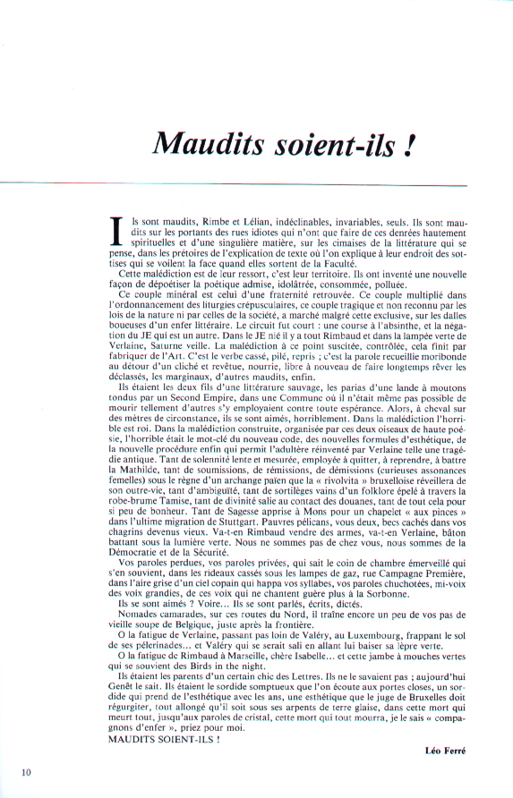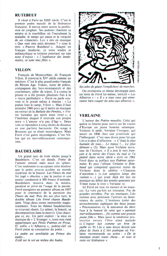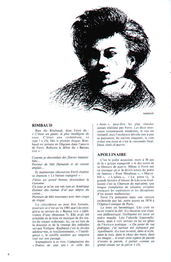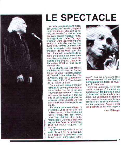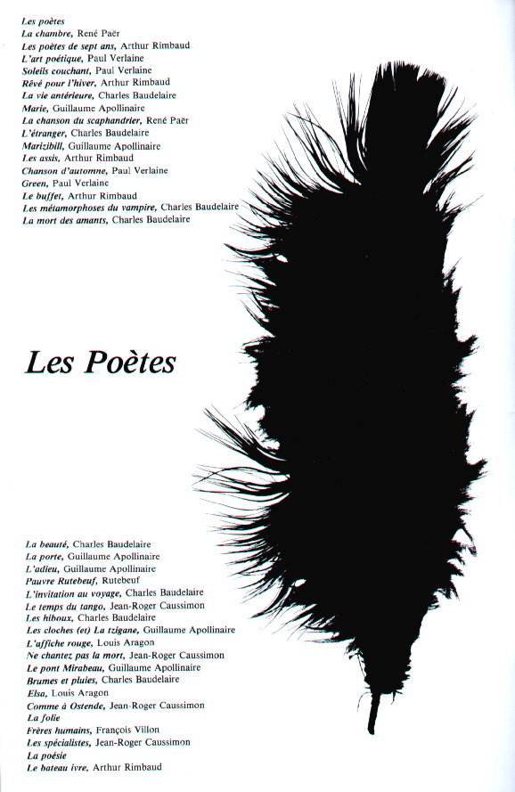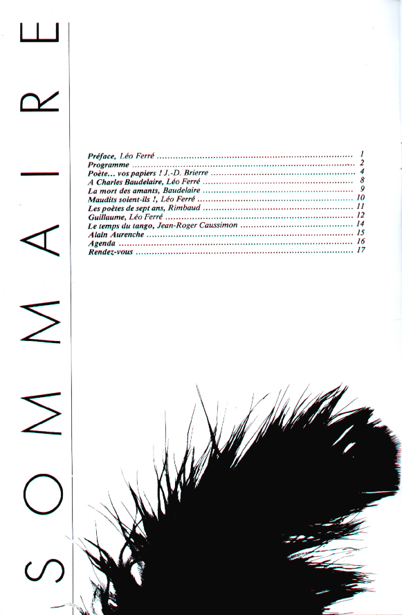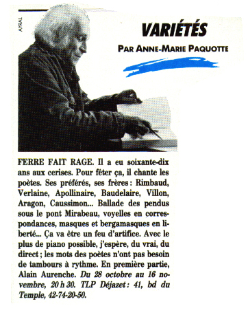 Il y a longtemps que le chanteur a rendu public ce compagnonnage en enregistrant des albums Verlaine-Rimbaud, Baudelaire, en publiant plus récemment le Bateau ivre. Au Théâtre Dejazet, Ferré leur consacre pour la première fois un spectacle de près de trois heures. Et à côté de Baudelaire (l'Etranger, la Vie intérieure, la Beauté), de Rimbaud (Rêver pour l'hiver et le Bateau ivre), Verlaine (Chanson d'automne), il y a aussi bien sûr Villon (Frères humains), Aragon (l'Affiche rouge) et Jean-Roger Caussimon, l'ami complice aujourd'hui disparu (Comme à Ostende, le Temps du tango. Ne chantez pas la mort).