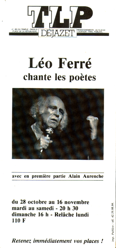 Avant de préparer un nouvel album dans les studios de Milan, Léo Ferré chante les poètes au Théâtre Dejazet plein à craquer à chaque représentation. Auréolé de cheveux blancs, pantalons et chemise noirs, il apparaît sur scène en compagnie de Baudelaire, Verlaine, Rimbaud, Apollinaire, avec lesquels, depuis quarante ans, il entreprend de longues marches. Ces "drôl's de typ's qui traversent la brume avec des pas d'oiseaux sous l'aile des chansons ", Ferré les connaît bien. Grâce à eux, autrefois, il a voulu faire surgir la lumière avec des mots et un piano. Avec eux, depuis, il entretient des conversations secrètes.
