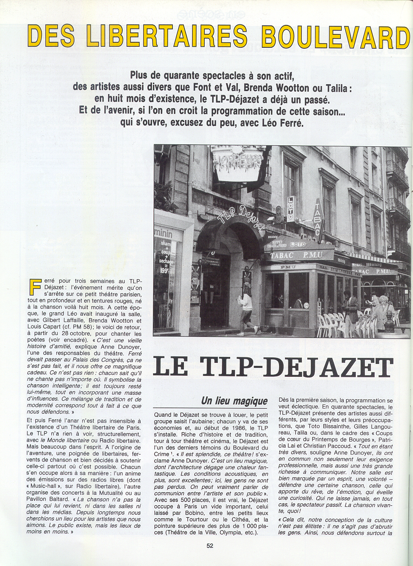 Au début des années 1980, Joël-Jacky Julien, musicien de jazz à l'initiative de la création de Radio libertaire (89,4 MHz), la radio de la Fédération anarchiste, et Hervé Trinquier, musicien classique à l'origine de l'achat de la librairie de cette même Fédération (145, rue Amelot, Paris XIe) et organisateurs de nombreux galas de soutien à Radio libertaire, décident d'ouvrir une salle de spectacle. Depuis l'amitié qui liait Proudhon à Courbet, le mouvement anarchiste a en effet toujours été proche du milieu artistique. C'est par hasard qu'un de leurs amis, Bernard Lavilliers - qui lui-même recherchait une salle pour ouvrir une école du spectacle - leur apprend en 1985 que le Déjazet serait à reprendre. Julien et Trinquier signent peu de temps après avec Jean Bouquin un contrat de location-gérance. Les clés leur sont remises le 1er décembre.
