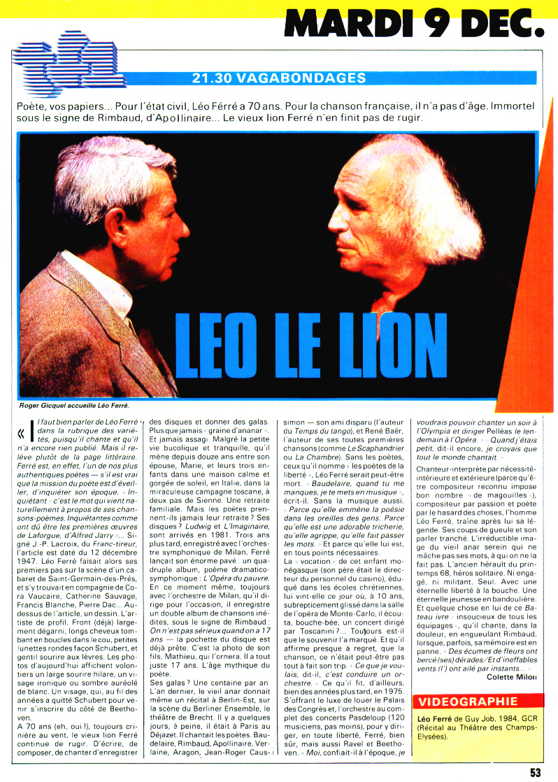 Septuagénaire et plus que jamais riche de son énergie, Léo Ferré mène toujours son aventure avec cette lucidité qui conduit à la solitude mais aussi avec une immense tendresse, une absolue sincérité dans ce qu'il fait et en croyant d'abord au sentiment d'orgueil.