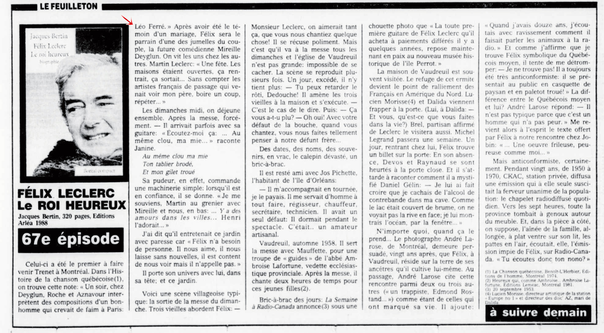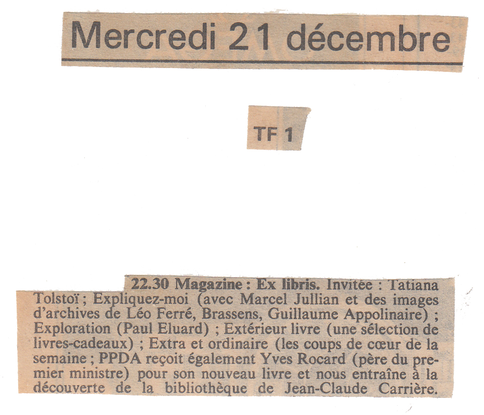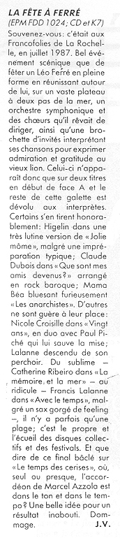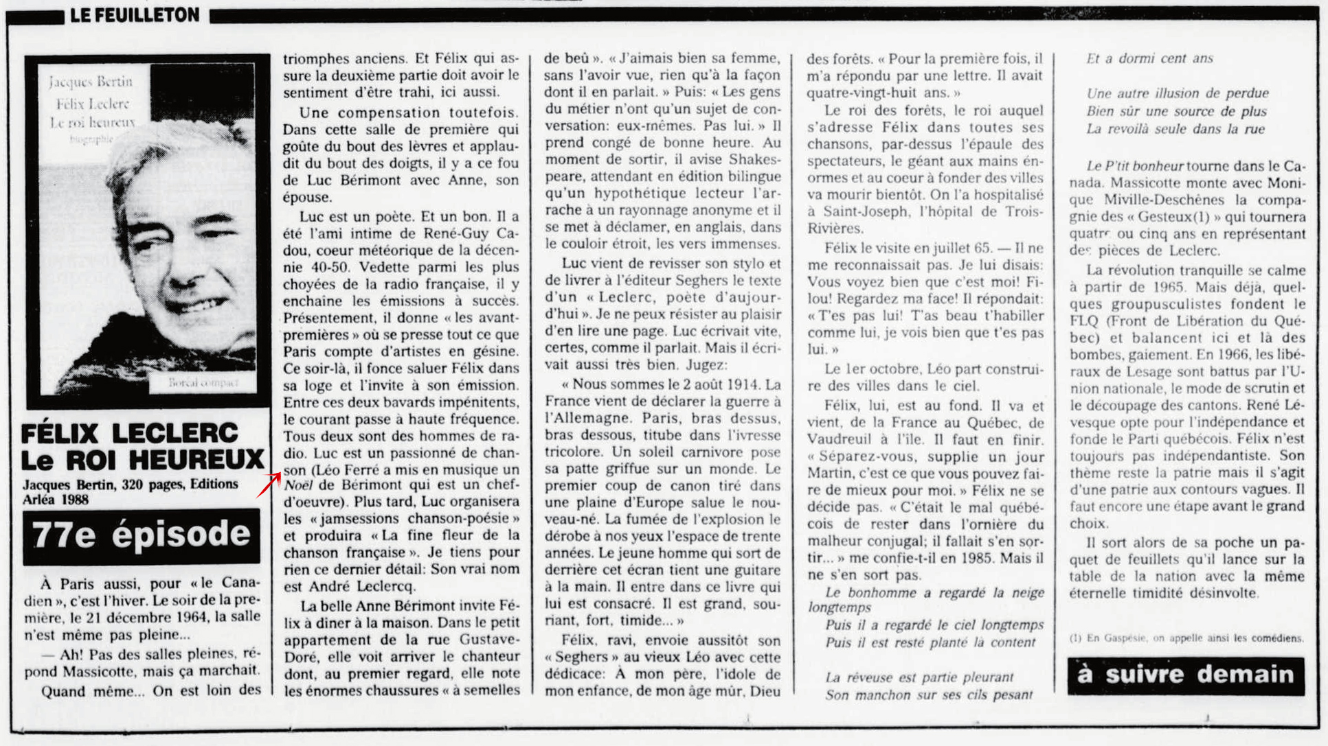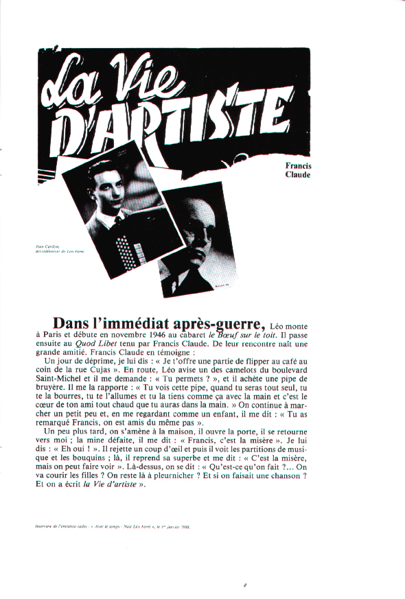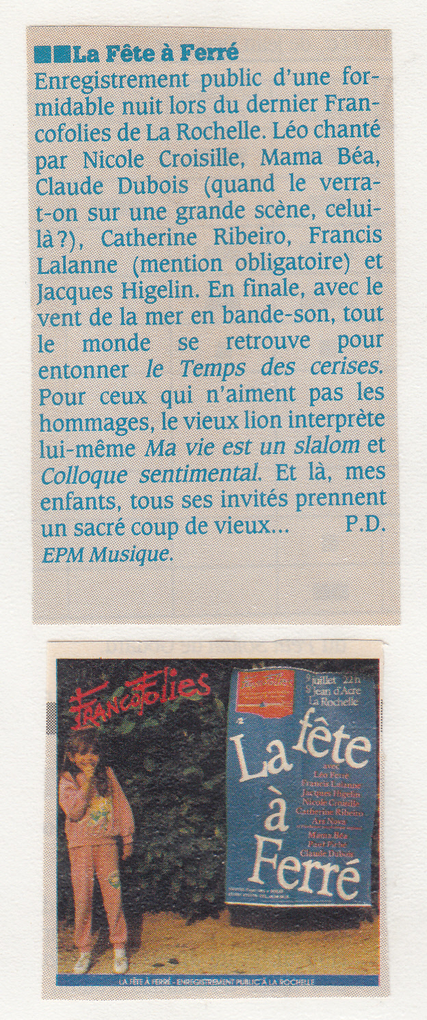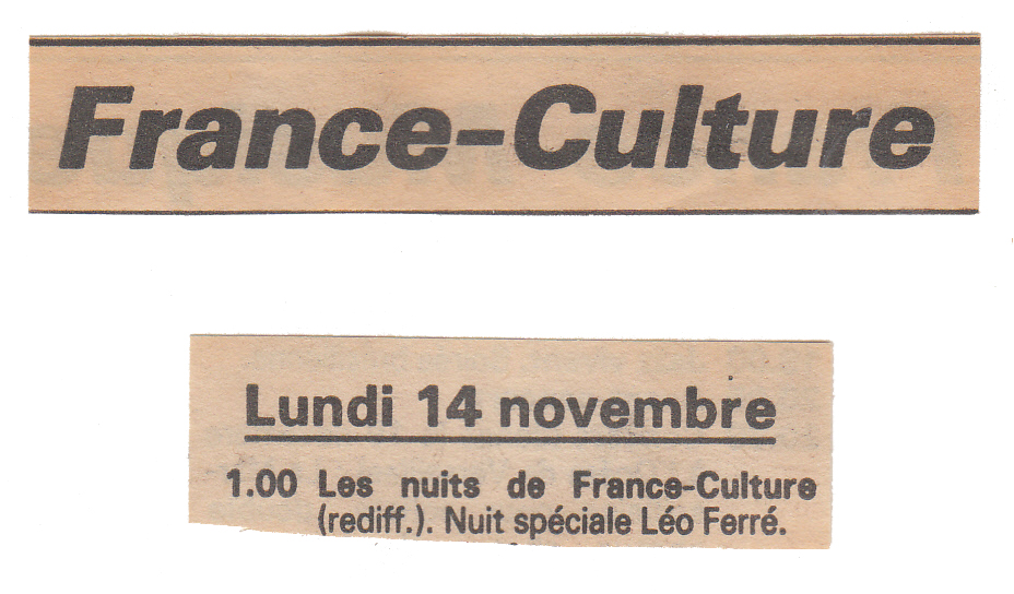 01.01 : Pendant le réveillon du nouvel an, invité de France-Culture au cours de l'émission Avec le temps - Une nuit avec Léo Ferré de 1h à 7h de Marc Legras et Louis-Jean Calvet (interview publiée dans le spécial Ferré de Chorus n° 8 été 1994).