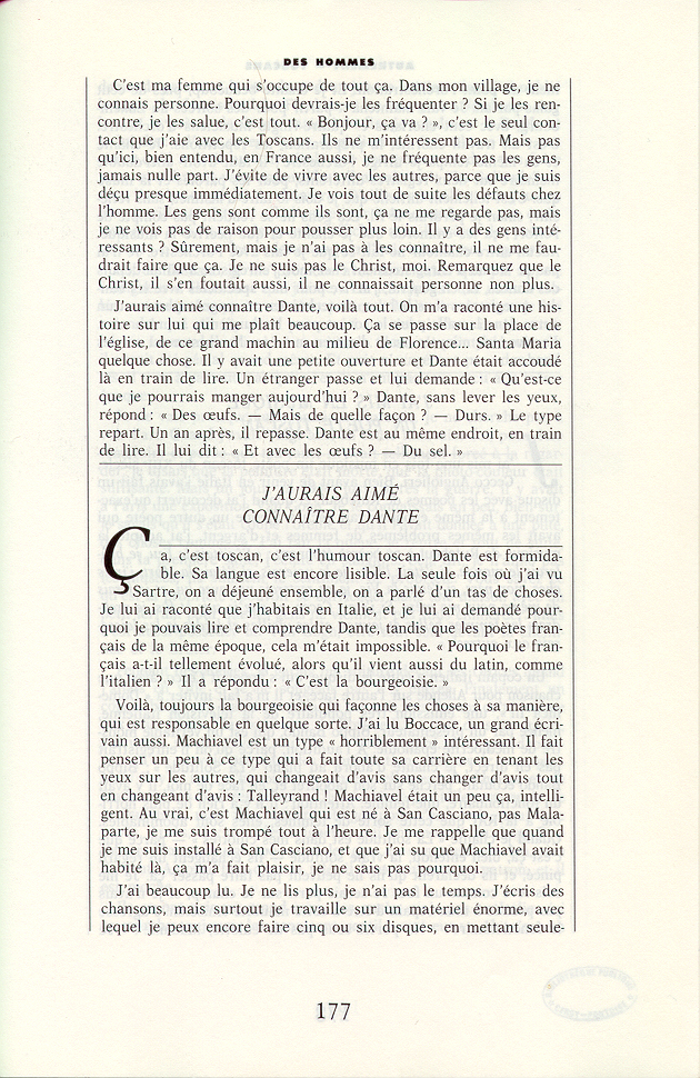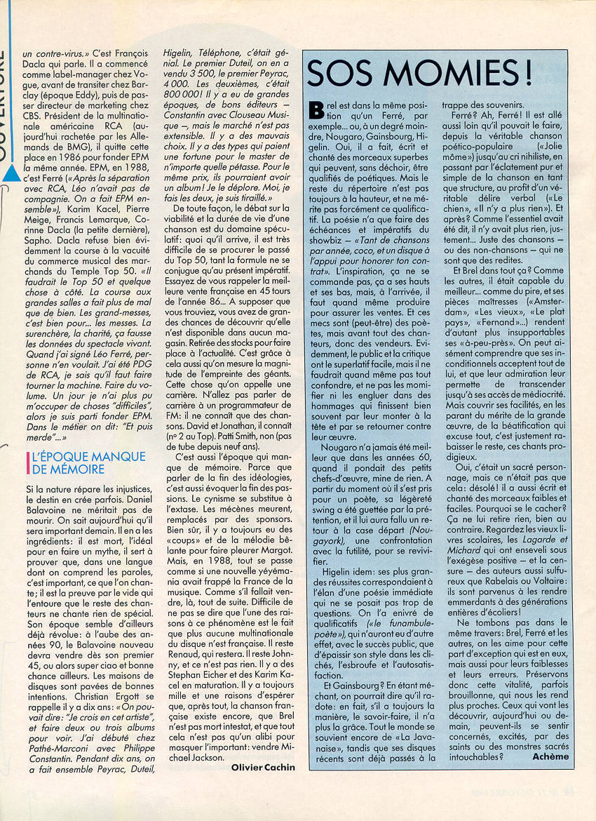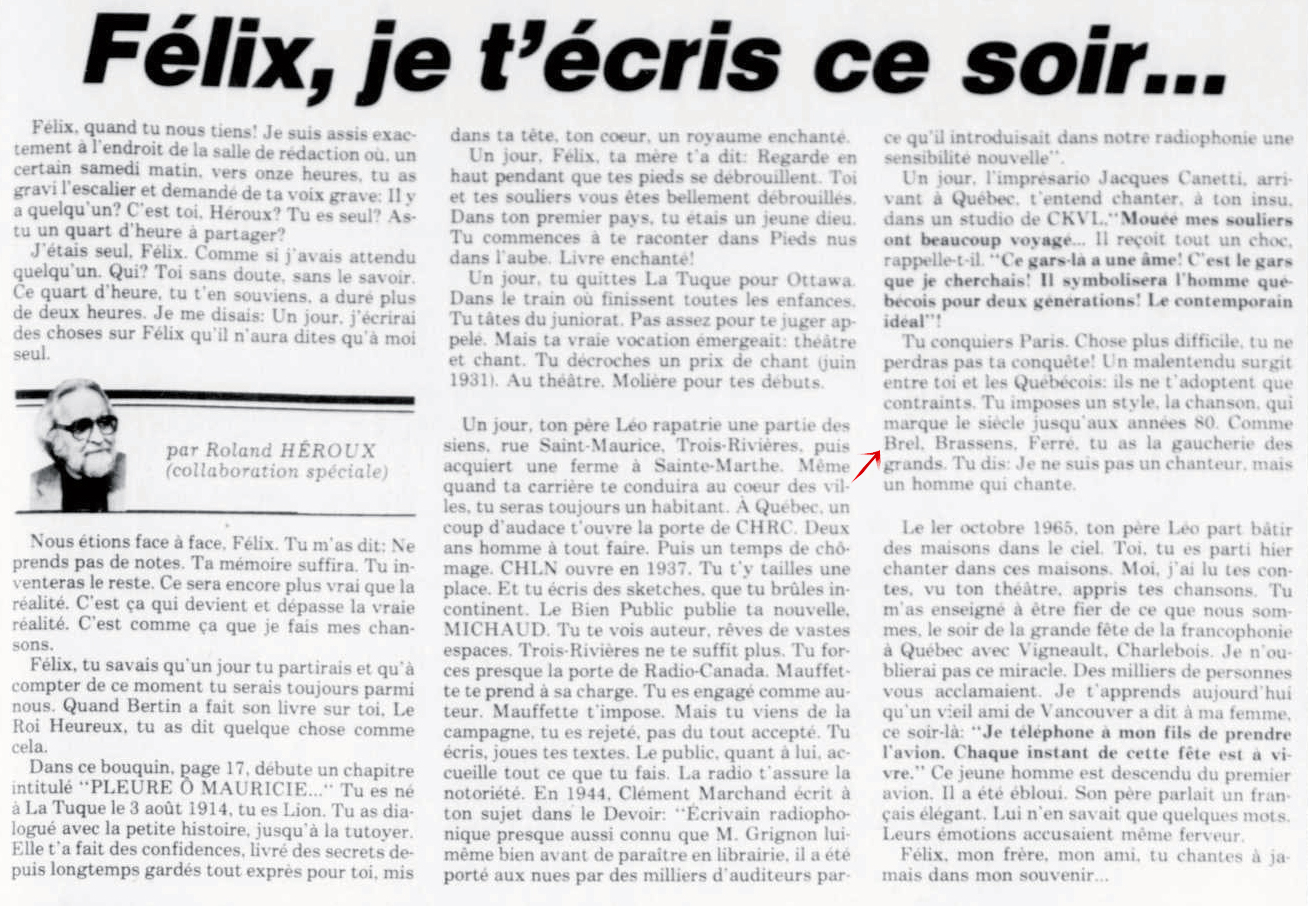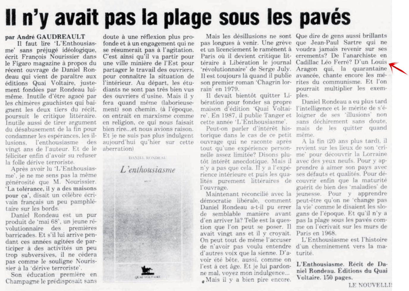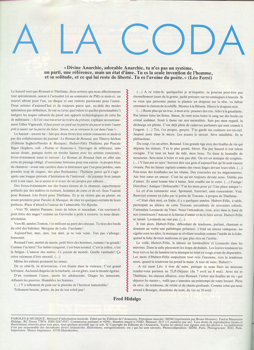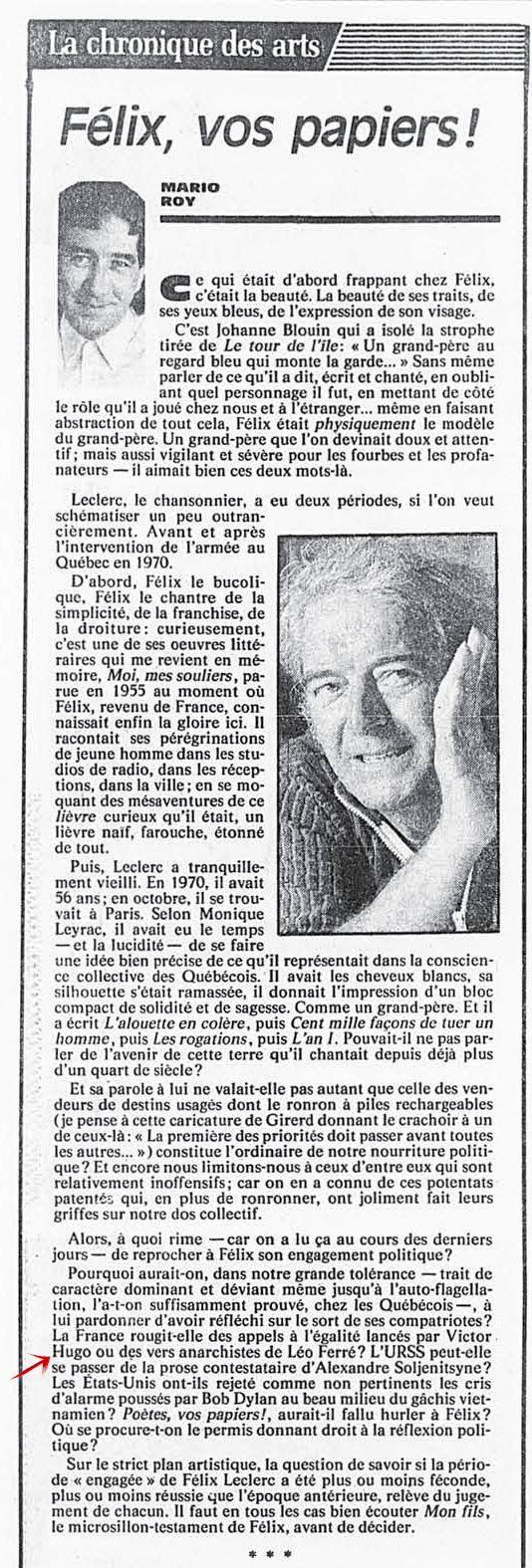 01.01 : Pendant le réveillon du nouvel an, invité de France-Culture au cours de l'émission Avec le temps - Une nuit avec Léo Ferré de 1h à 7h de Marc Legras et Louis-Jean Calvet (interview publiée dans le spécial Ferré de Chorus n° 8 été 1994).