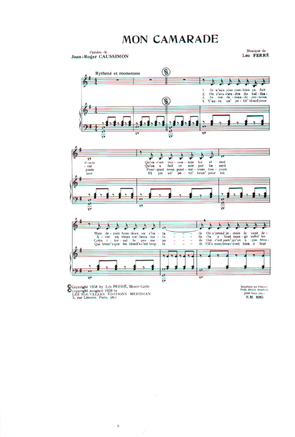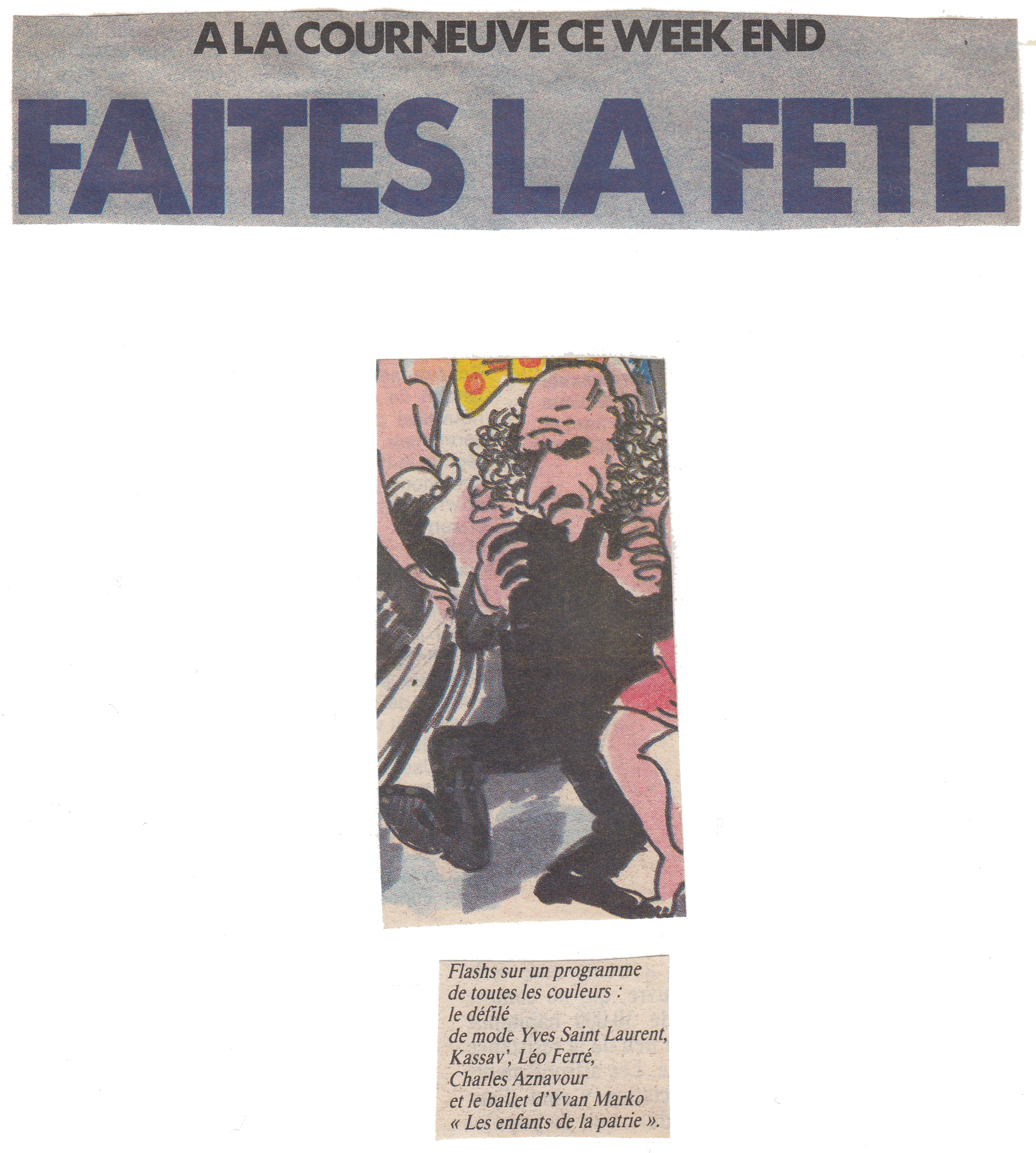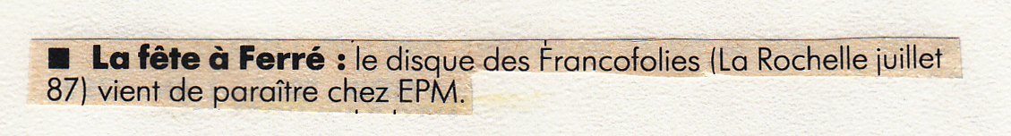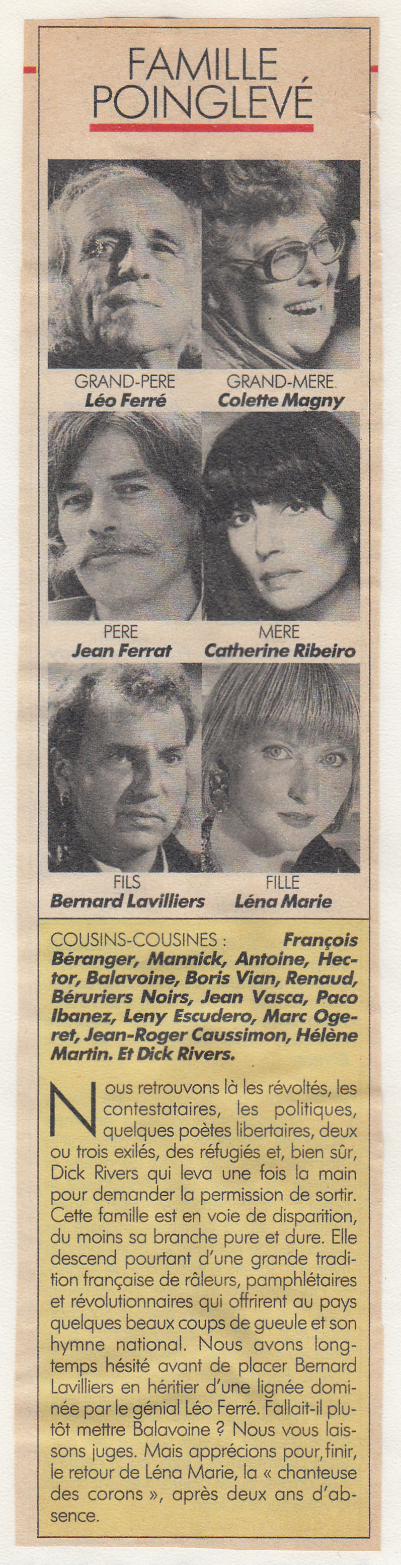 • Avec Léo Ferré, Jean-Michel Boris, Jean-Claude Casadesus, Jean-Pierre Chabrol, Jacques Attali, Francis Claude, Maxime Le Forestier, Anne-Marie Houdebine, Paco Ibanez, Sapho, Catherine Sauvage et Jean Vasca