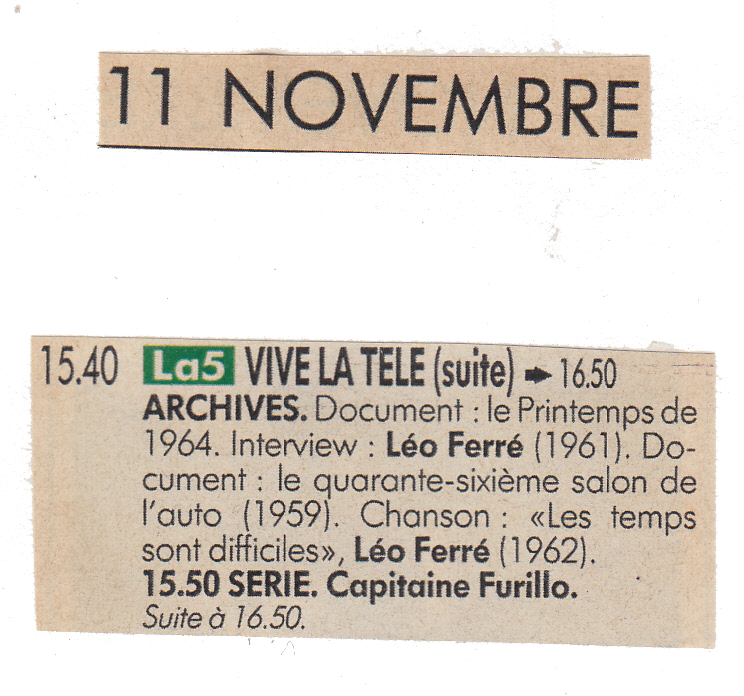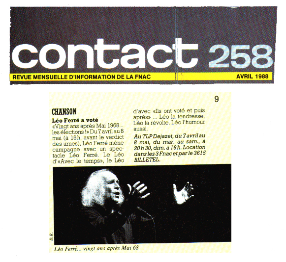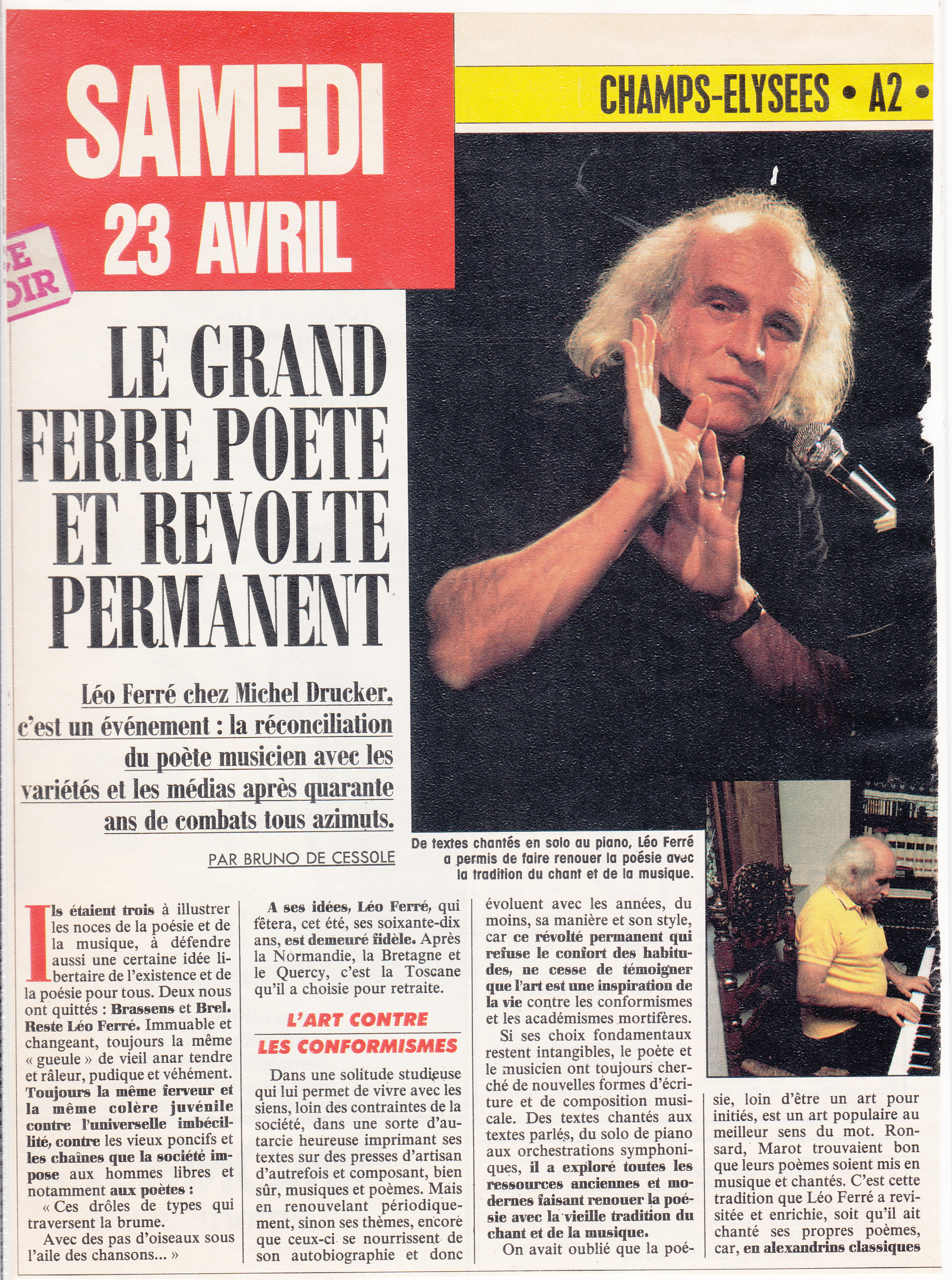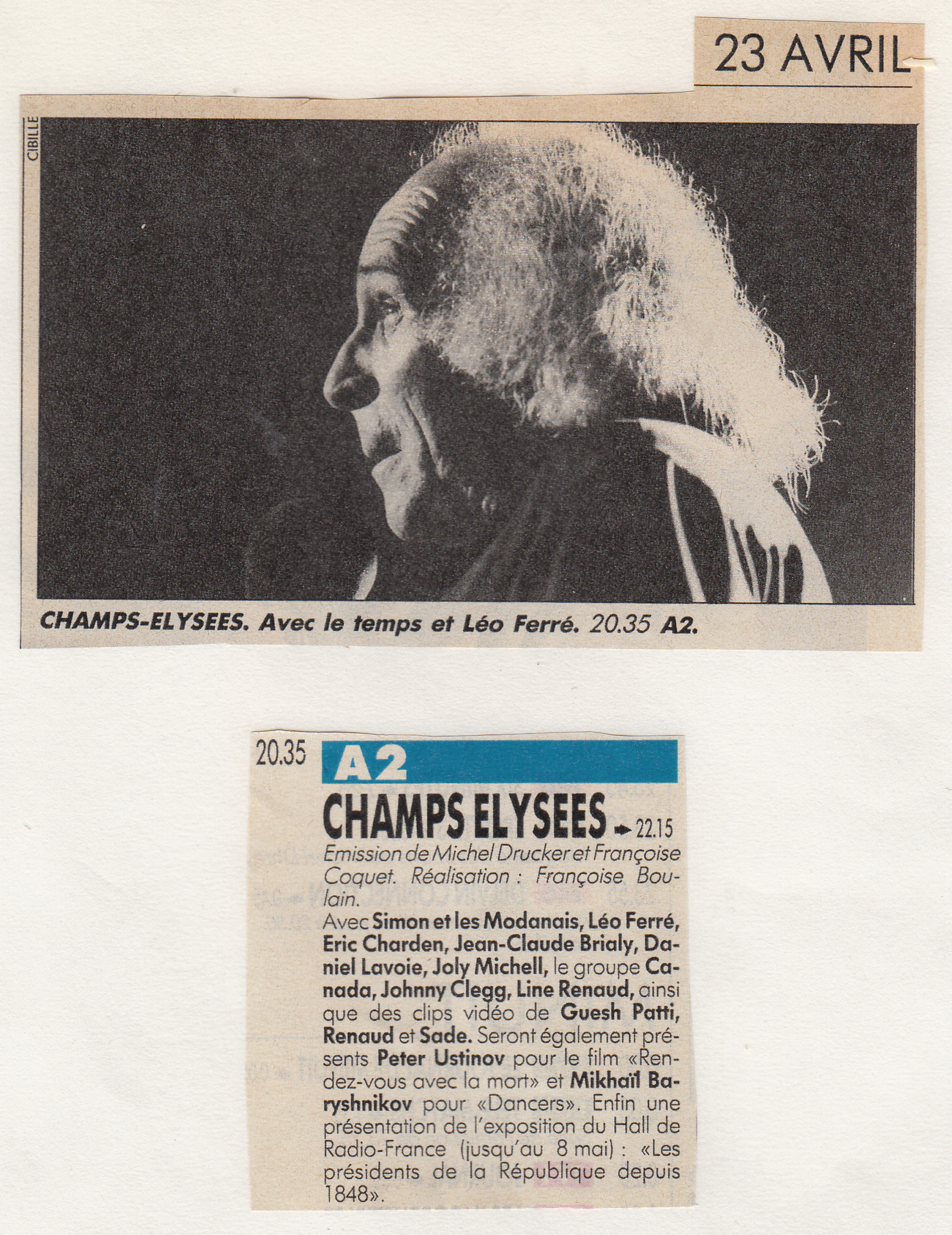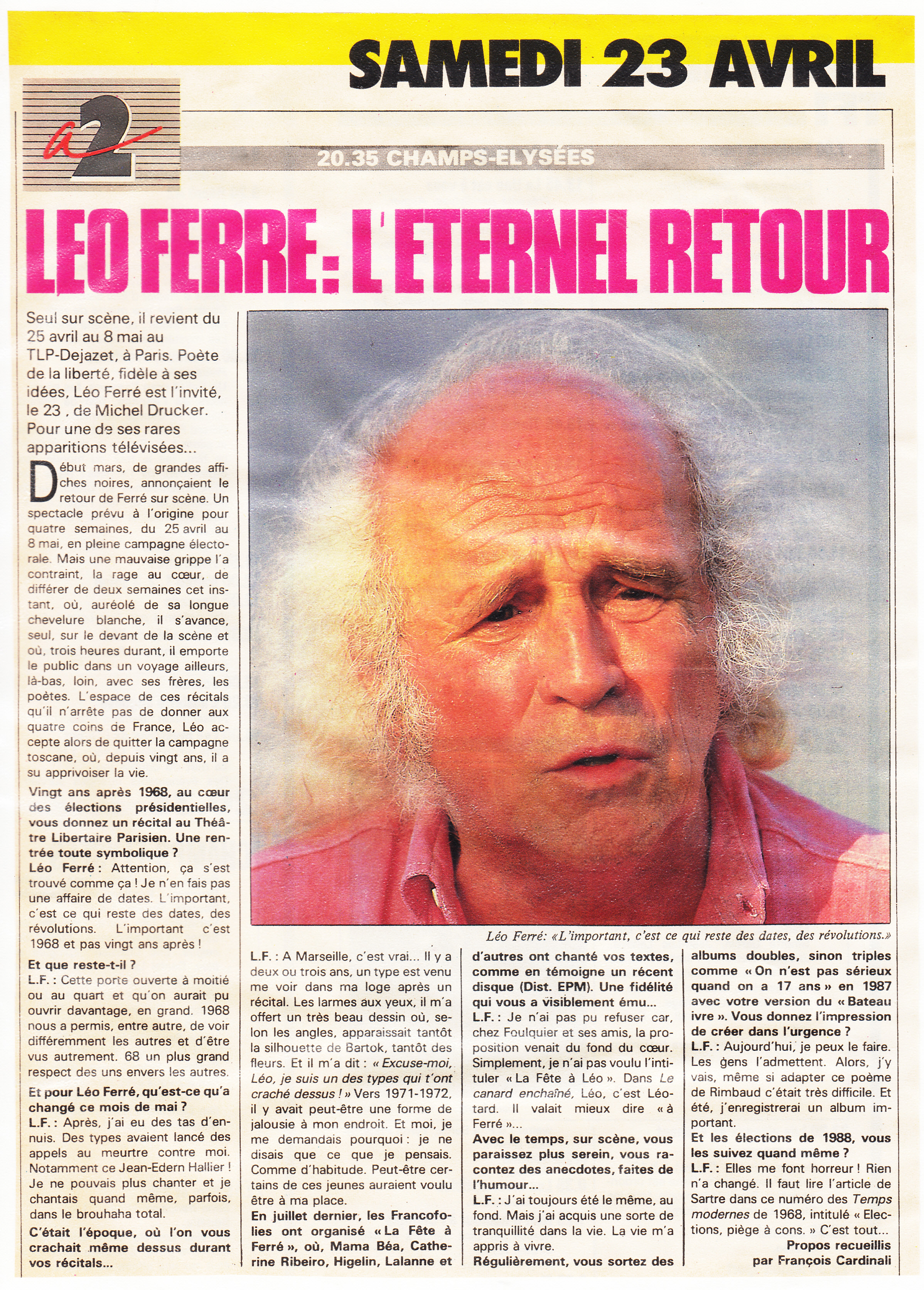 1988 |"Avec le temps... une nuit avec Léo Ferré", le 1er janvier 1988, Léo Ferré retraçait avec ses amis et en chansons sa vie et son oeuvre. Une émission exceptionnelle qui permettait de s'immerger dans l'univers du poète durant six heures avec un long entretien et des extraits d'archives d'actualités.