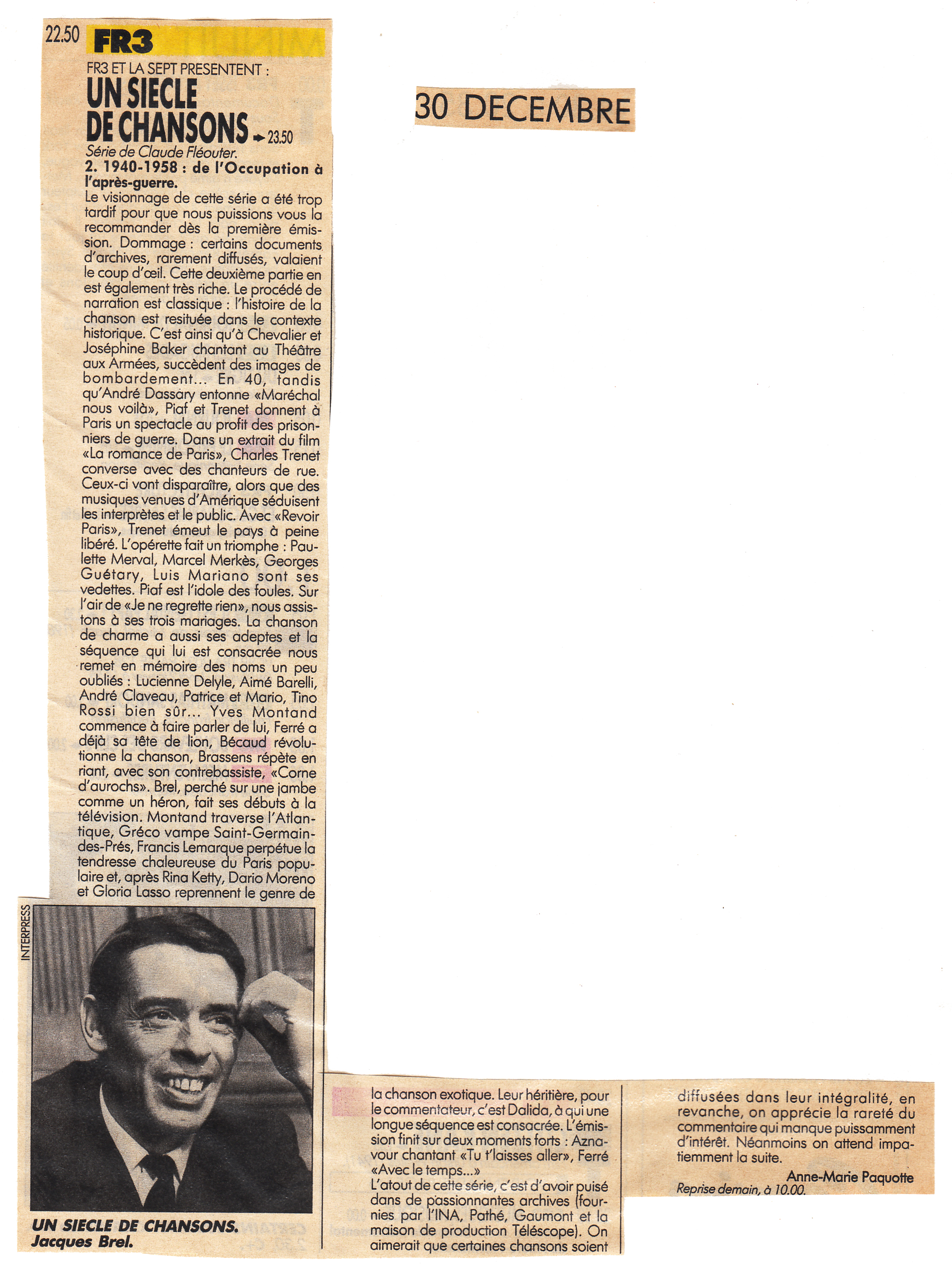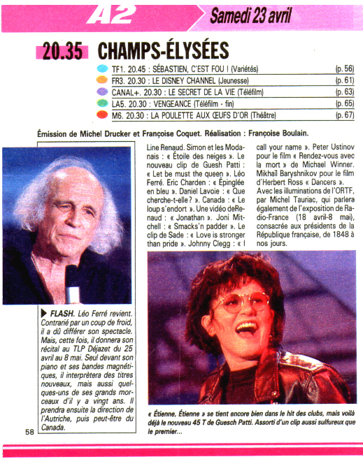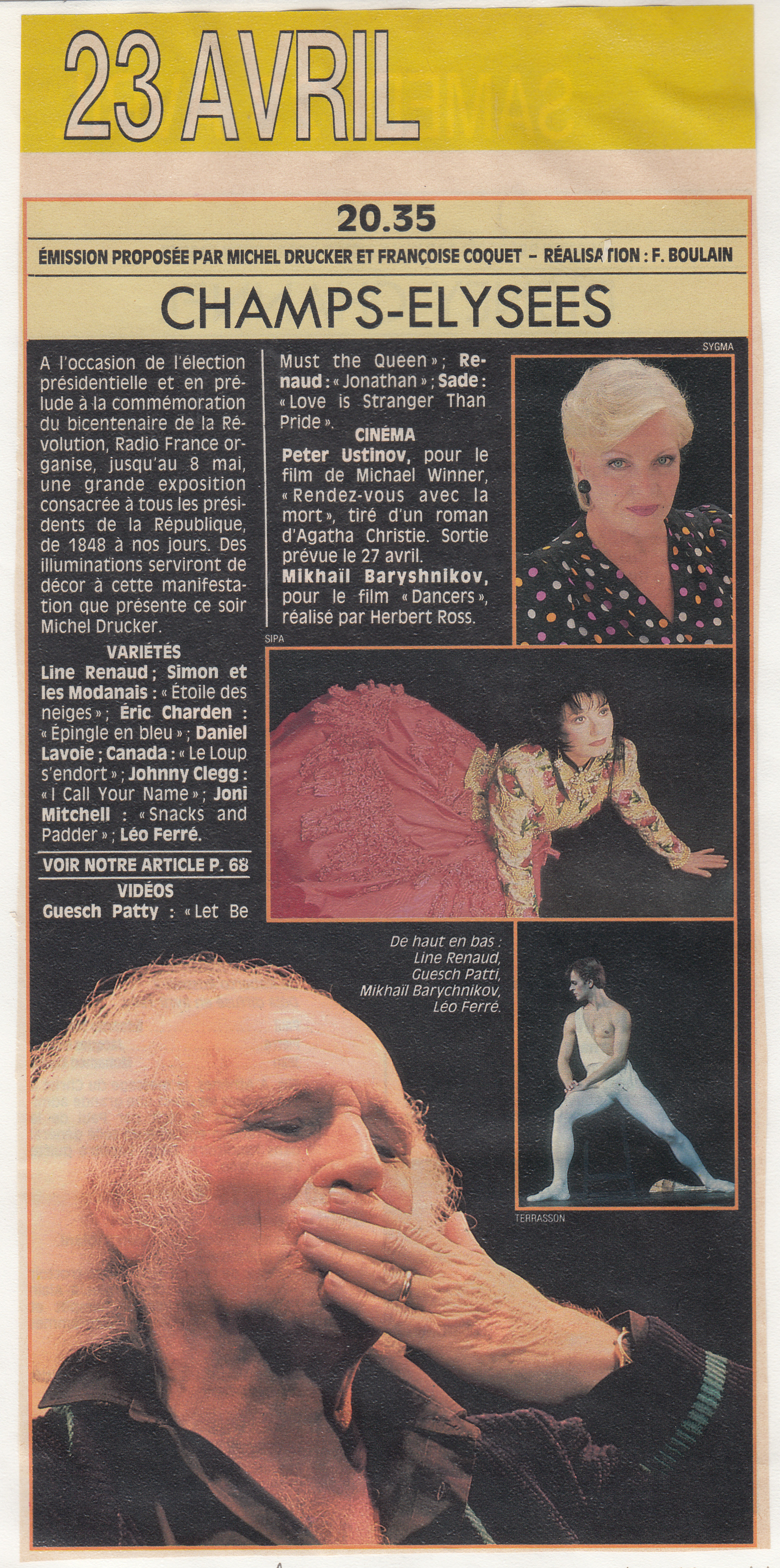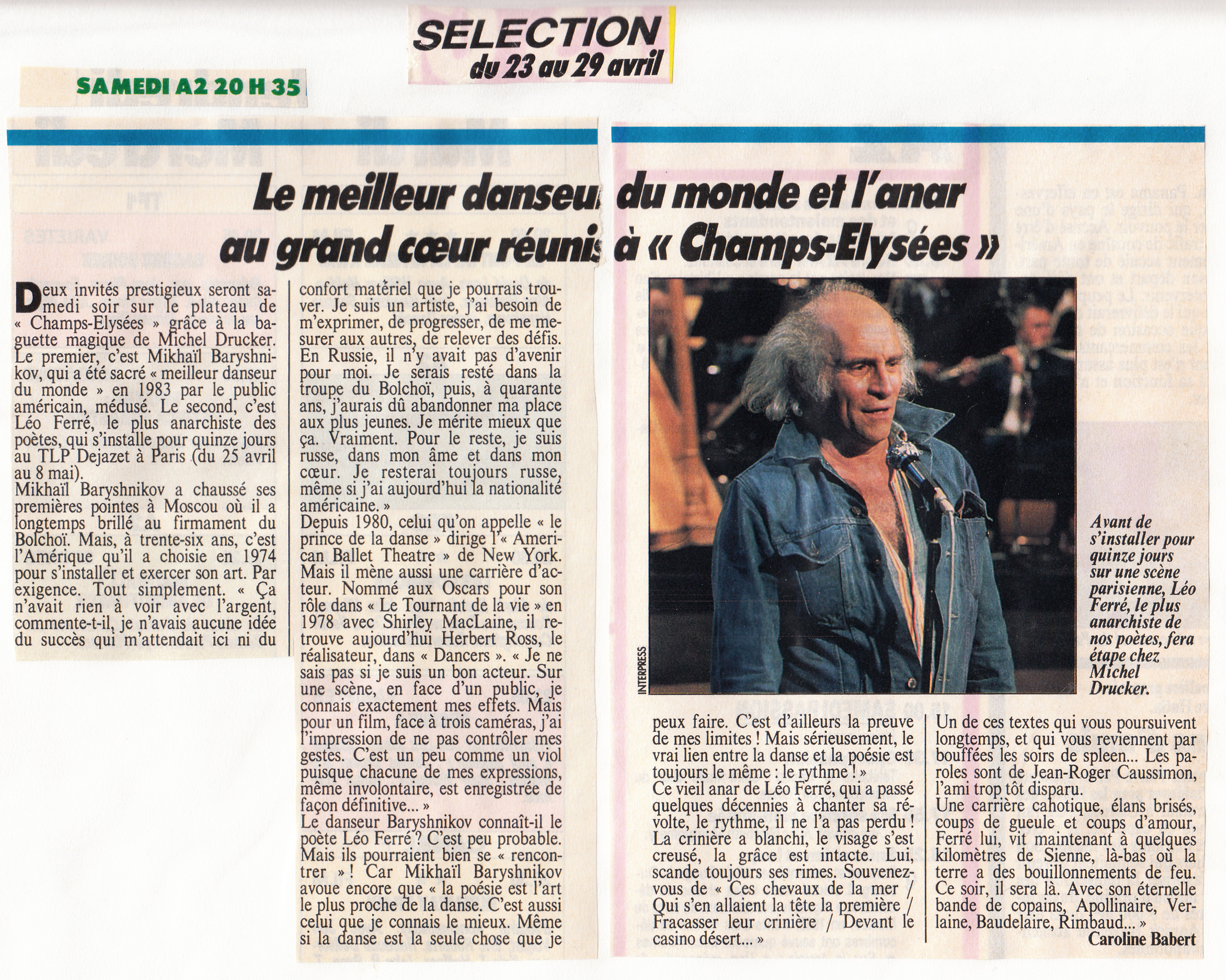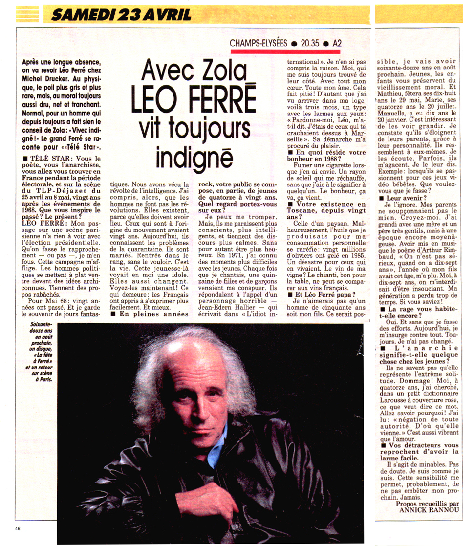 1988 |"Avec le temps... une nuit avec Léo Ferré", le 1er janvier 1988, Léo Ferré retraçait avec ses amis et en chansons sa vie et son oeuvre. Une émission exceptionnelle qui permettait de s'immerger dans l'univers du poète durant six heures avec un long entretien et des extraits d'archives d'actualités.