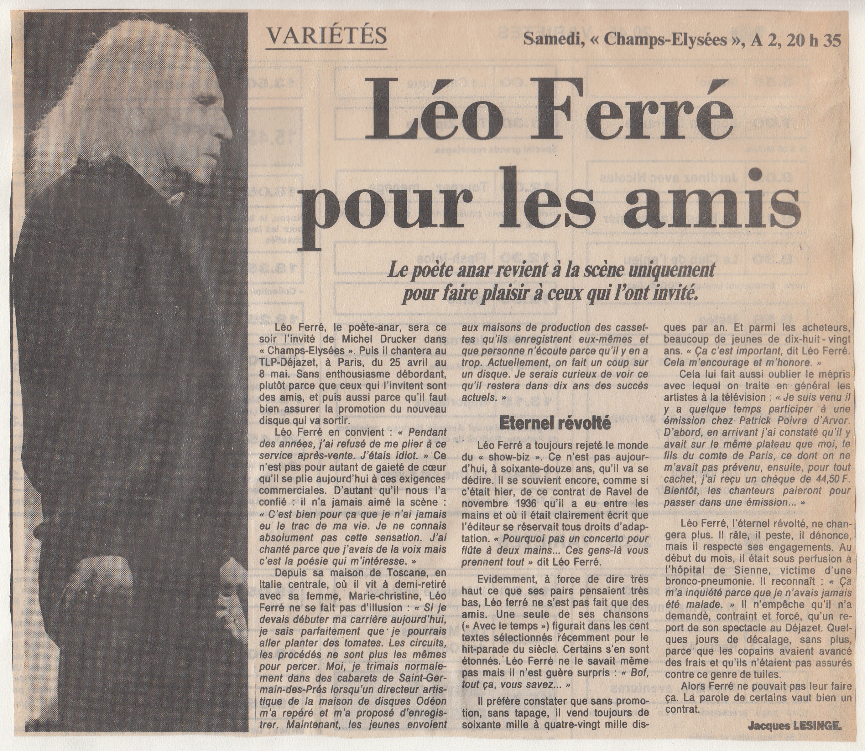 "Avec le temps... Spécial Léo Ferré", dans cette émission l'occasion est donnée à Léo Ferré de retracer, avec ses amis (peintres, poètes, philosophes, hommes politiques, musiciens,...) une époque et une oeuvre, avec la participation de Maxime Le Forestier, Jean-Pierre Chabrol, Jacques Attali, Jean-Claude Casadesus, Jean Vasca, Francis Claude, Anne-Marie Houdebine, Paco Ibanez. Léo Ferré donnait un très long entretien entrecoupé d'archives d'actualités sur les anarchistes, la guerre d'Espagne, les congés payés et Léon Blum, etc.