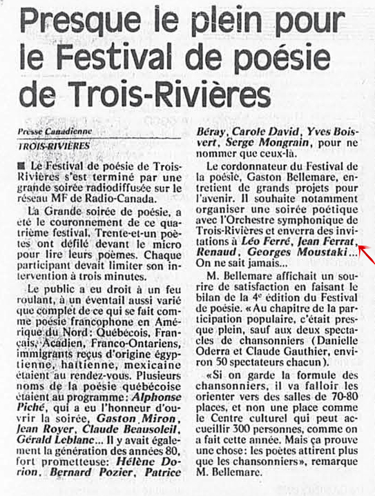 • Festival de poésie de Trois-Rivières en 1989 - Gaston Bellemare rêve à l'OSTR, Ferré et Renaud
