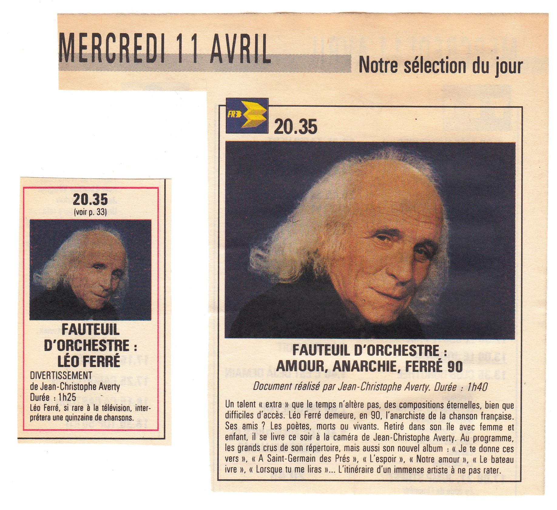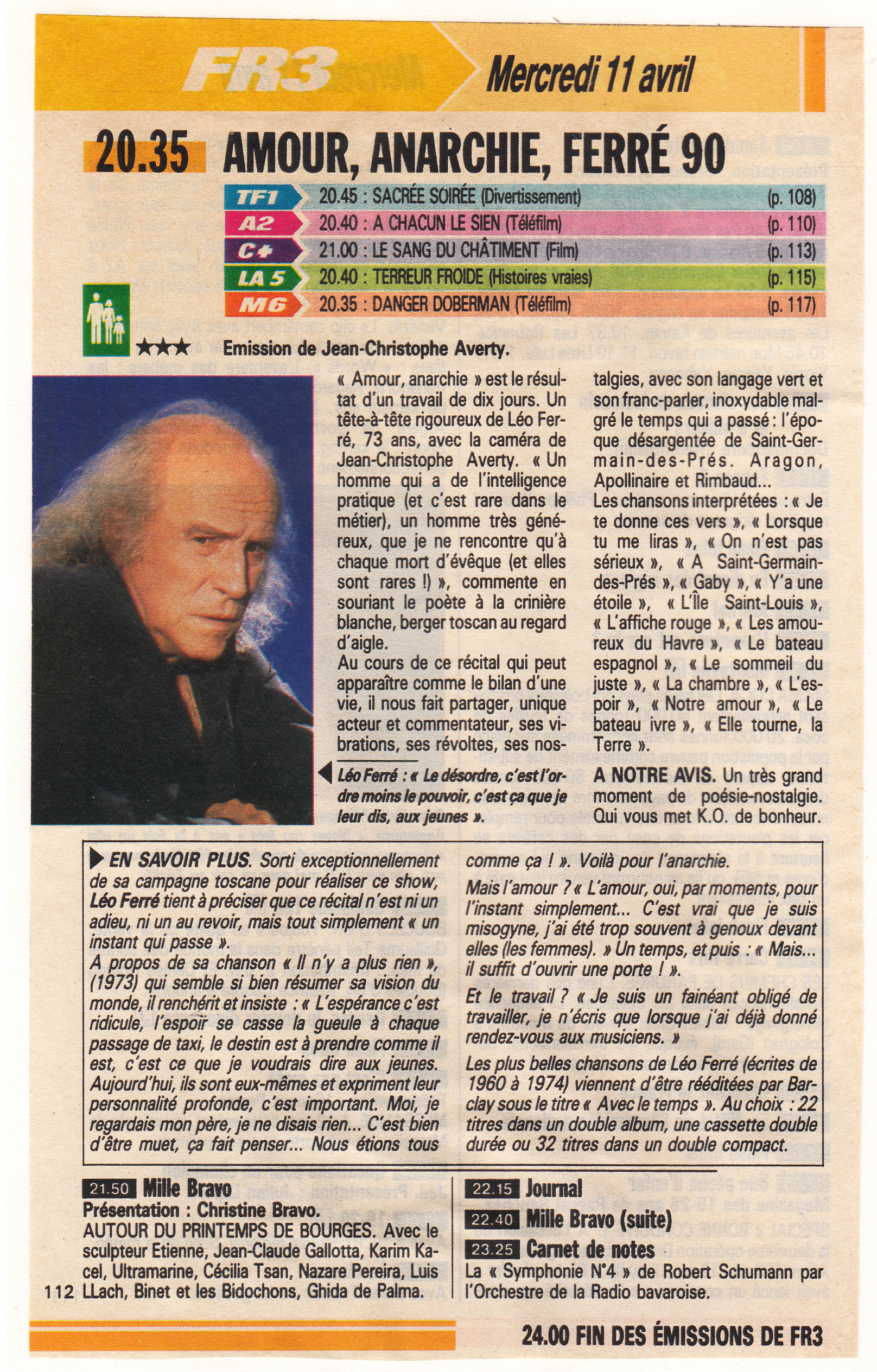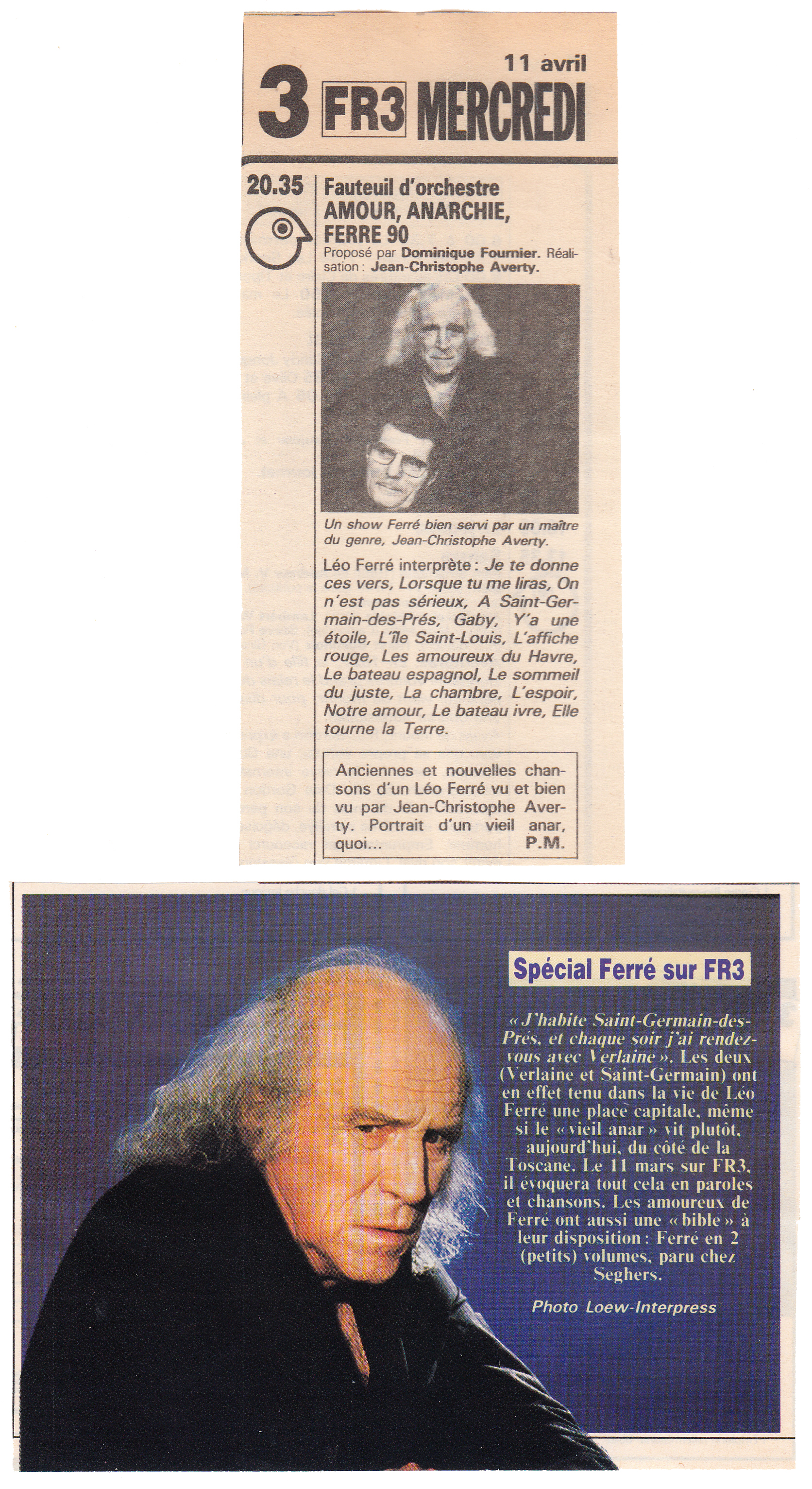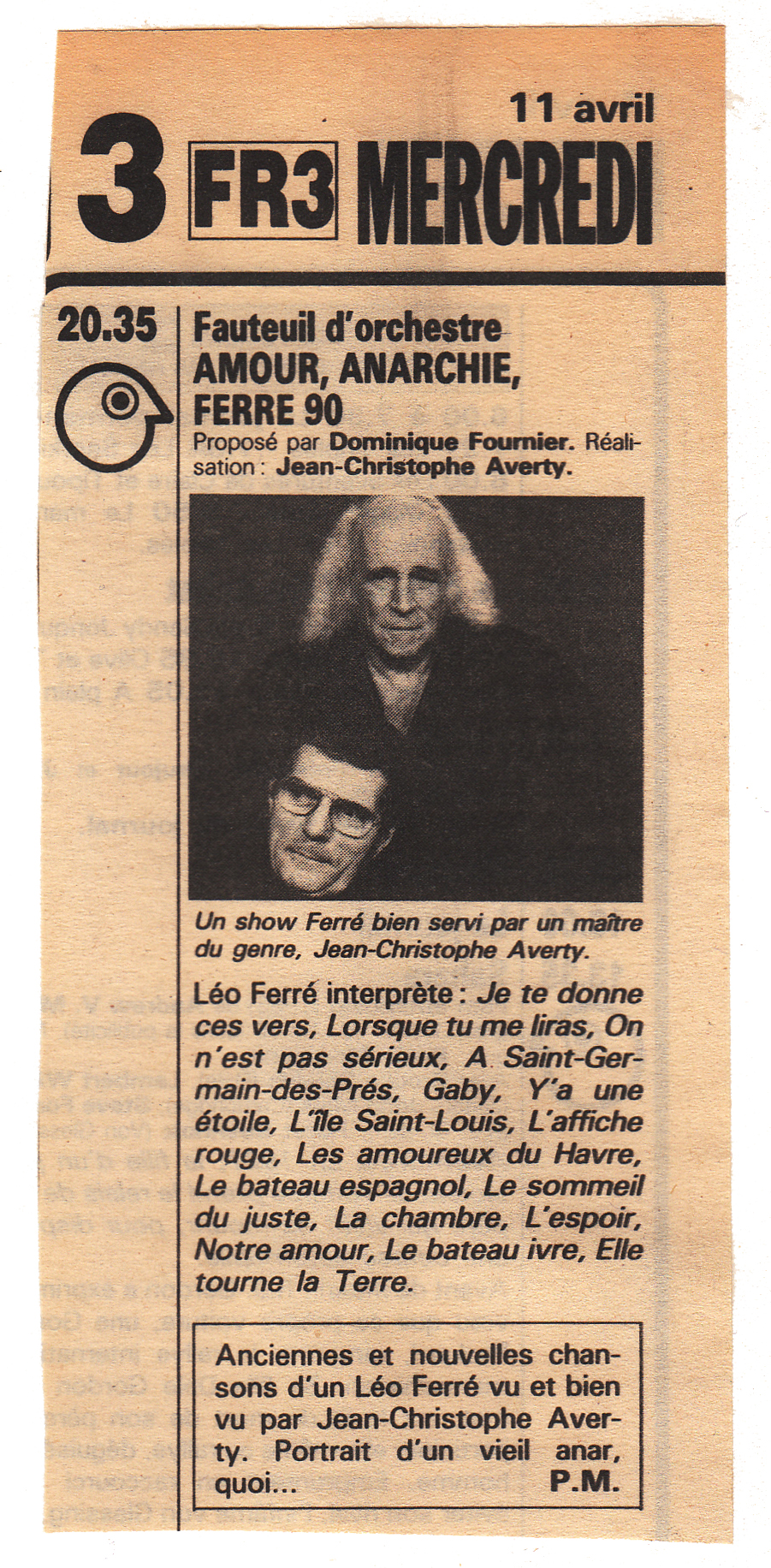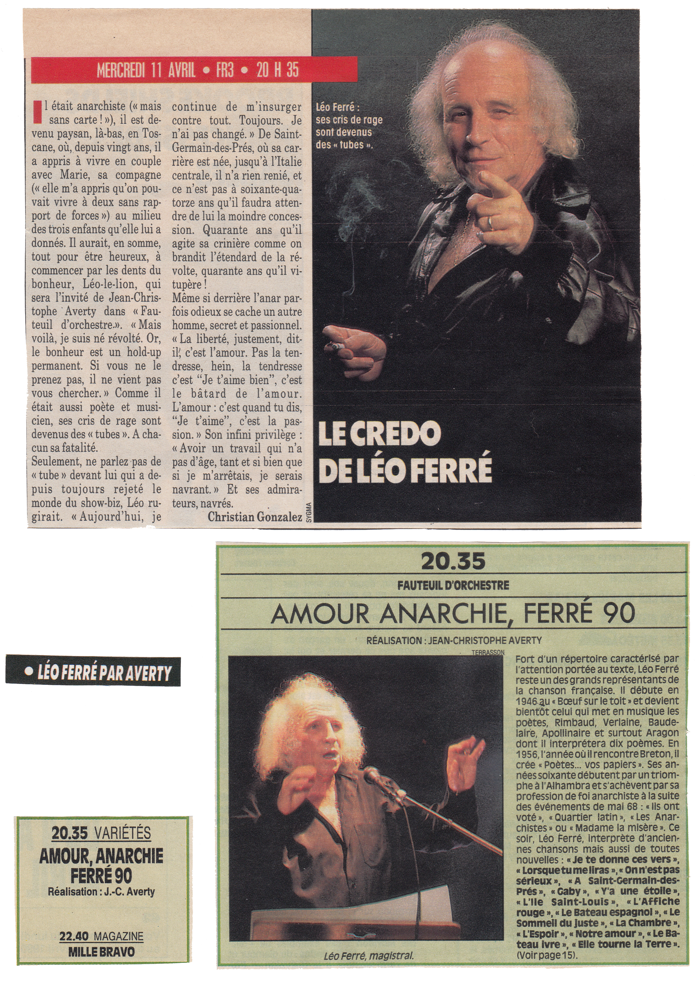 • MERCREDI 11 AVRIL AMOUR, ANARCHIE, LÉO FERRÉ 90 : FR 3, 20 h 35