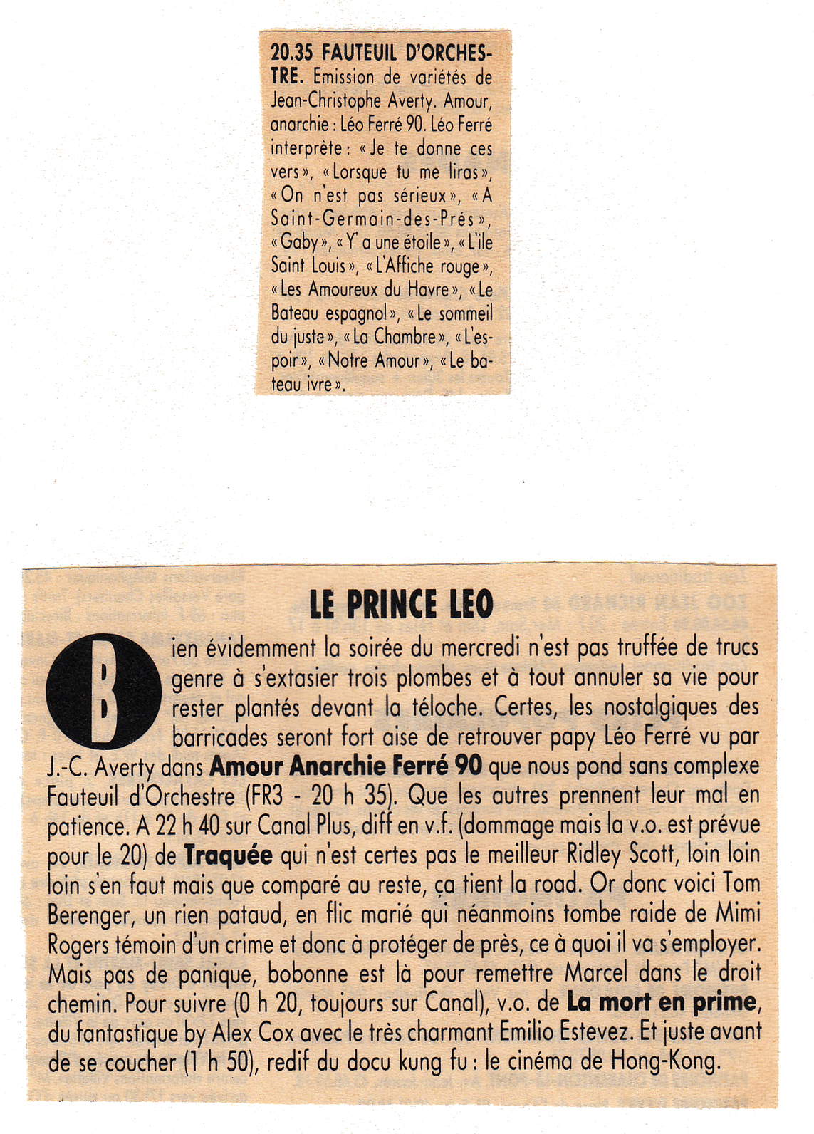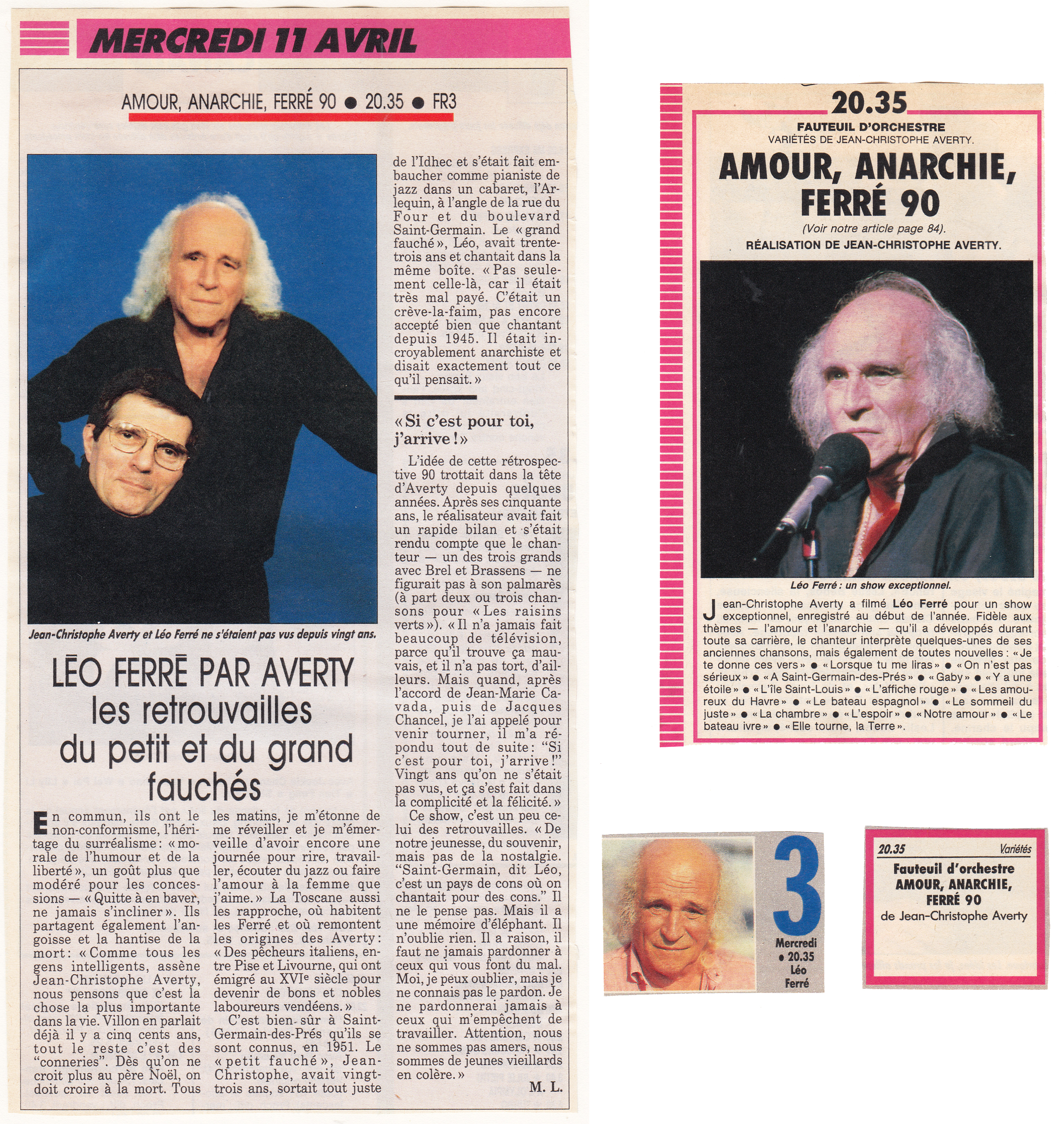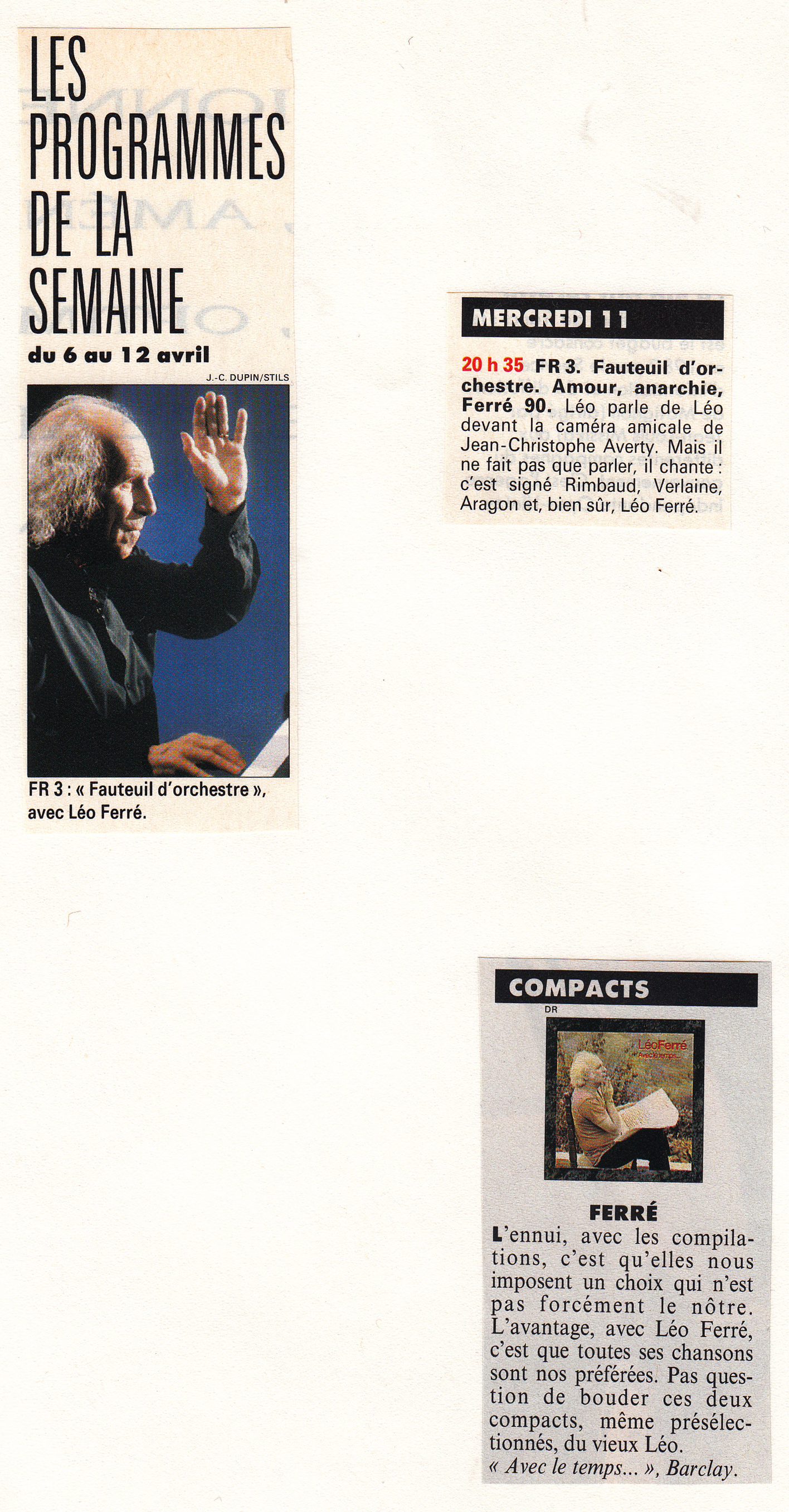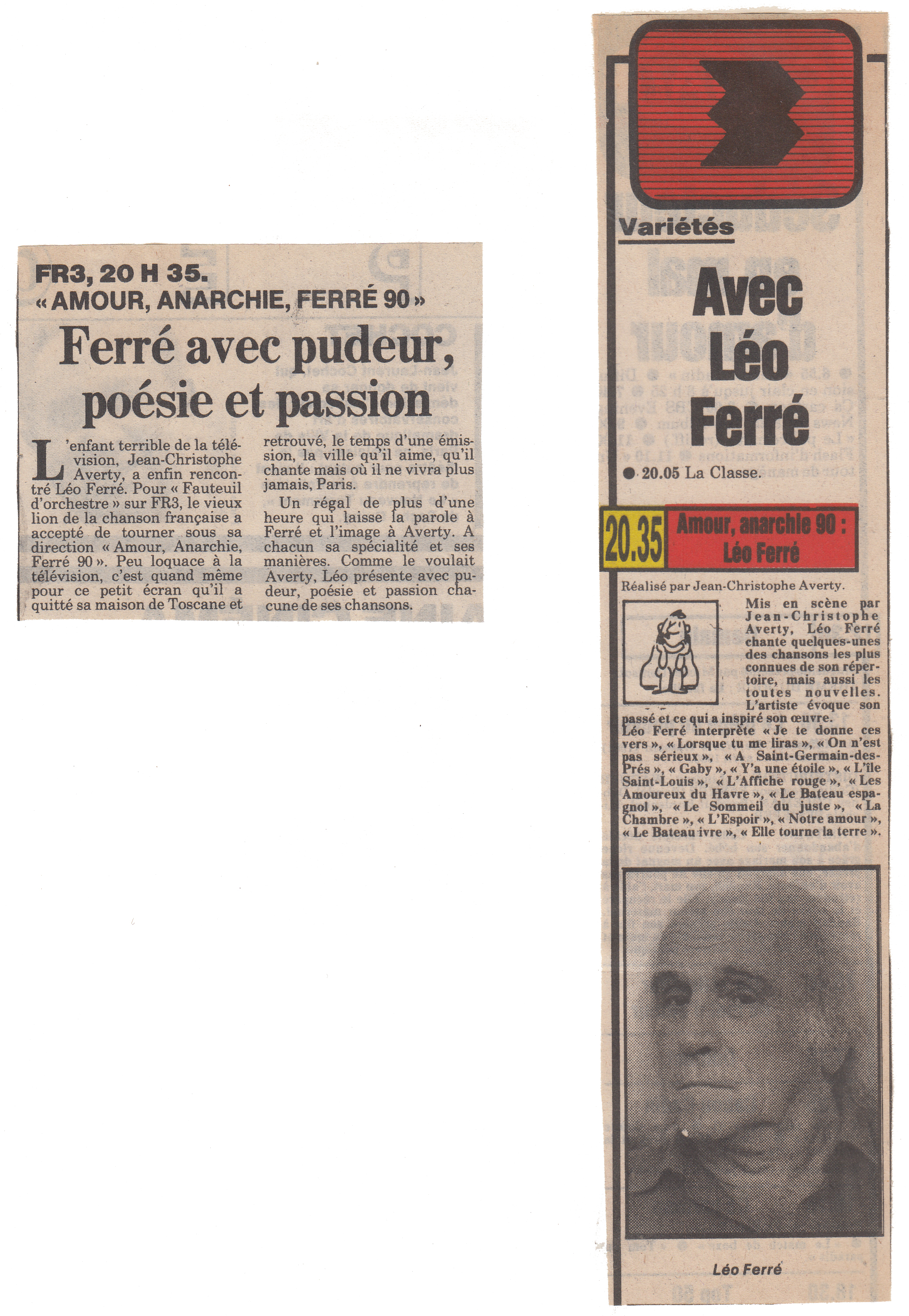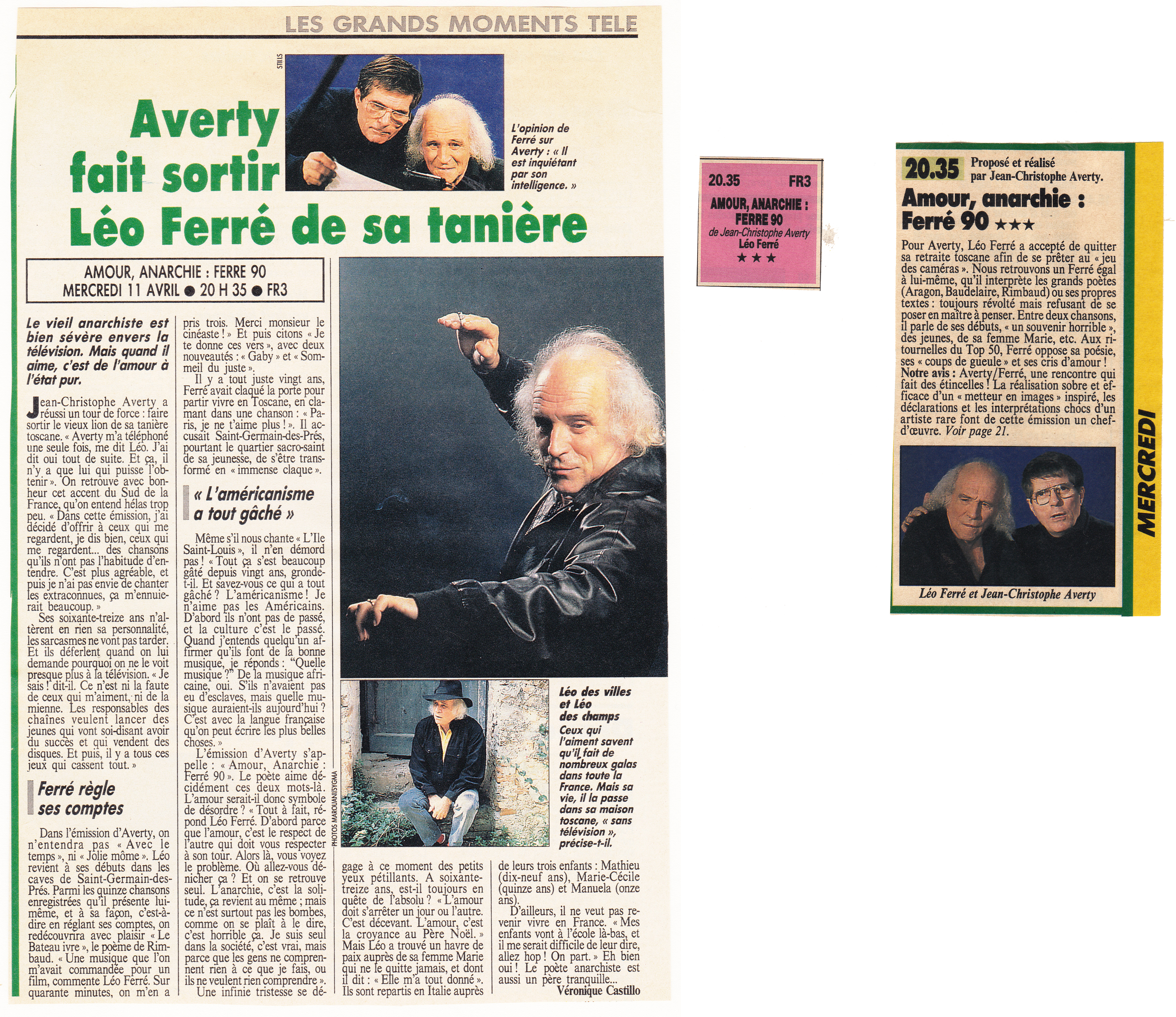 • MERCREDI 11 AVRIL AMOUR, ANARCHIE, LÉO FERRÉ 90 : FR 3, 20 h 35